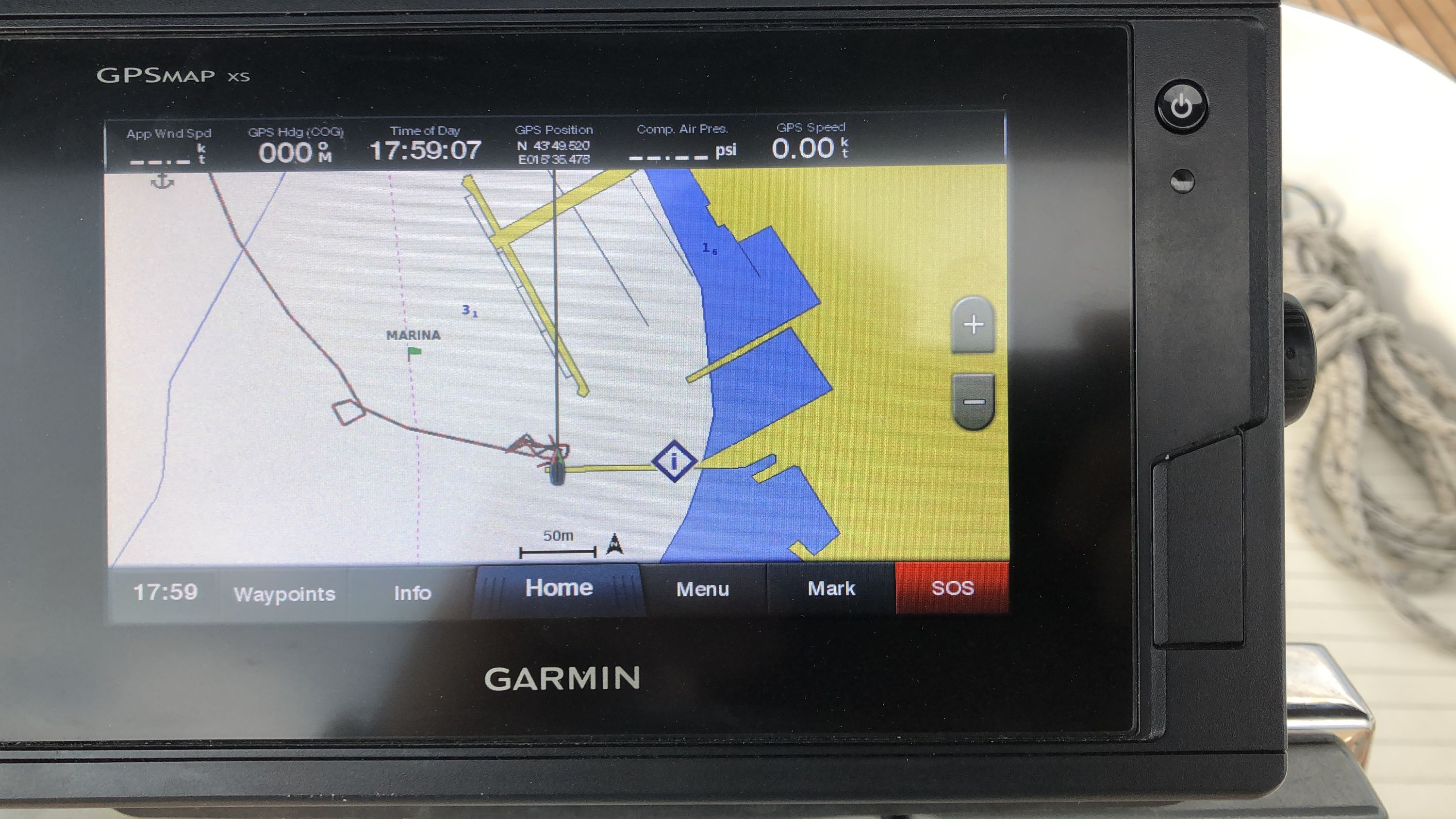 | Navigation | Barometer, Fernglas, GPS mit Kartenplotter im Cockpit, GPS mit Kartenplotter im Salon, Hafenhandbücher, Navigationsbesteck, Seekarten, Tridata (Log, Echolot, Windm.) |