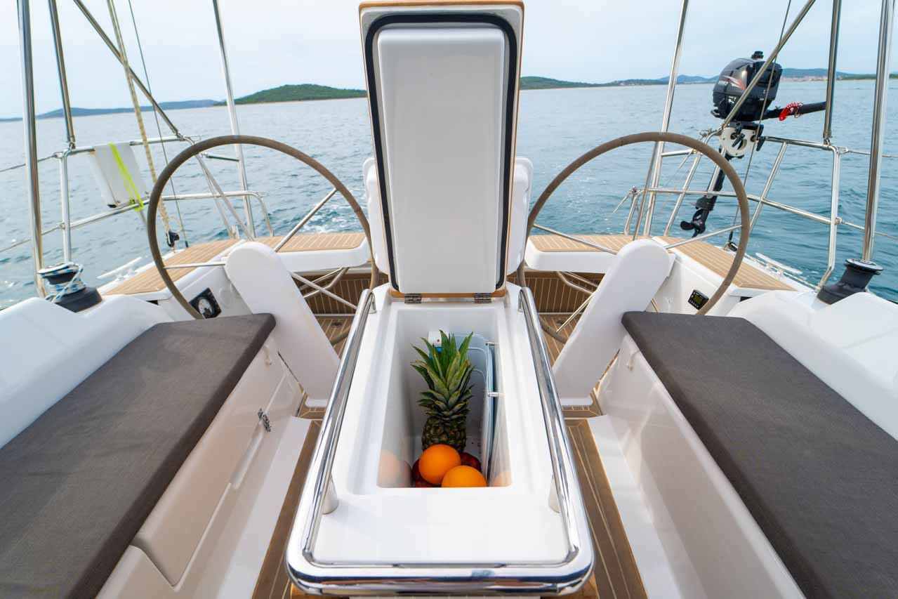 | Outside | 220 V-Landanschluss, Anker mit Kette, Ankerwinsch, Biminitop, Bootshaken, Cockpitdusche, Cockpitlautsprecher, Cockpitpolster, Cockpittisch, Deckpolster, elektr. Ankerwinsch, Fender, Fernsteuerung für elektr. Ankerwinsch, Festmacherleinen, Gangway, Kugelfender, Kunststoff-Eimer (Pütz), Solaranlage, Sprayhood, Teak im Cockpit, Wantenschneider, Wasserschlauch |