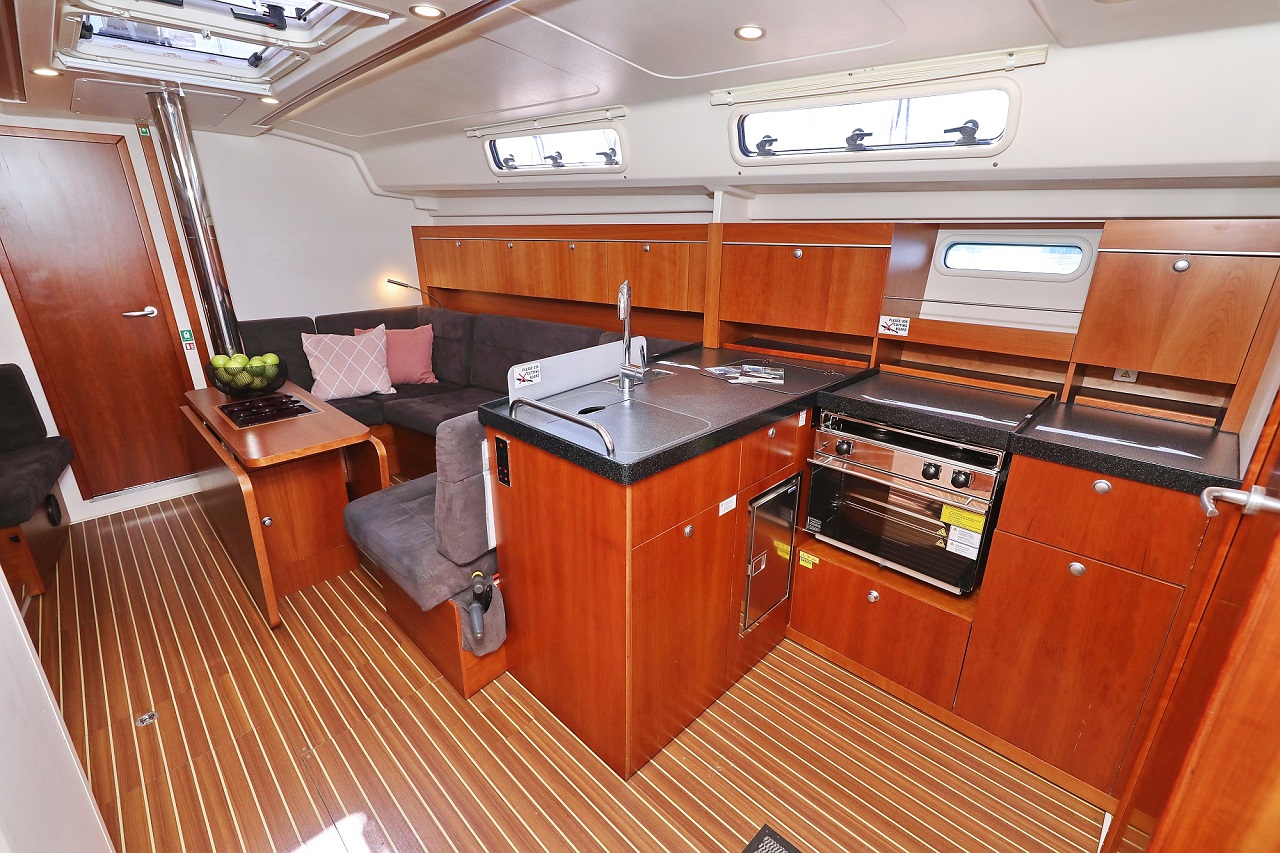 | Outside | Badeplattform, Biminitop, Cockpitdusche, Cockpitlautsprecher, Cockpittisch, elektr. Ankerwinsch, Sprayhood, Teak im Cockpit, Teakdeck |