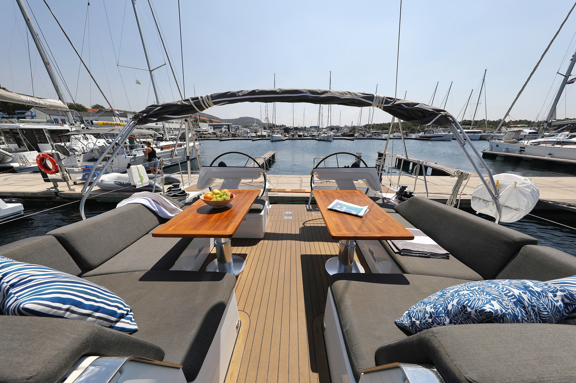 | Outside | Badeplattform, Biminitop, Cockpitdusche, Cockpitlautsprecher, Cockpitpolster, Cockpittisch, Sprayhood, Teak im Cockpit |