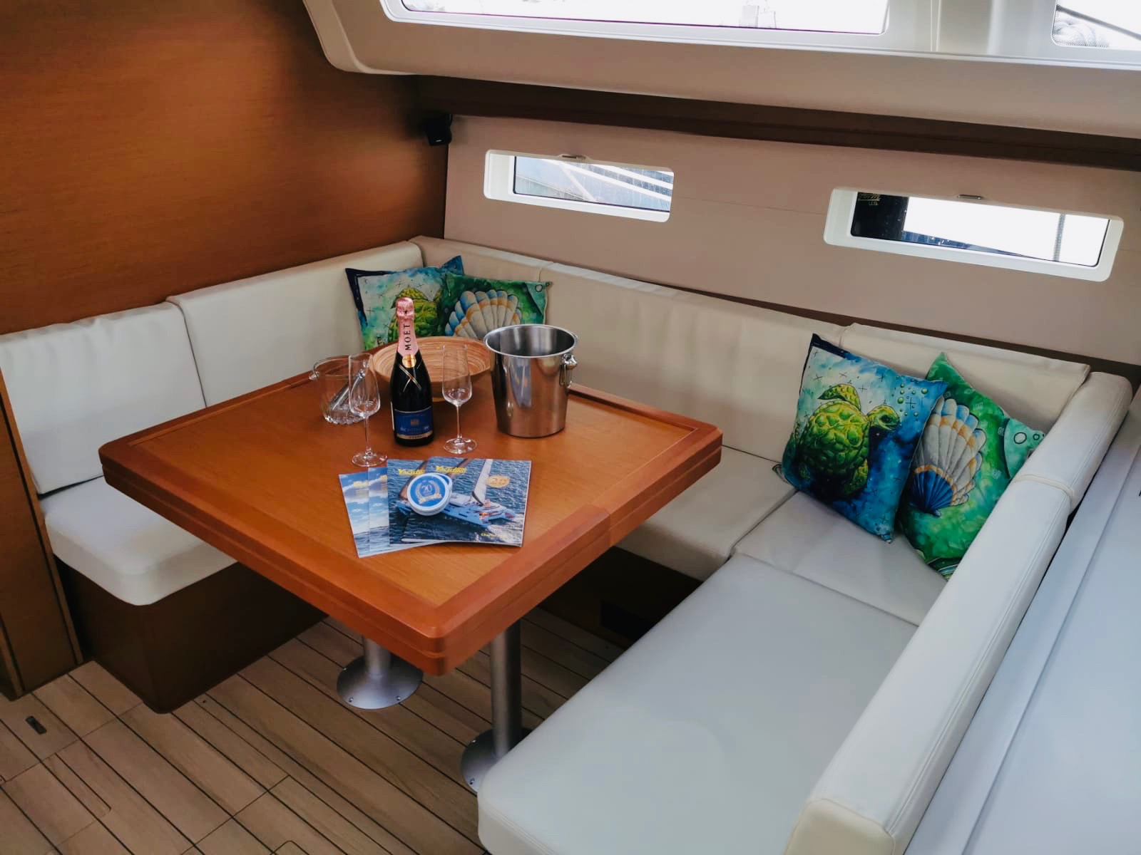 | Outside | Außendusche, Biminitop, Cockpitpolster, elektr. Ankerwinsch, elektr. Winsch, Sprayhood, Teakdeck, Windex |