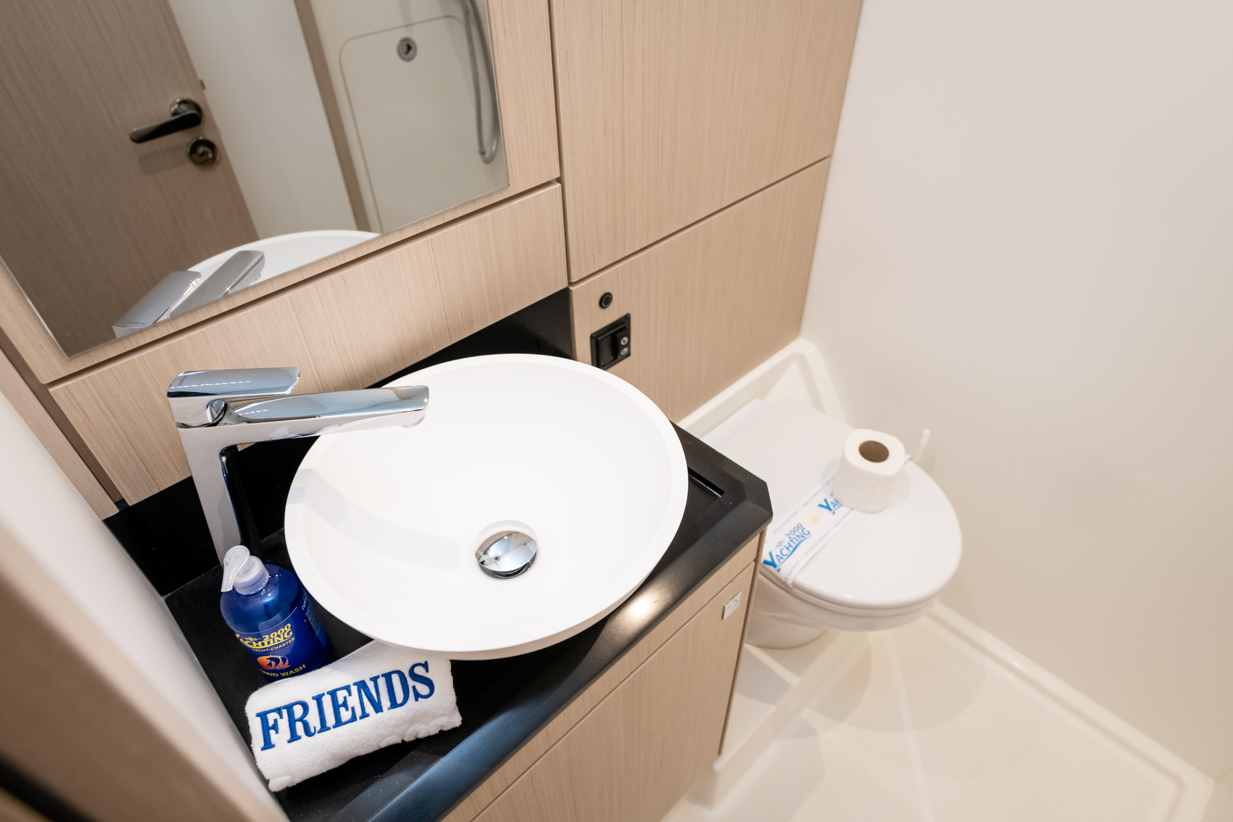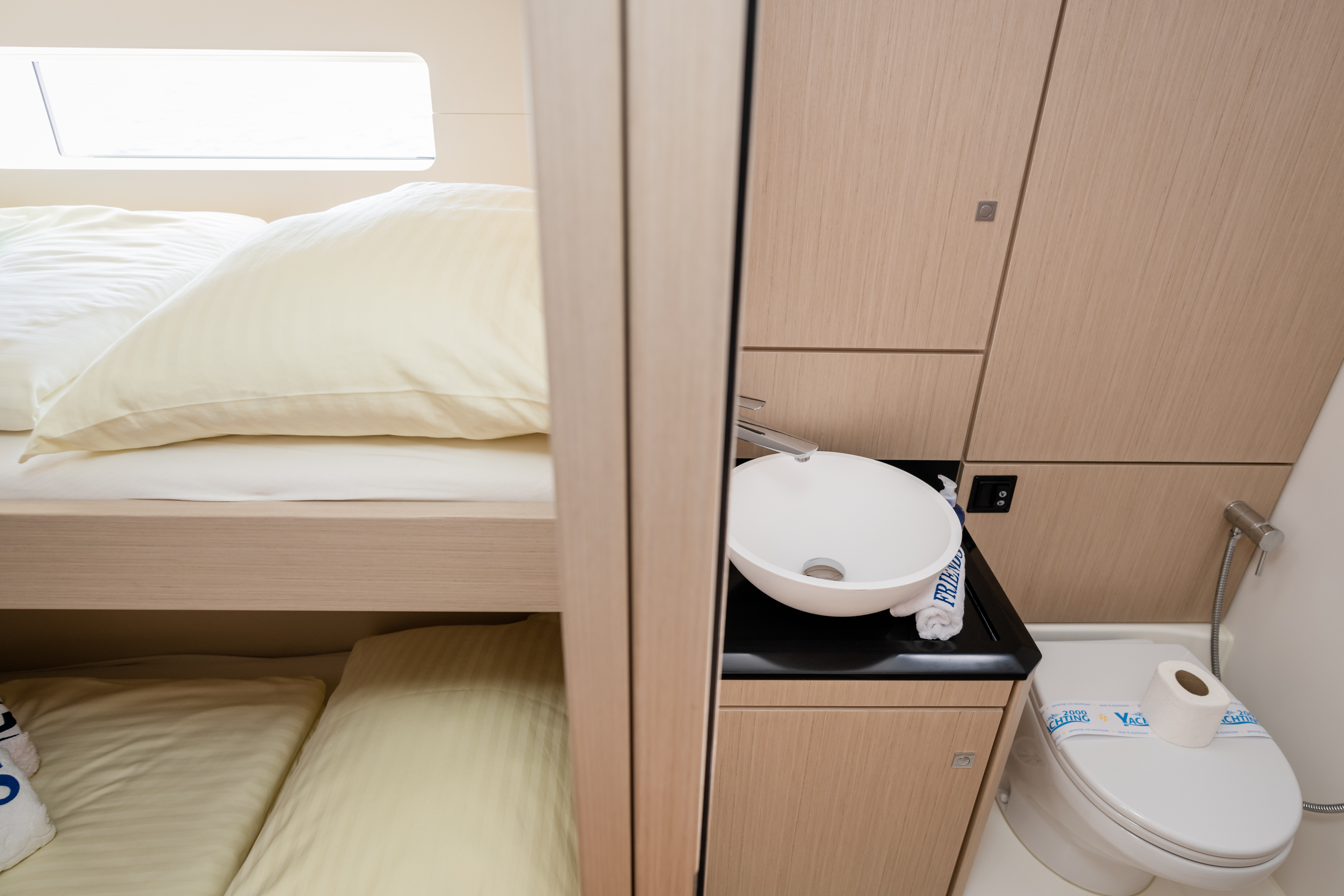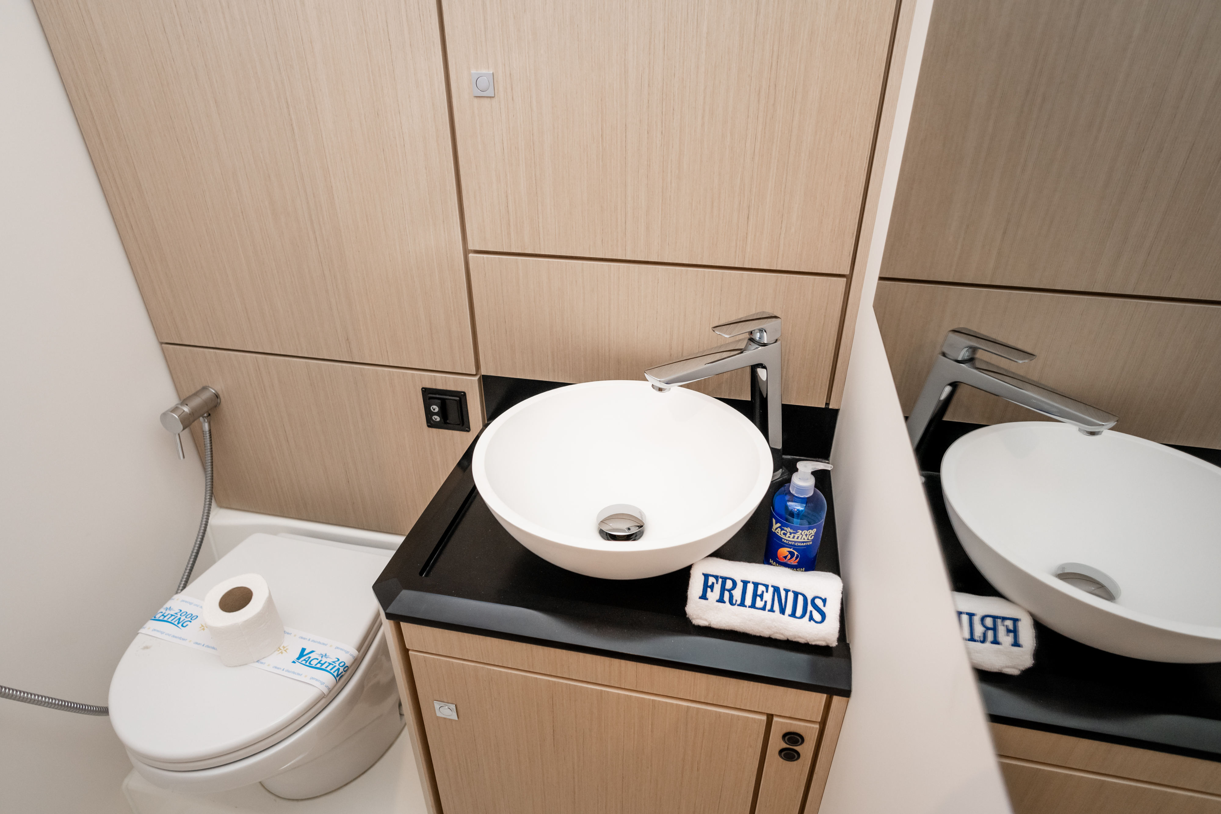 | Inside | Eiswürfelmaschine, Generator, Geschirrspüler, Inverter 12V/220V, Kaffeemaschine, Klimaanlage (Landstrom), Kühlschrank, Mikrowelle, Pantryausstattung, Radio mit Bluetooth, TV, Warmwasser, Watermaker, WC (elektr.) |
