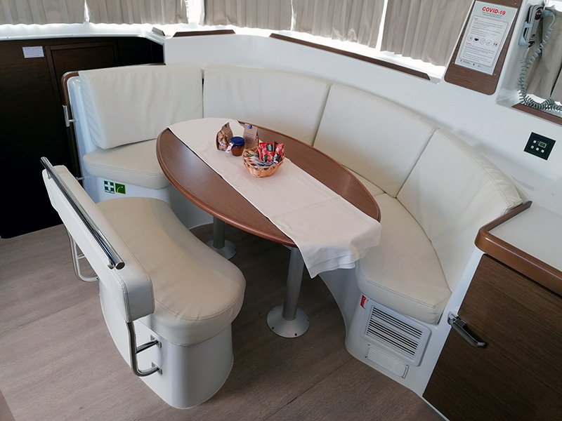 | Inside | Borduhr, Fäkalientank, Generator, Heizung, Klimaanlage, Kühlschrank, Luftpumpe für Beiboot, Radio mit USB, TV + DVD, Warmwasser |