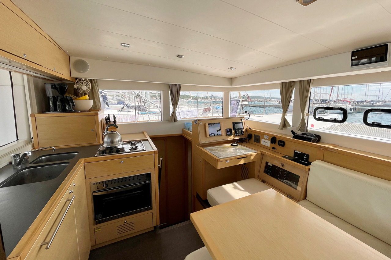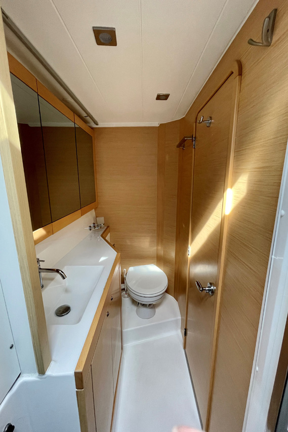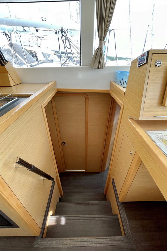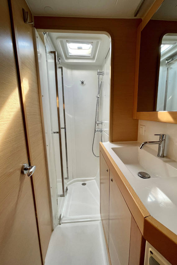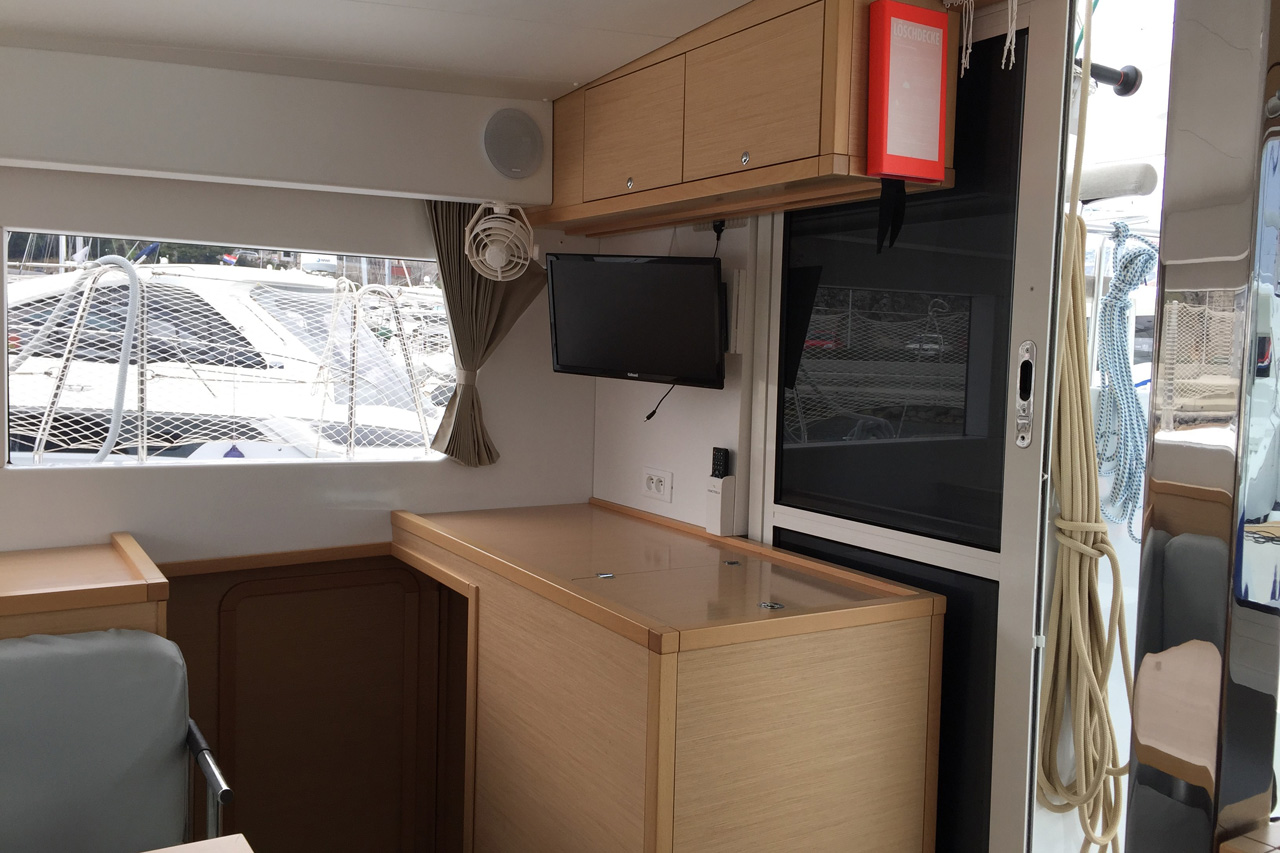| Inside | 2. Kühlschrank, Borduhr, Heizung, Inverter 12V/220V, Kühlschrank, Ladegerät, Luftpumpe für Beiboot, Pantryausstattung, Radio mit CD/USB/MP3/Aux-In/Bluetooth, Salontisch absenkbar, USB Steckdosen in den Kabinen, Ventilatoren in Kabinen, Warmwasser, WC (elektr.) |