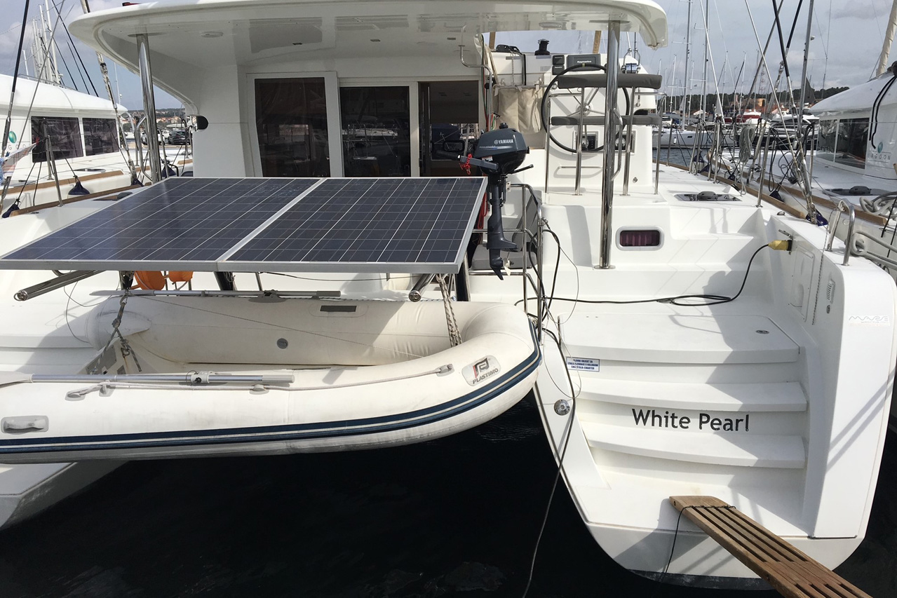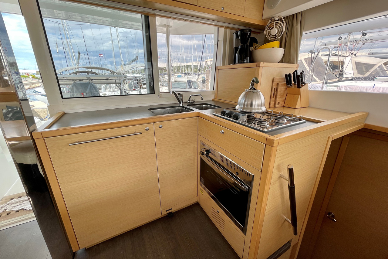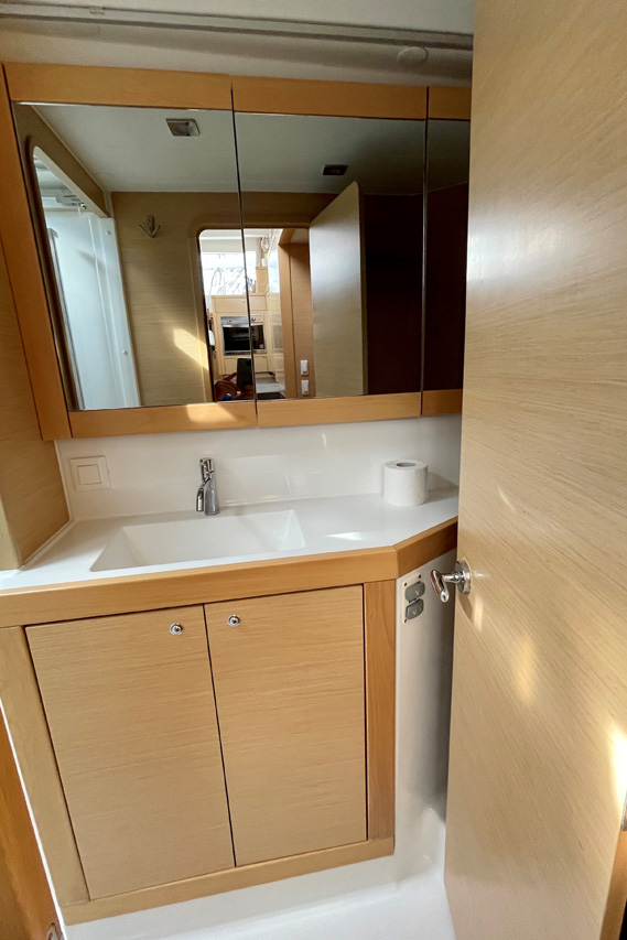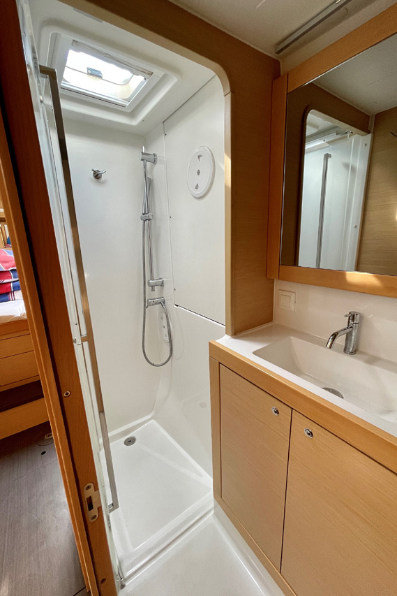 | Inside | 2. Kühlschrank, Borduhr, Heizung, Inverter 12V/220V, Kühlschrank, Ladegerät, Luftpumpe für Beiboot, Pantryausstattung, Radio mit CD/USB/MP3/Aux-In/Bluetooth, Salontisch absenkbar, USB Steckdosen in den Kabinen, Ventilatoren in Kabinen, Warmwasser, WC (elektr.) |
