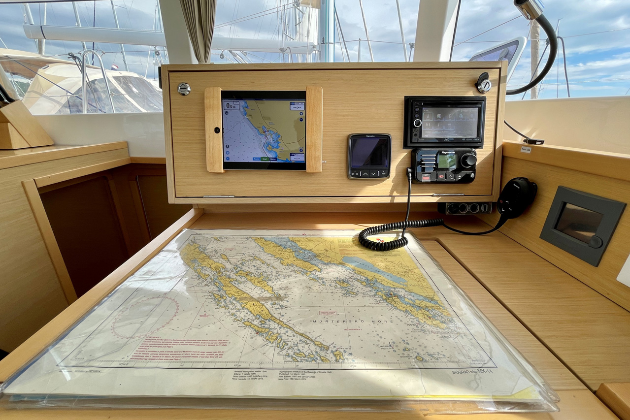 | Navigation | Barometer, Fernglas, GPS mit Kartenplotter im Cockpit, Handpeilkompass, Navigationsbesteck, Seekarten, Tablet-PC am Kartentisch, Tridata (Log, Echolot, Windm.) |
