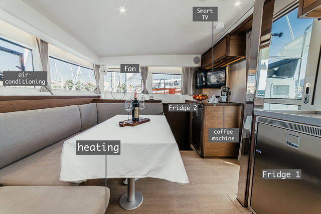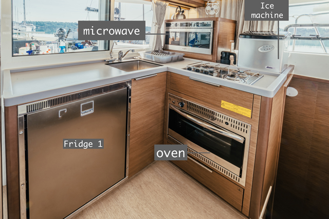 | Inside | 2. Kühlschrank, Eiswürfelmaschine, Espresso Maschine, Fäkalientank, Gasherd mit Backofen, Inverter 12V/220V, Klimaanlage (Landstrom), Kühlschrank, Mikrowelle, TV, WC (elektr.) |
