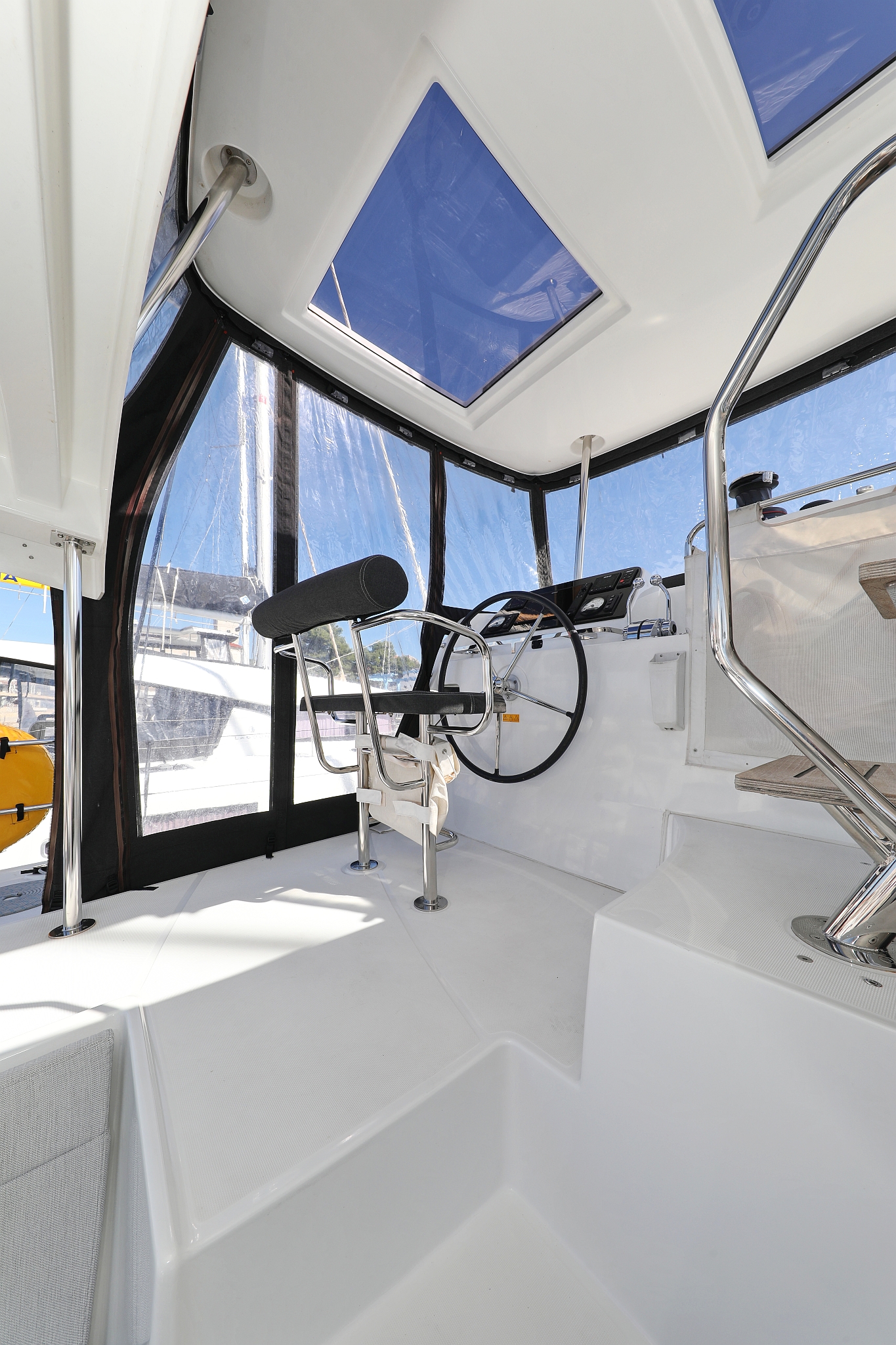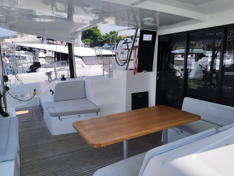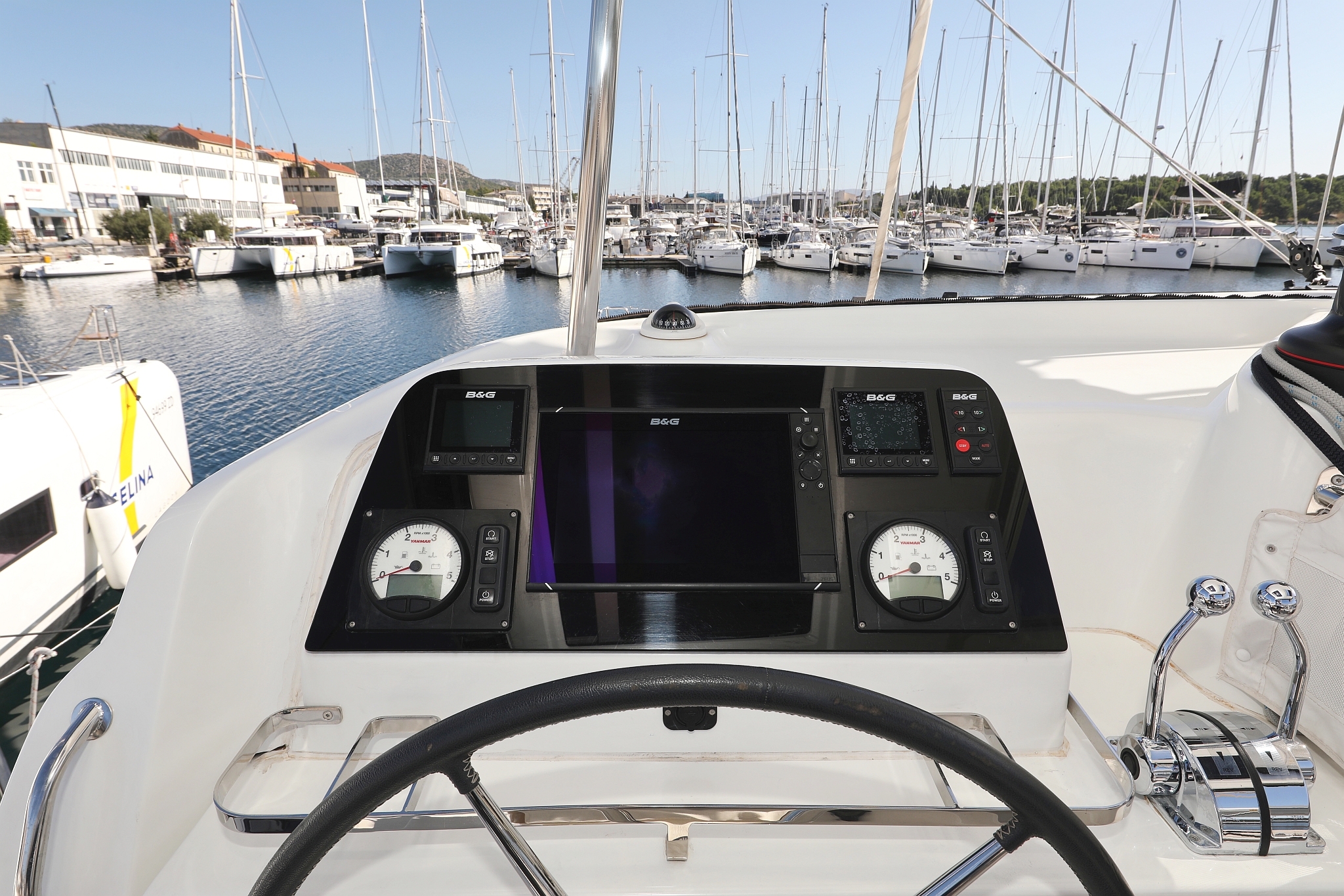 Outside 220 V-Landanschluss, Anker mit Kette, Bootshaken, Cockpitdusche, Cockpitlautsprecher, Cockpitpolster, Cockpittisch mit Eisbox, Deckpolster, elektr. Ankerwinsch, Faltsteuerrad, Fender, Festmacherleinen, Gangway, Hardtop, Solaranlage, Sonnendeck, Teak im Cockpit, Wasserschlauch, Winschen