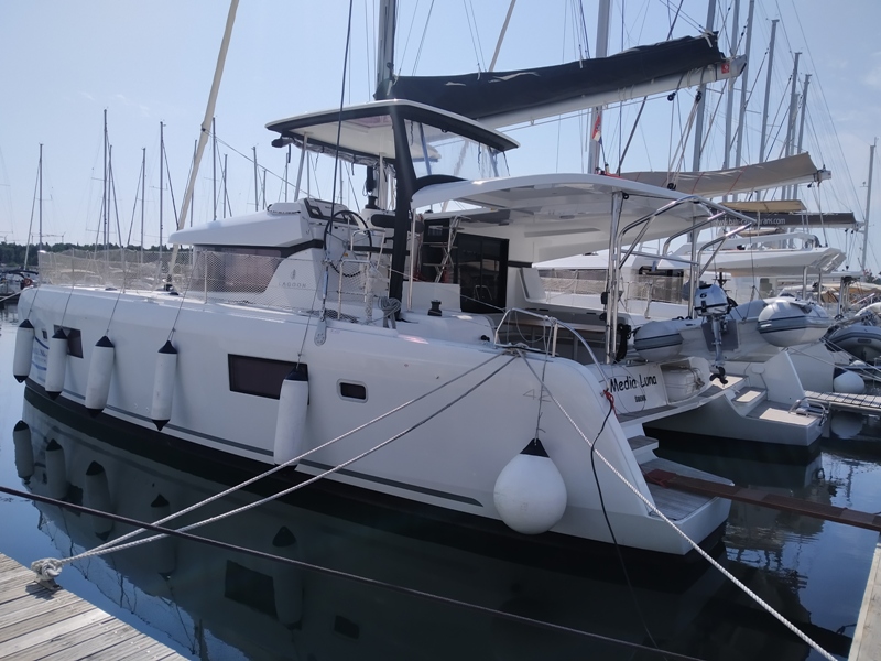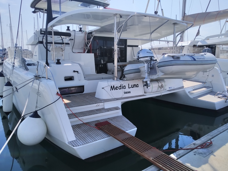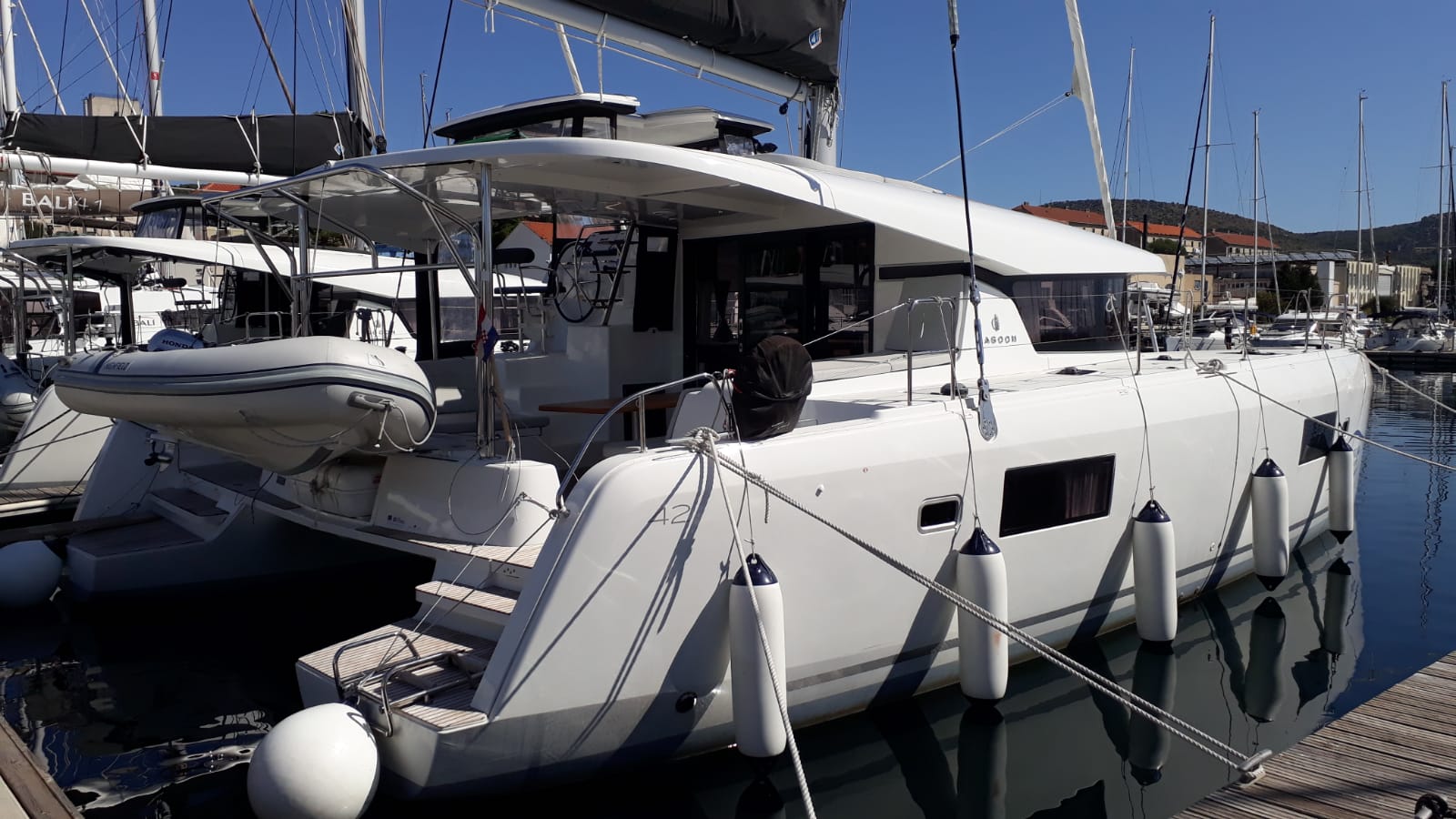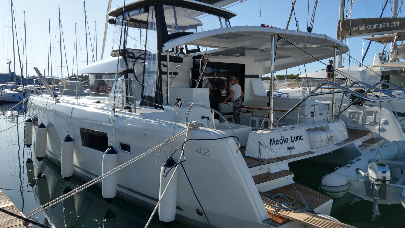 Outside 220 V-Landanschluss, Anker mit Kette, Bootshaken, Cockpitdusche, Cockpitlautsprecher, Cockpitpolster, Cockpittisch mit Eisbox, Deckpolster, elektr. Ankerwinsch, Faltsteuerrad, Fender, Festmacherleinen, Gangway, Hardtop, Solaranlage, Sonnendeck, Teak im Cockpit, Wasserschlauch, Winschen