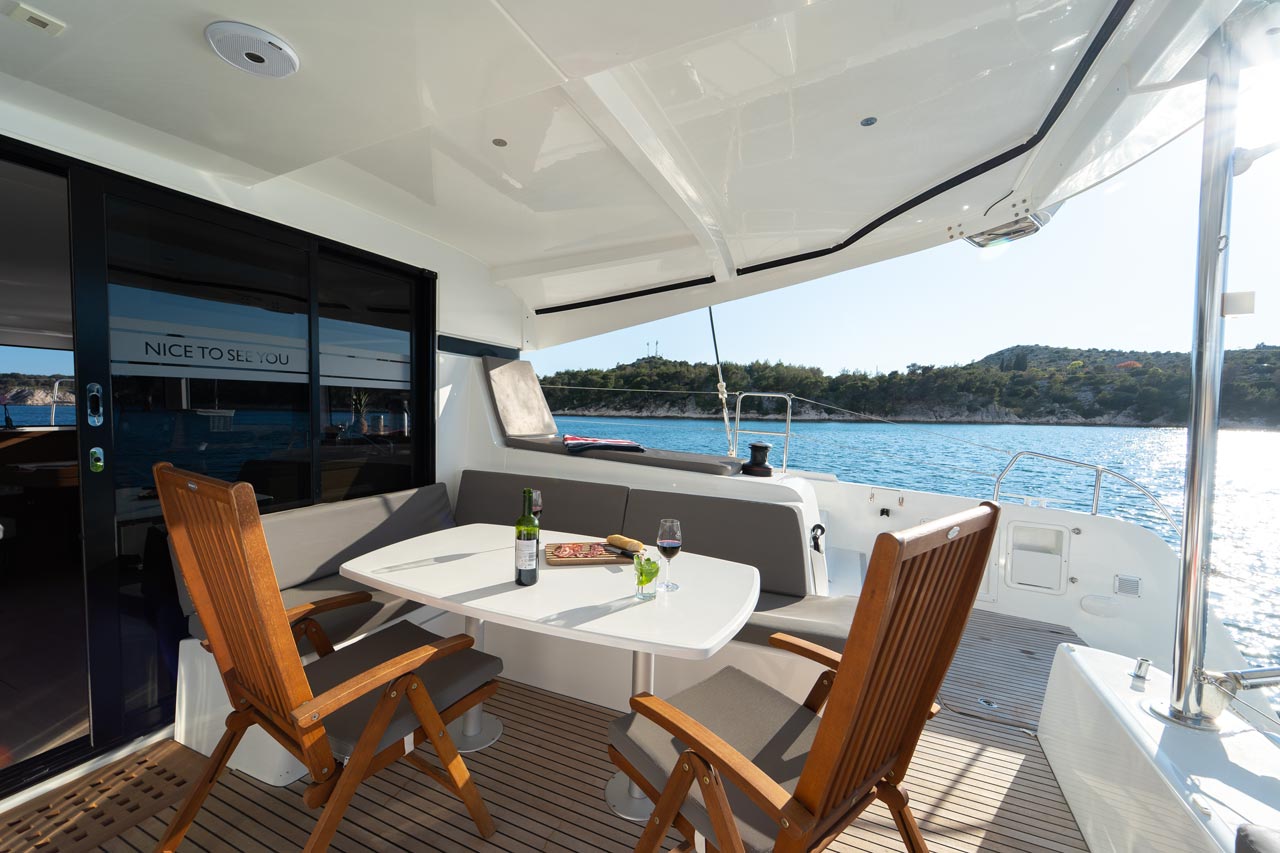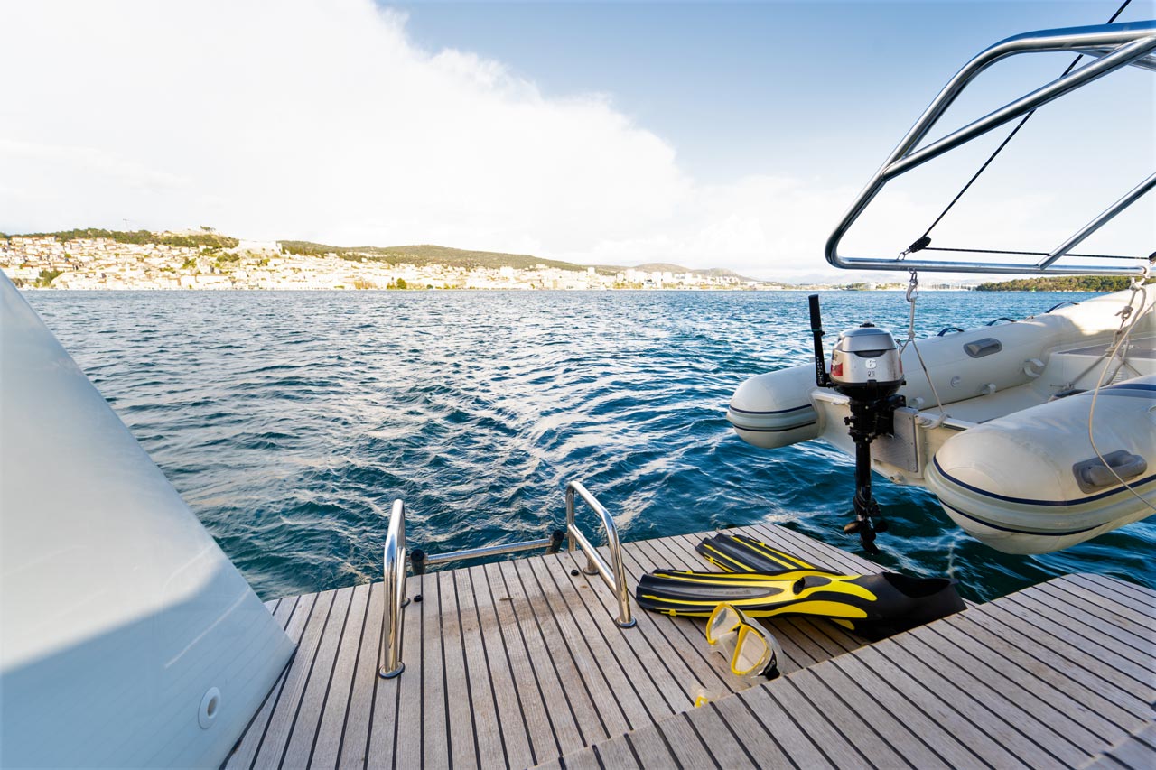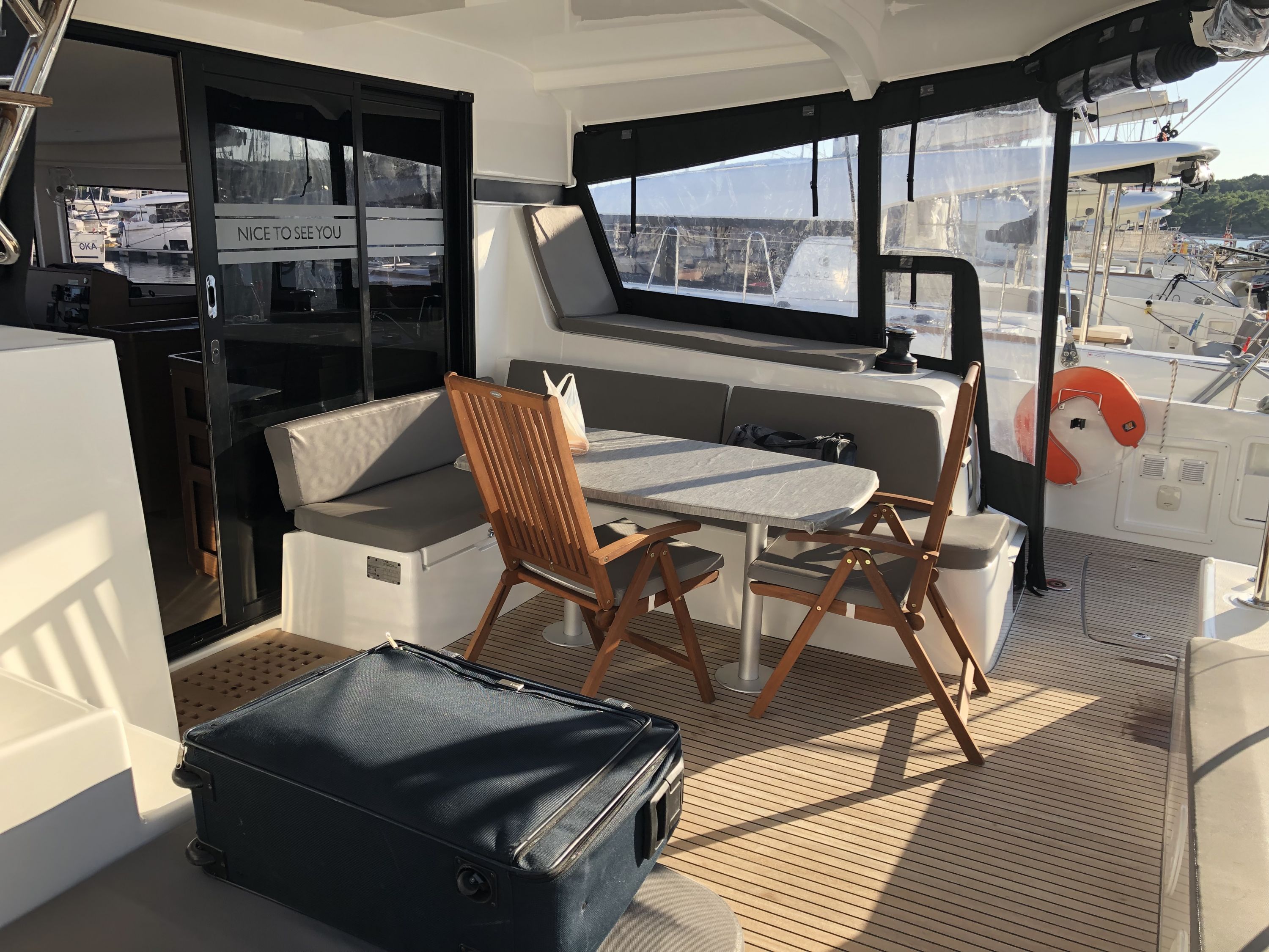 | Outside | 220 V-Landanschluss, Anker mit Kette, Ankerwinsch, Badeplattform, Biminitop, Bootshaken, Cockpitdusche, Cockpitlautsprecher, Cockpitpolster, Cockpittisch, Cockpitverdeck, Davits, elektr. Ankerwinsch, elektr. Genuawinsch, Fender, Festmacherleinen, Gangway, Kugelfender, Kunststoff-Eimer (Pütz), Solaranlage, Sprayhood, Teak im Cockpit, Wantenschneider, Wasserkanister , Wasserschlauch, Windex |