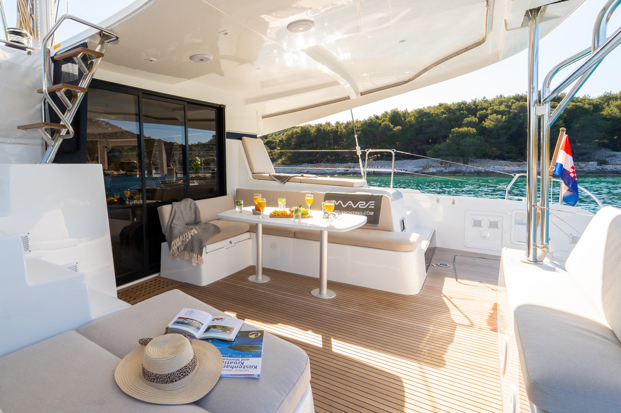 | Outside | 220 V-Landanschluss, Anker mit Kette, Ankerwinsch, Biminitop, Bootshaken, Cockpitdusche, Cockpitlautsprecher, Cockpittisch, Cockpitverdeck, Davits, elektr. Ankerwinsch, elektr. Winsch, Fender, Festmacherleinen, Gangway, Kugelfender, Kunststoff-Eimer (Pütz), Solaranlage, Sprayhood, Teak im Cockpit, Wantenschneider, Wasserschlauch |
