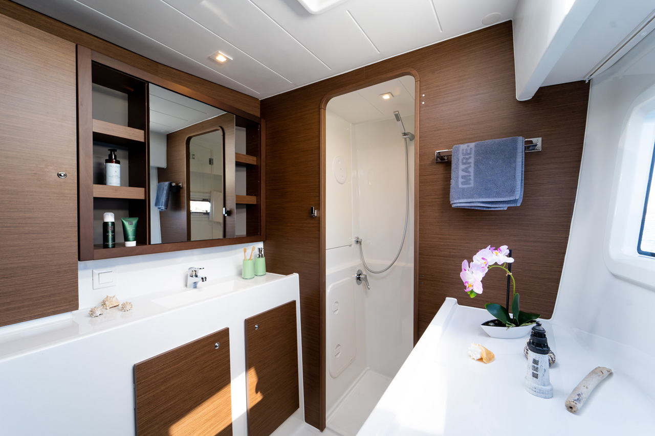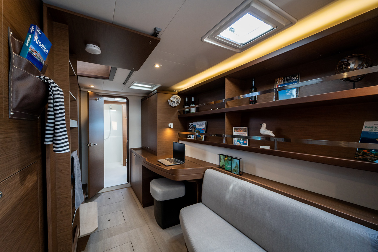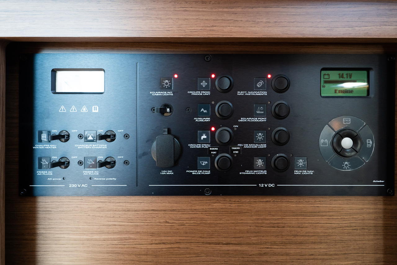 | Inside | Borduhr, Eiswürfelmaschine, Generator, Heizung, Inverter 12V/220V, Kaffeemaschine, Klimaanlage, Kühlschrank, Ladegerät, Luftpumpe für Beiboot, Pantryausstattung, Radio, Salontisch absenkbar, USB Steckdose, Ventilatoren in Kabinen, Warmwasser, Watermaker, WC (elektr.) |