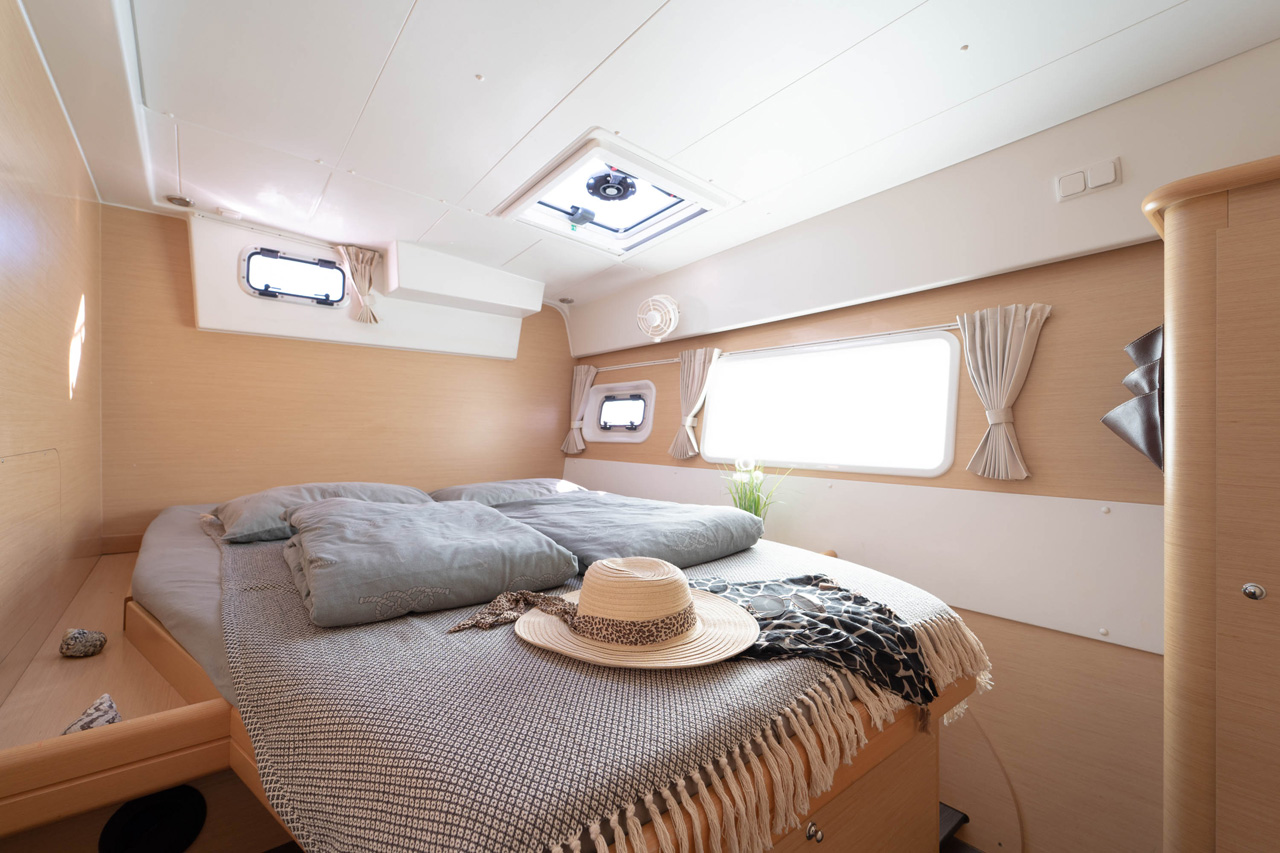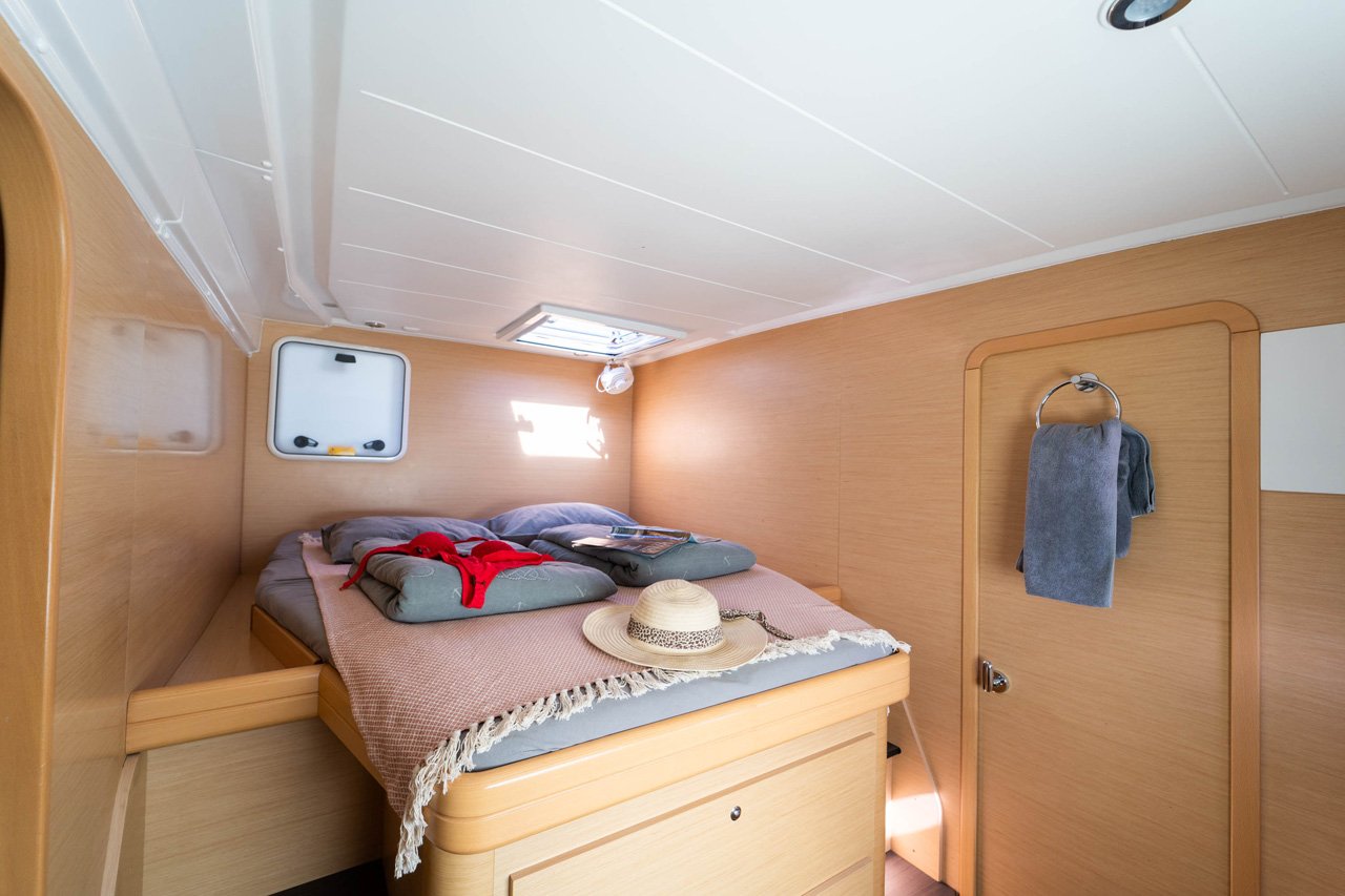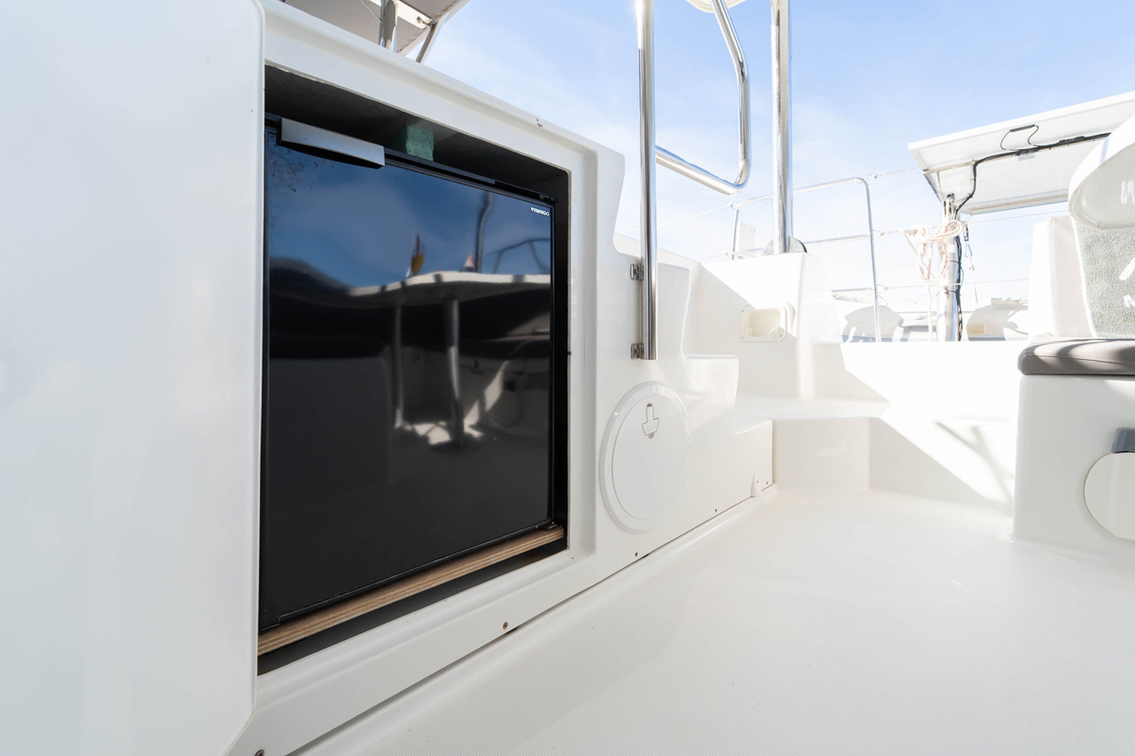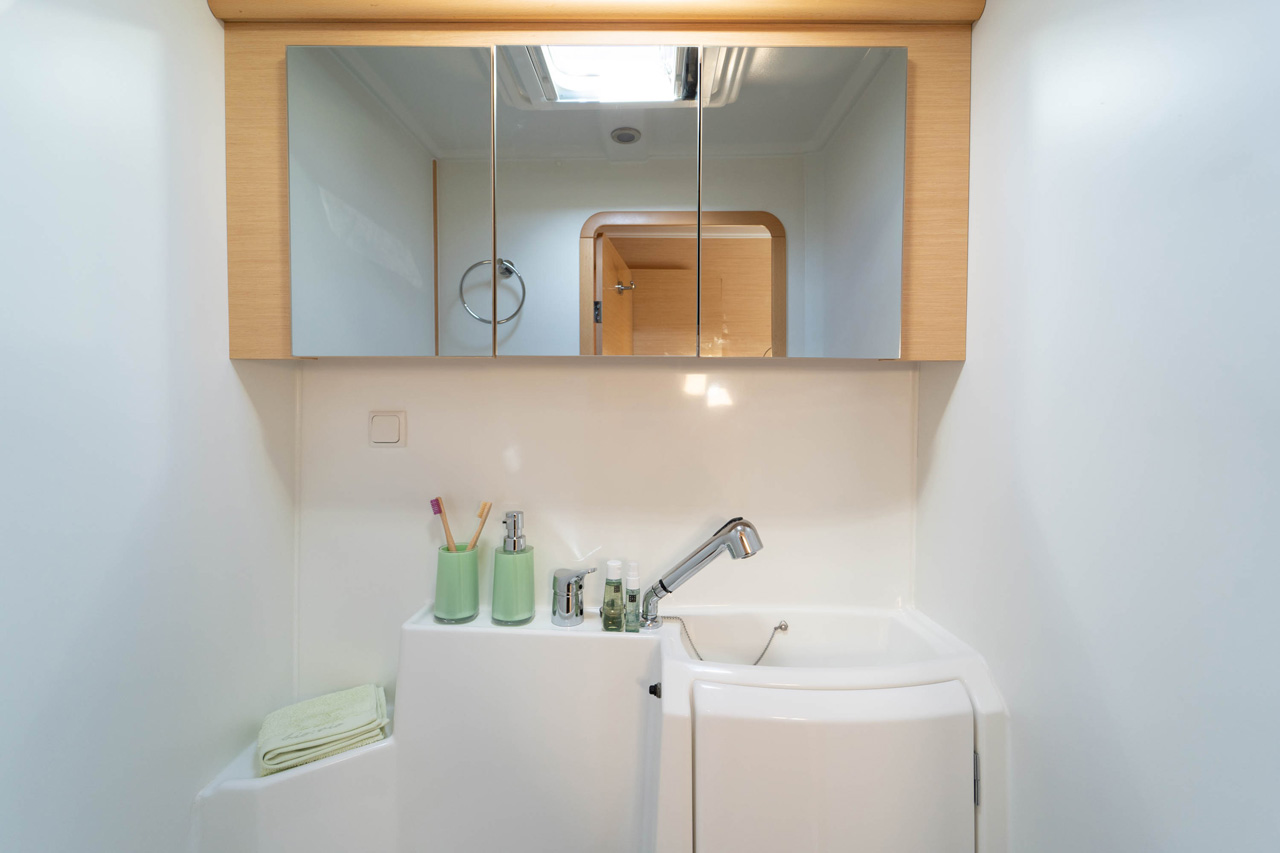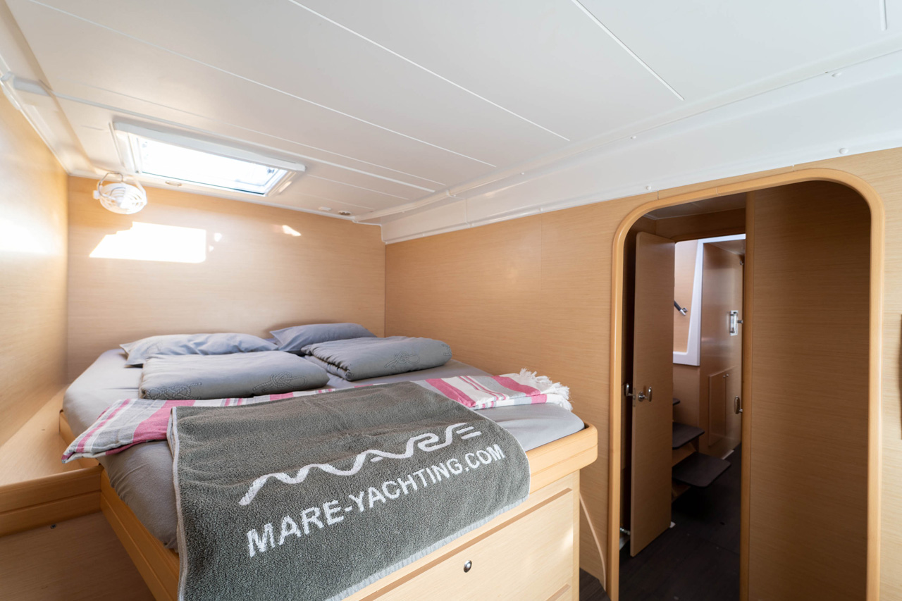 | Inside | 2. Kühlschrank, Borduhr, Gefrierschrank, Generator, Heizung, Inverter 12V/220V, Klimaanlage (ohne Landstrombedarf), Kühlschrank, Ladegerät, Luftpumpe für Beiboot, Pantryausstattung, Radio mit CD, AUX und USB, Salontisch absenkbar, USB Steckdose, Ventilatoren in Kabinen, Warmwasser, Watermaker |