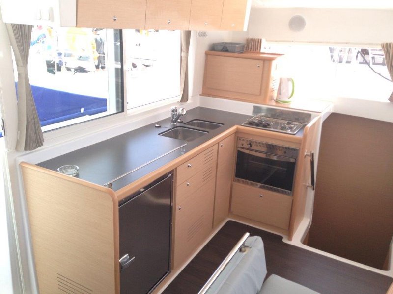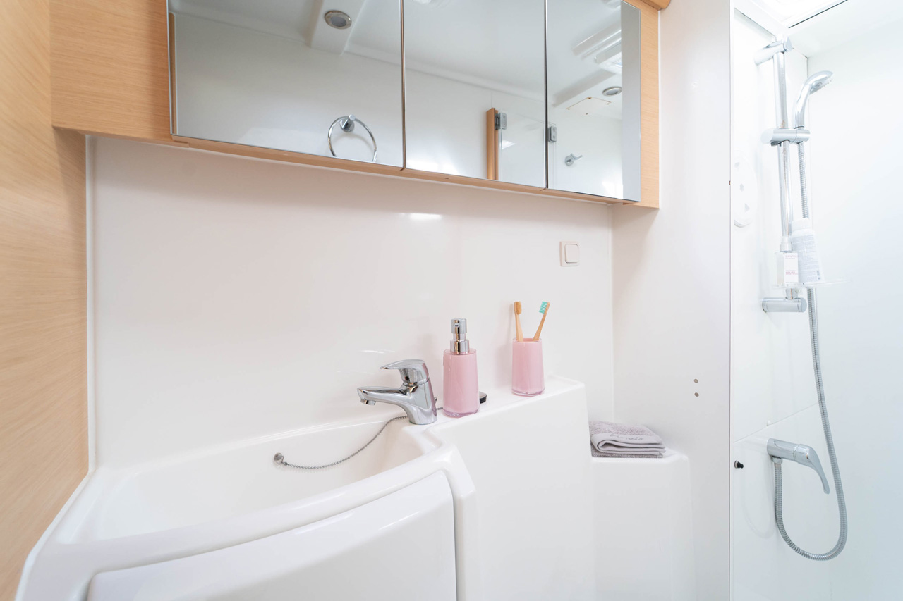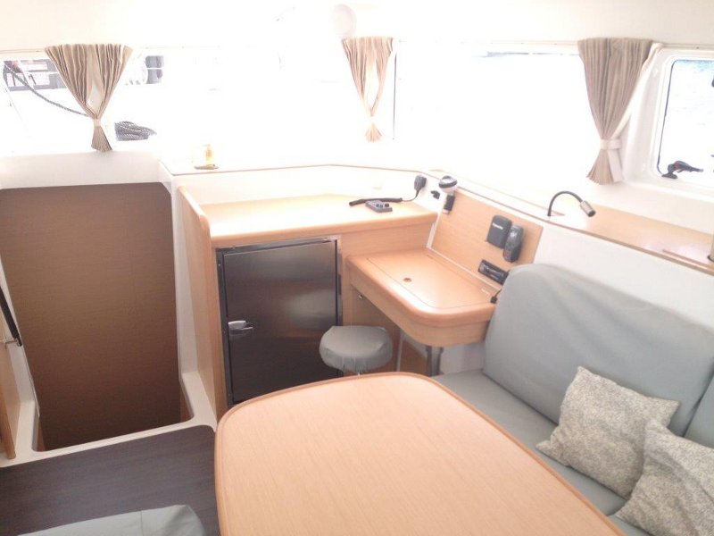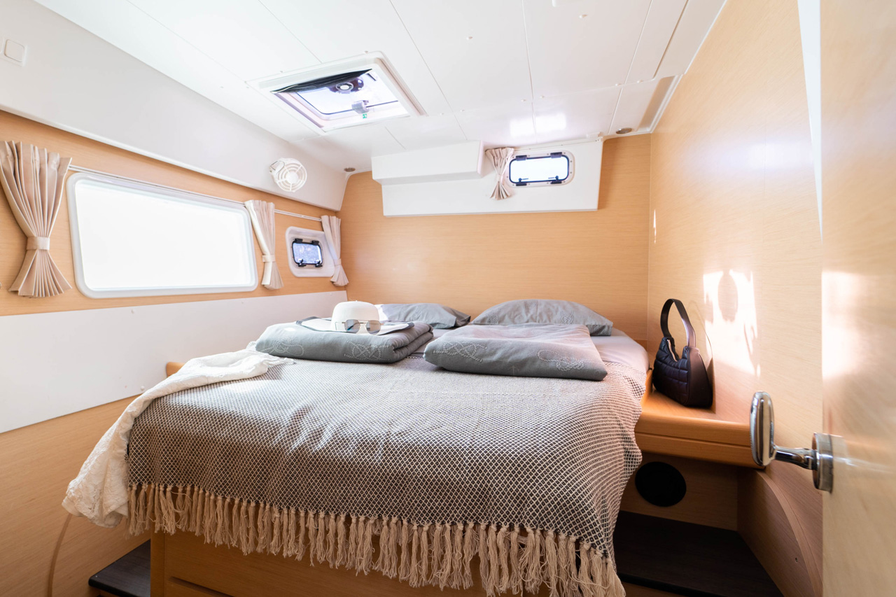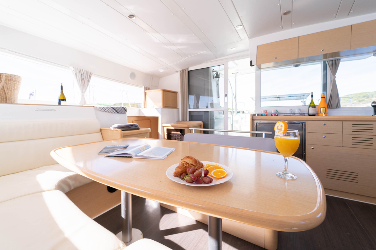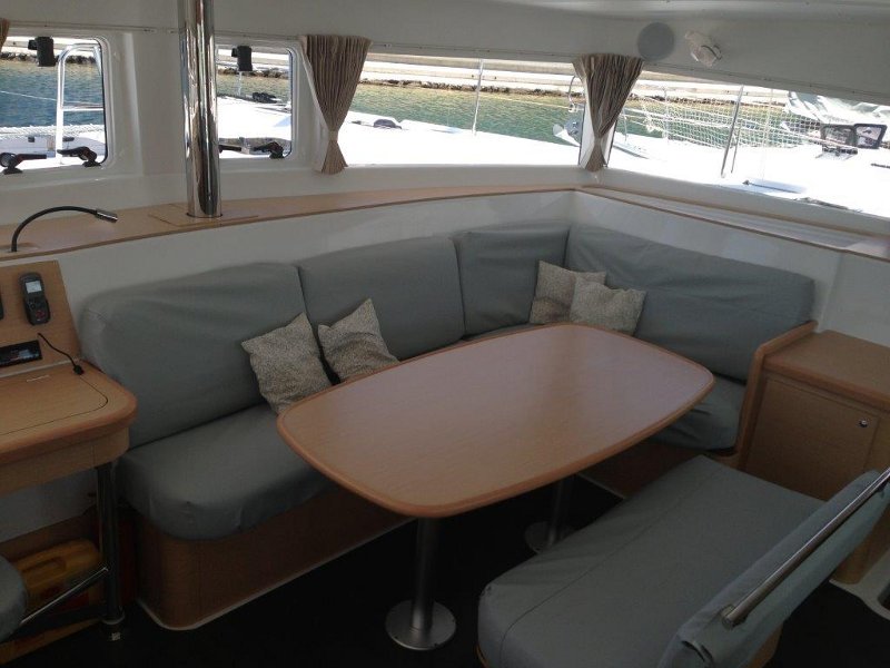 | Inside | 2. Kühlschrank, Borduhr, Gefrierschrank, Generator, Heizung, Inverter 12V/220V, Klimaanlage (ohne Landstrombedarf), Kühlschrank, Ladegerät, Luftpumpe für Beiboot, Pantryausstattung, Radio mit CD, AUX und USB, Salontisch absenkbar, USB Steckdose, Ventilatoren in Kabinen, Warmwasser, Watermaker |