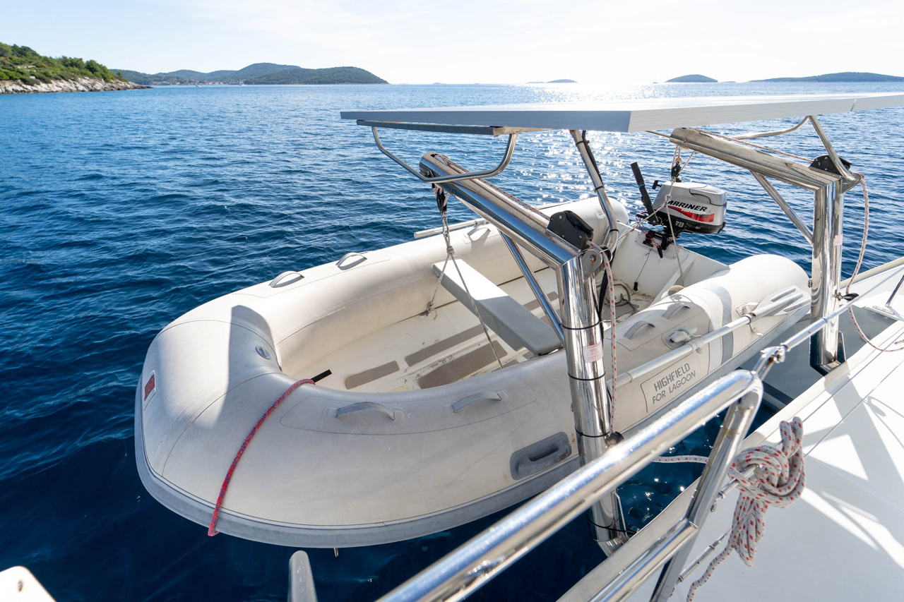 | Outside | 220 V-Landanschluss, Anker mit Kette, Ankerwinsch, Badeplattform, Biminitop, Bootshaken, Cockpitdusche, Cockpitlautsprecher, Cockpitpolster, Cockpittisch, Cockpitverdeck, Davits, Deckpolster, elektr. Ankerwinsch, elektr. Winsch, Fender, Festmacherleinen, Gangway, Kugelfender, Kunststoff-Eimer (Pütz), Solaranlage, Unterwasserbeleuchtung, Wantenschneider, Wasserkanister , Wasserschlauch, Windex |