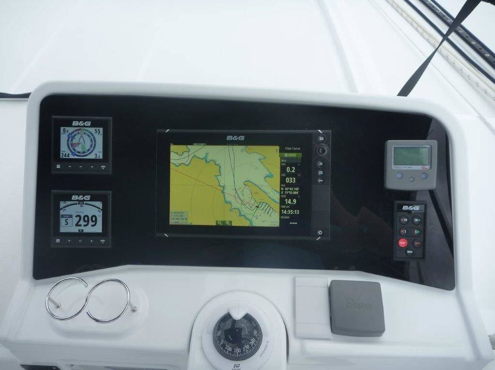 Navigation Barometer, Fernglas, GPS mit Kartenplotter im Cockpit, GPS mit Kartenplotter im Salon, Hafenhandbücher, Handpeilkompass, Navigationsbesteck, Seekarten, Tridata (Log, Echolot, Windm.)