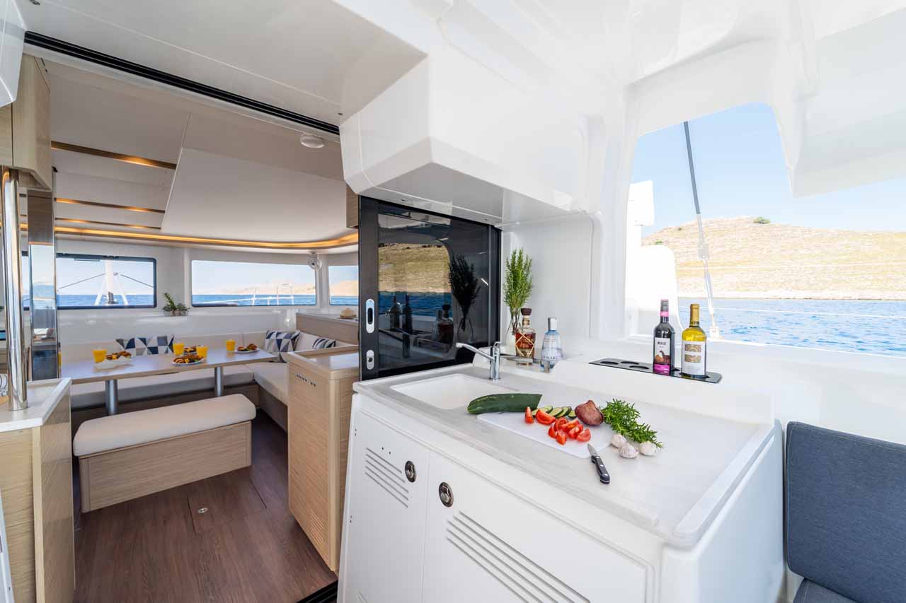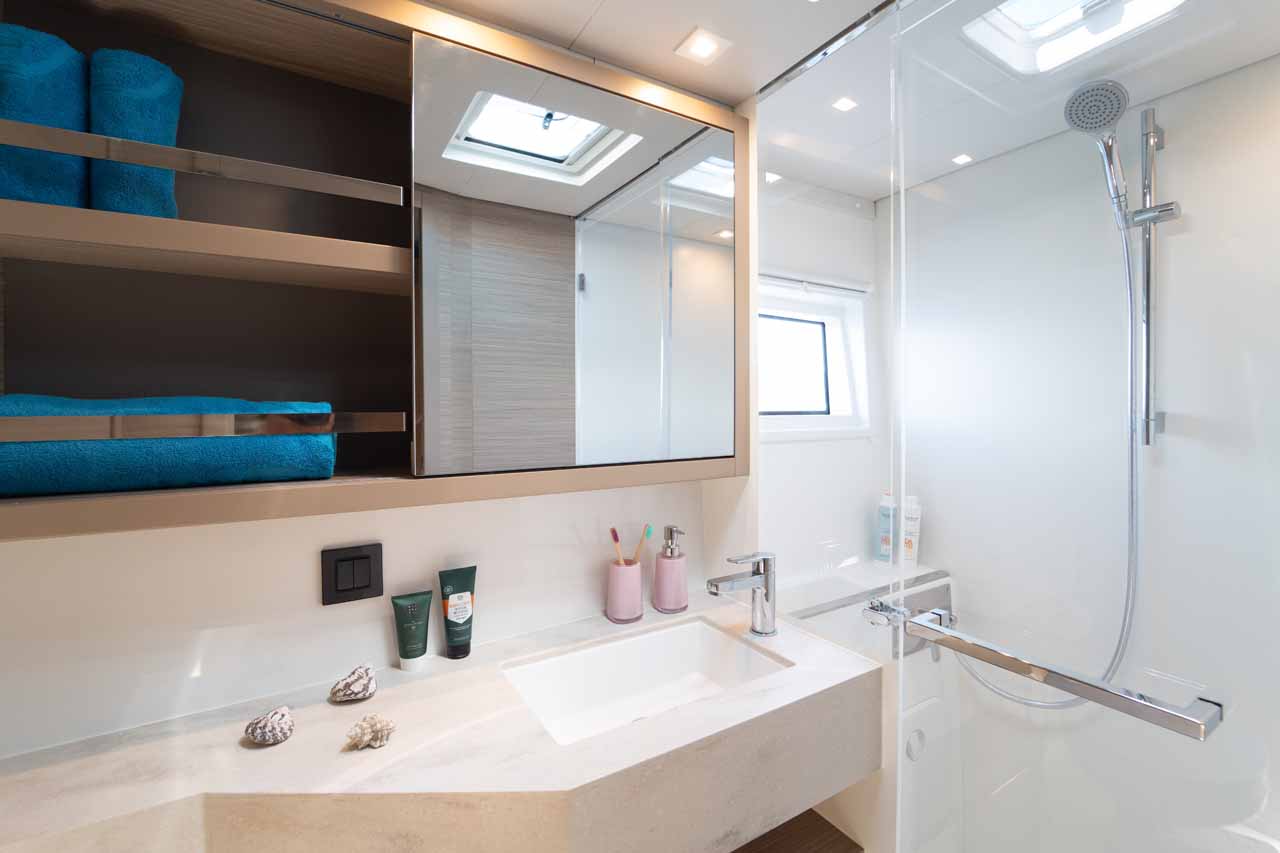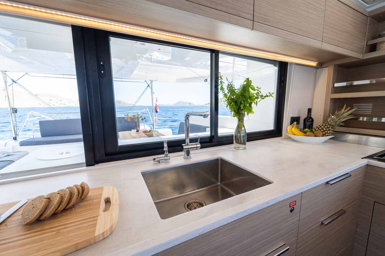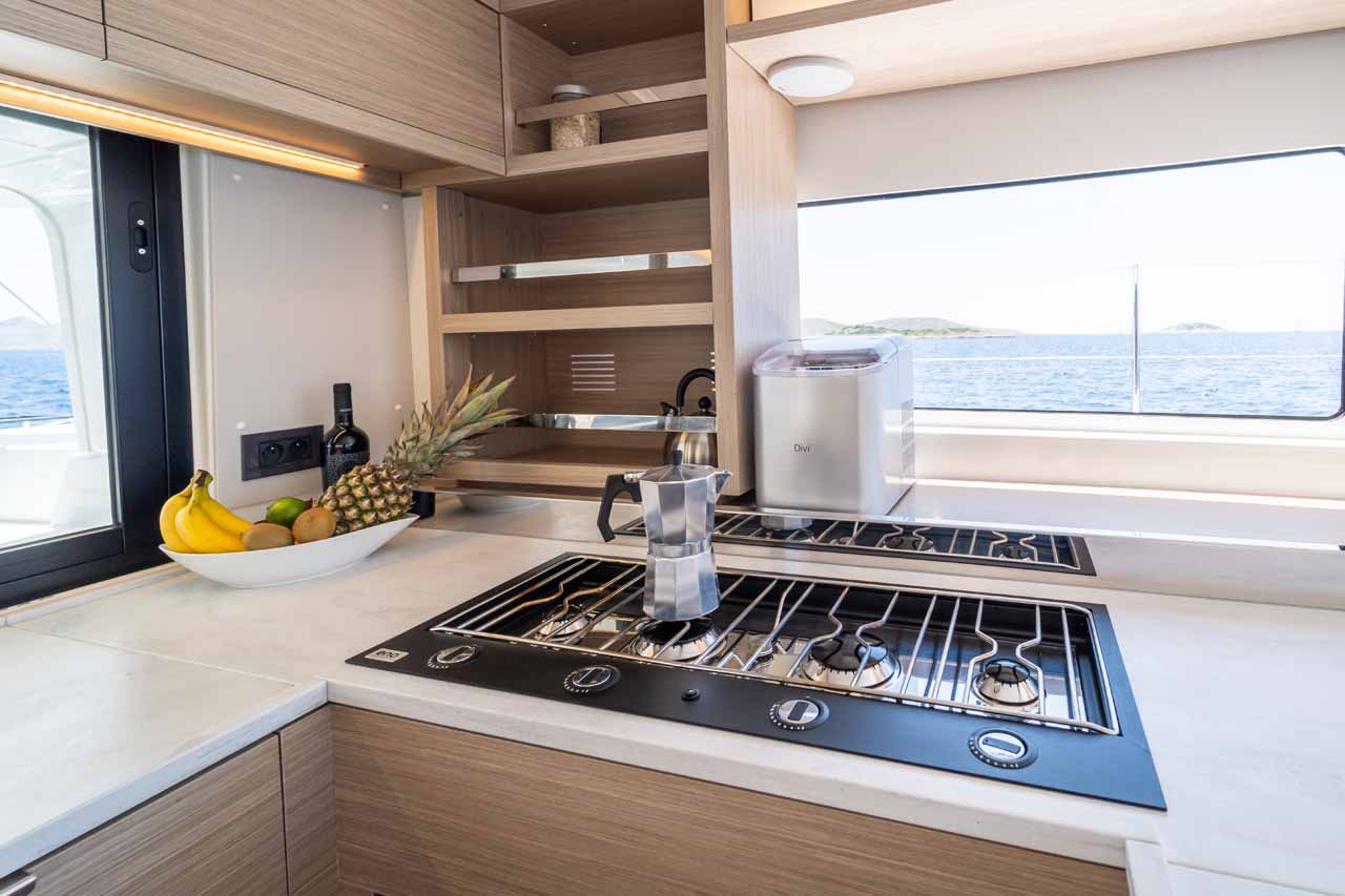 | Inside | Borduhr, Eiswürfelmaschine, Generator, Geschirrspüler, Heizung, Inverter 12V/220V, Kaffeemaschine, Klimaanlage (ohne Landstrombedarf), Kühlschrank, Ladegerät, Luftpumpe für Beiboot, Pantryausstattung, Radio, USB Steckdose, Ventilatoren in Kabinen, Warmwasser, Watermaker, WC (elektr.) |