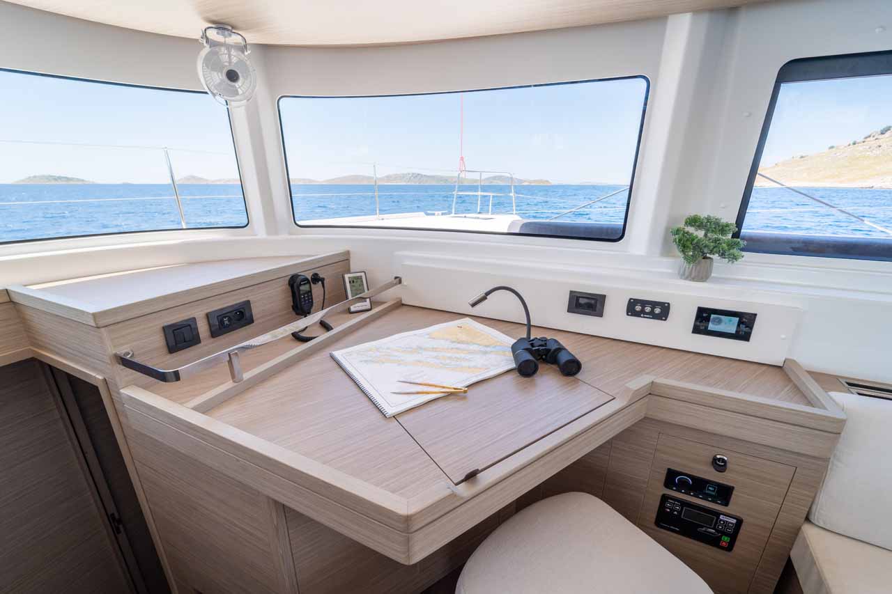 | Navigation | Barometer, Fernglas, GPS mit Kartenplotter auf Flybridge, GPS mit Kartenplotter im Cockpit, GPS mit Kartenplotter im Salon, Hafenhandbücher, Handpeilkompass, Navigationsbesteck, Seekarten, Tridata (Log, Echolot, Windm.) |