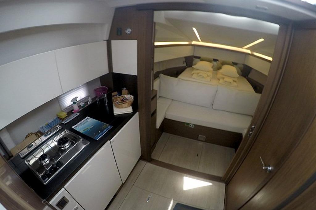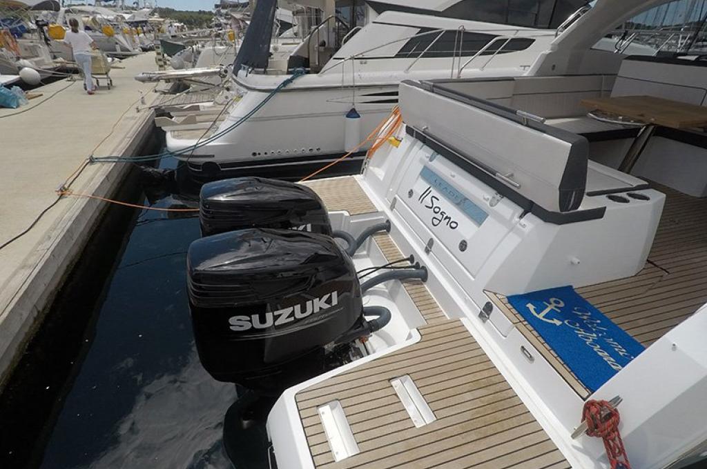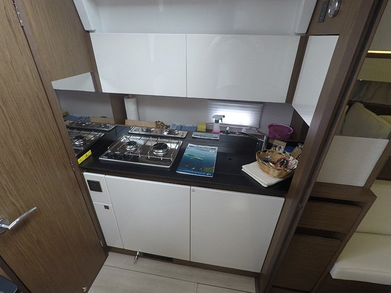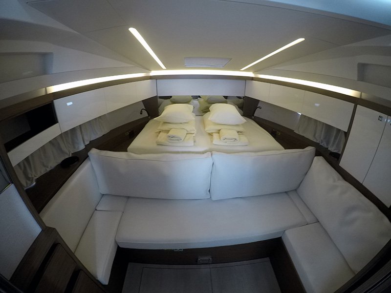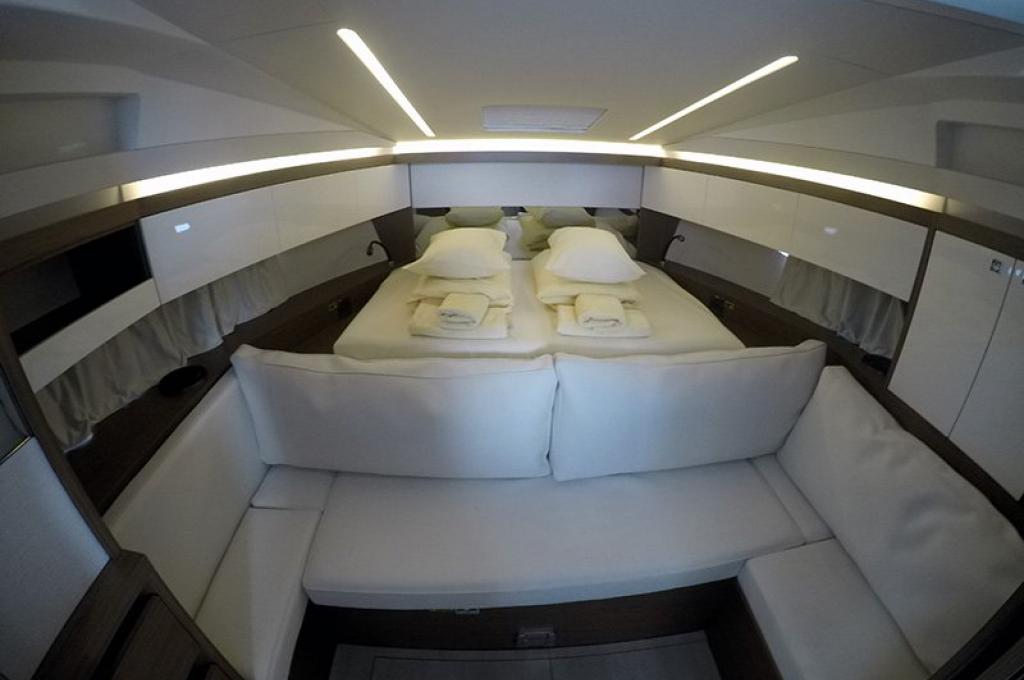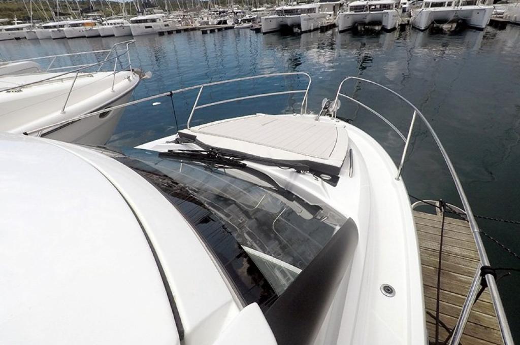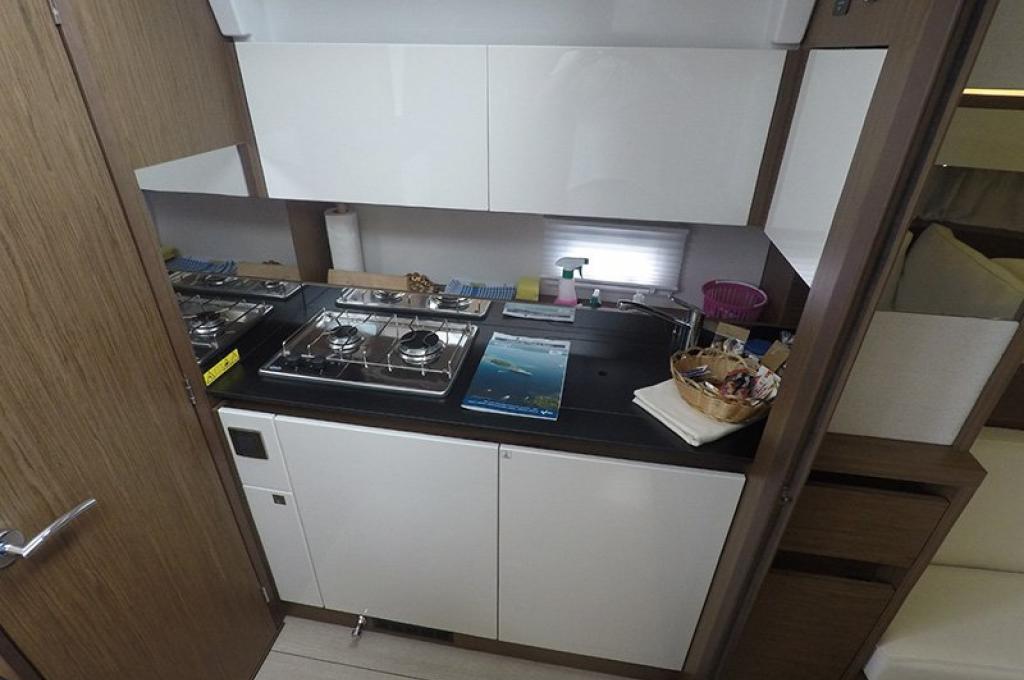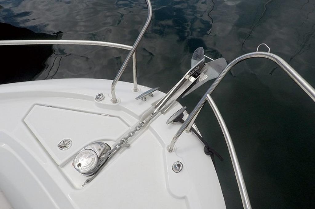 | Outside | 220 V-Landanschluss, Anker mit Kette, Anker mit Seil, Badeleiter, Bootshaken, Cockpitdusche, Cockpitlautsprecher, Cockpitpolster, Cockpittisch, Deckbürste, Delta-Anker, elektr. Ankerwinsch, Fender, Festmacherleinen, Gangway, Hardtop, Wasserschlauch, Winschen |