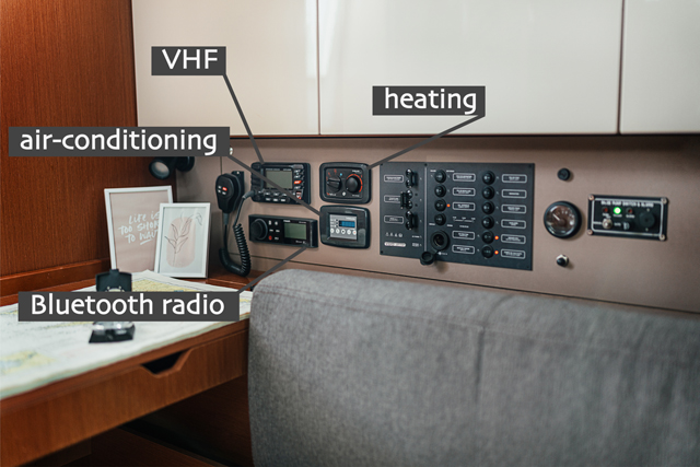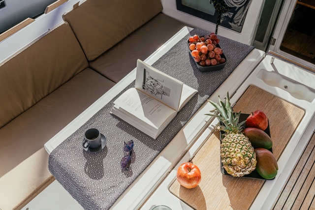 | Outside | Badeplattform, Biminitop, Cockpitdusche, Cockpitlautsprecher, Cockpitpolster, Fender, Solaranlage |