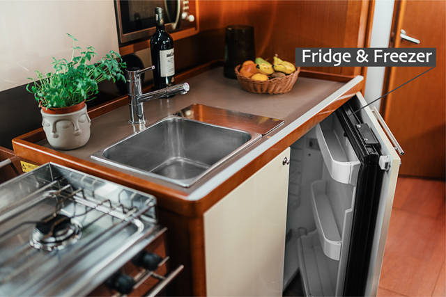 | Inside | Eiswürfelmaschine, Espresso Maschine, Fäkalientank, Gasherd mit Backofen, Heizung, Inverter 12V/220V, Klimaanlage (Landstrom), Kühlschrank, Mikrowelle, TV |