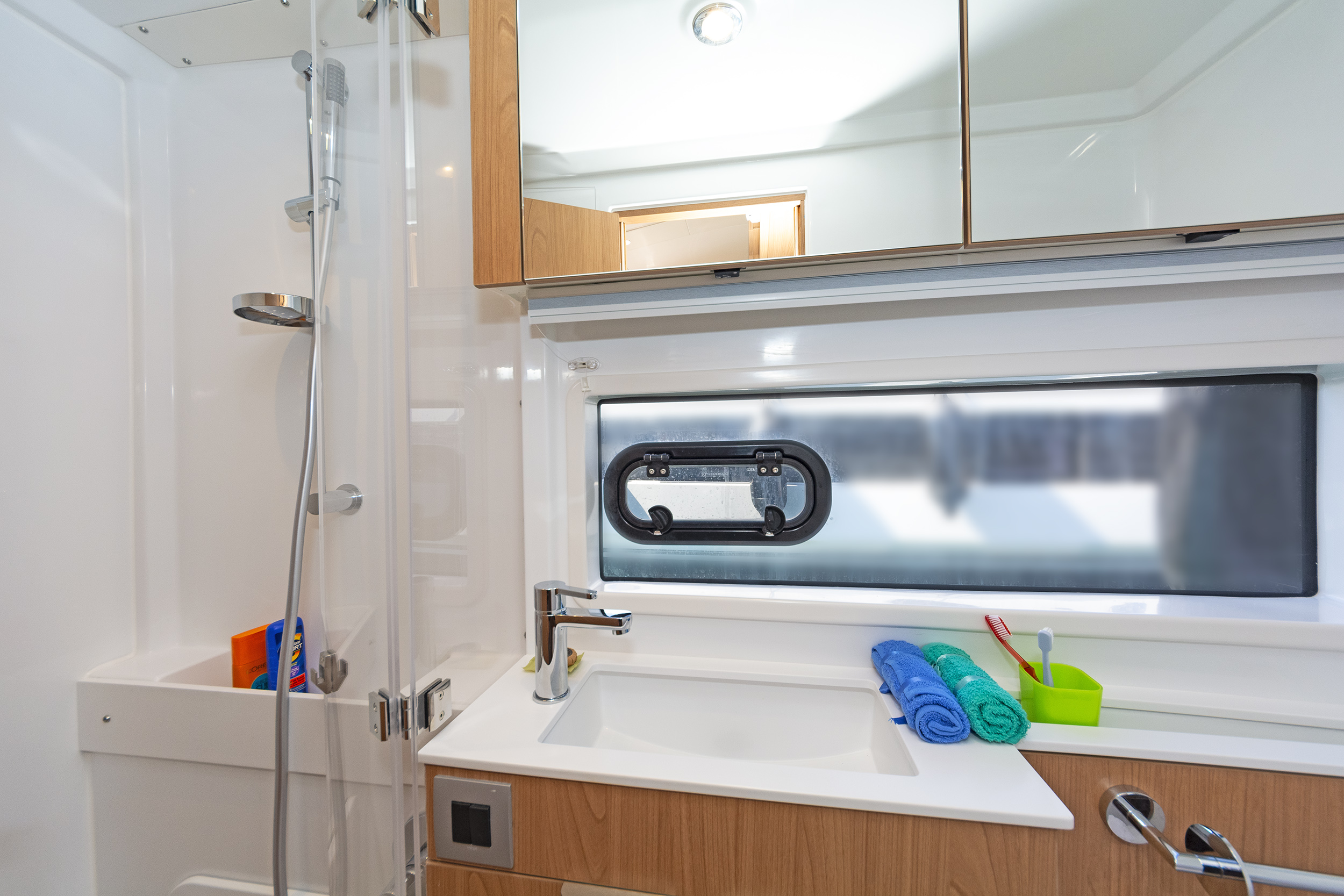 | Inside | 220V Steckdosen, Gasherd, Gefrierschrank, Inverter 12V/220V, Kühlschrank, Ladegerät, Landstromkabel, Lautsprecher im Salon, Luftpumpe für Beiboot, Pantryausstattung, Radio, Salontisch absenkbar, USB-Ladegerät für Mobilgeräte, WC (elektr.) |