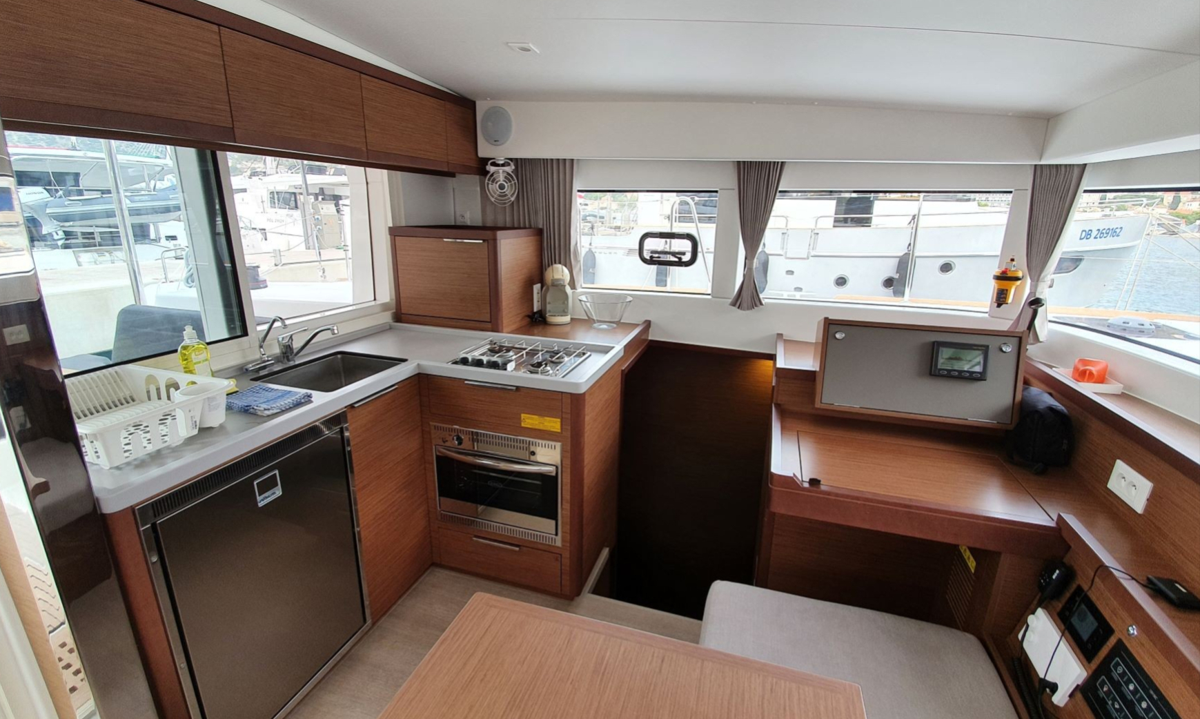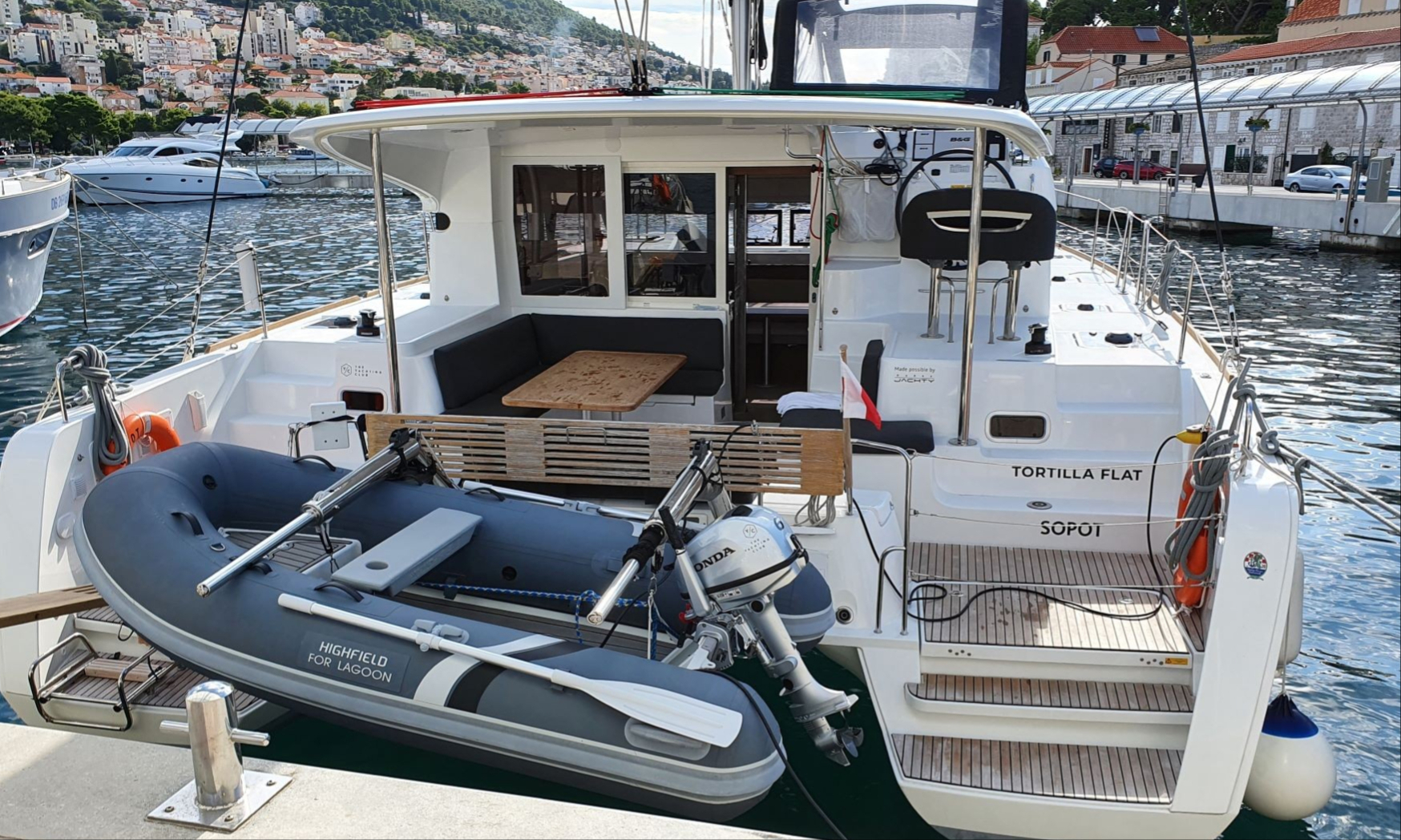 Anker mit Kette, Badeleiter, Badeplattform, Cockpitdusche, Cockpitlautsprecher, Cockpitpolster, Cockpittisch, elektr. Ankerwinsch, elektr. Winsch, Fender, Gangway, Sprayhood, Teak im Cockpit, Wasserschlauch, Windex |
