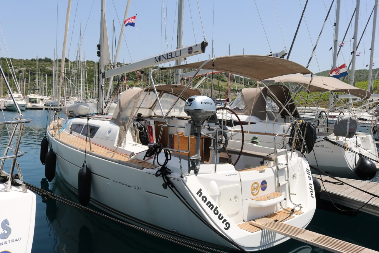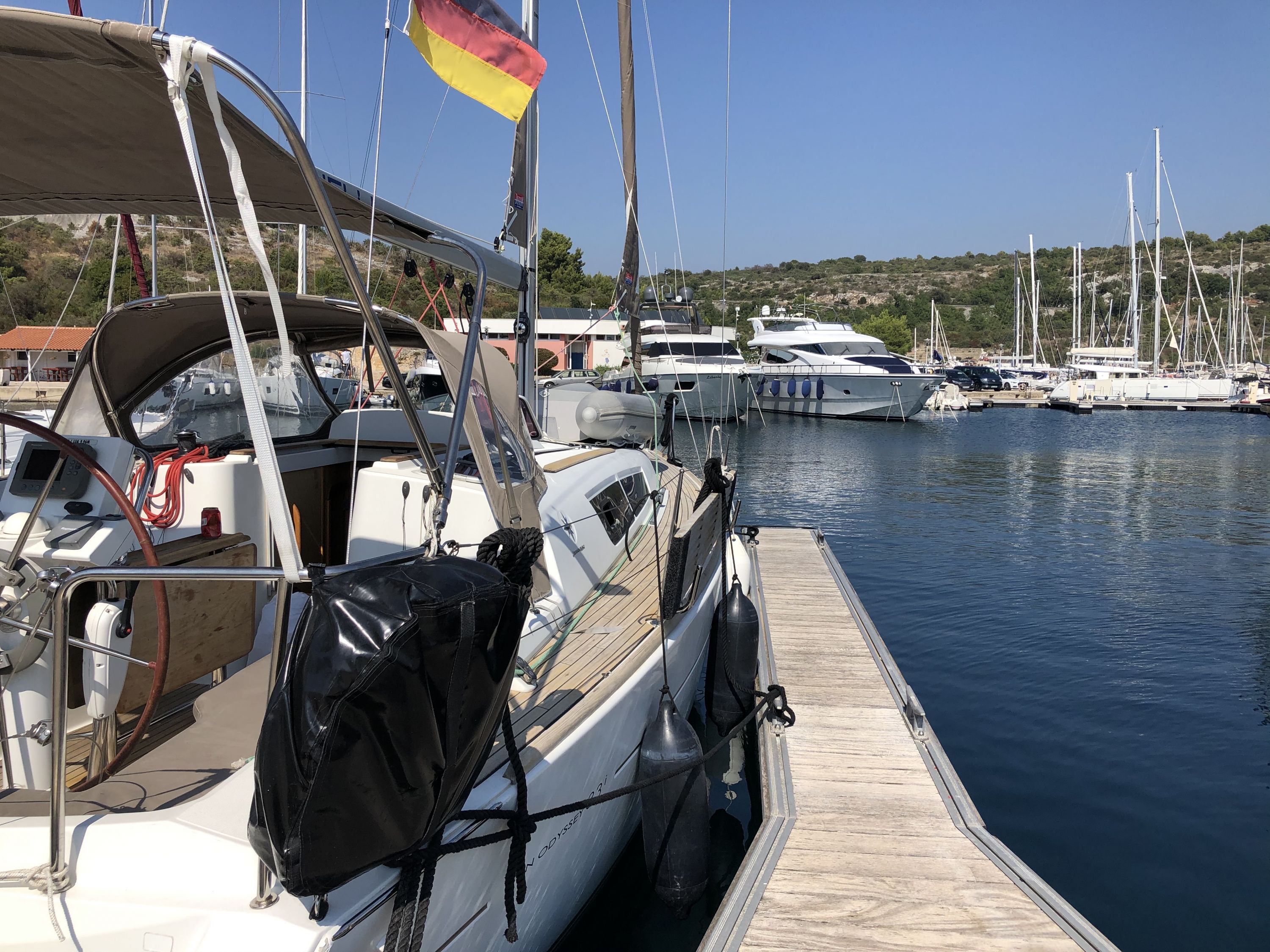 Das Bimini Top war zu klein - schützte also wenig vor Sonne und Regen, der Autopilot zu laut und bei wenig Welle/Wind fiel er schon aus (Fixierung mit Benzel war notwendig). Weitere Kleinigkeiten konnten mit wenig Aufwand behoben bzw. mit umgegangen werden. Insgesamt für das Alter der Yacht ausreichend.