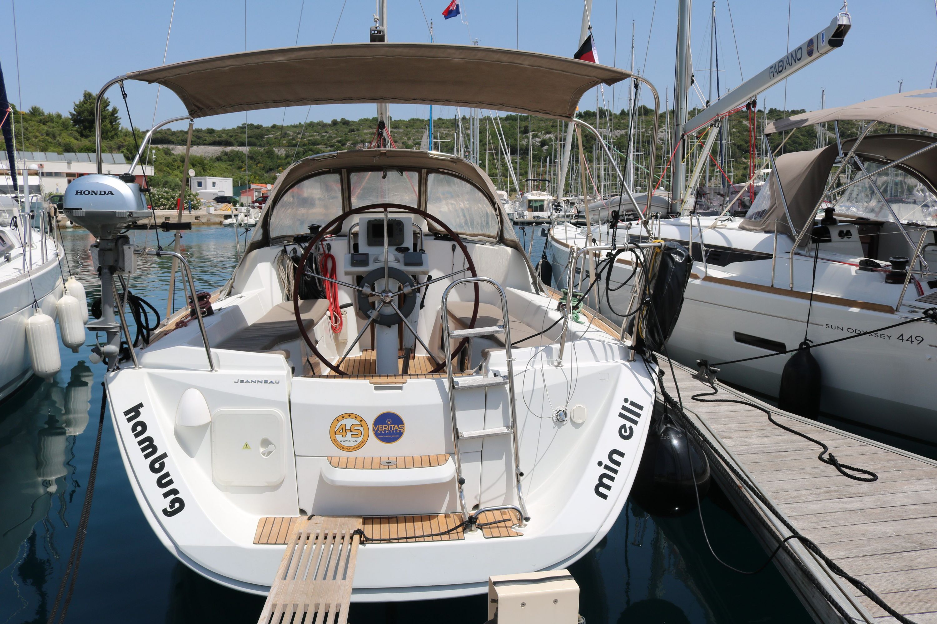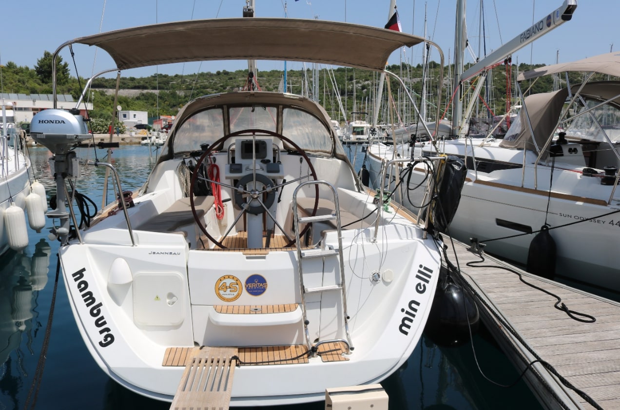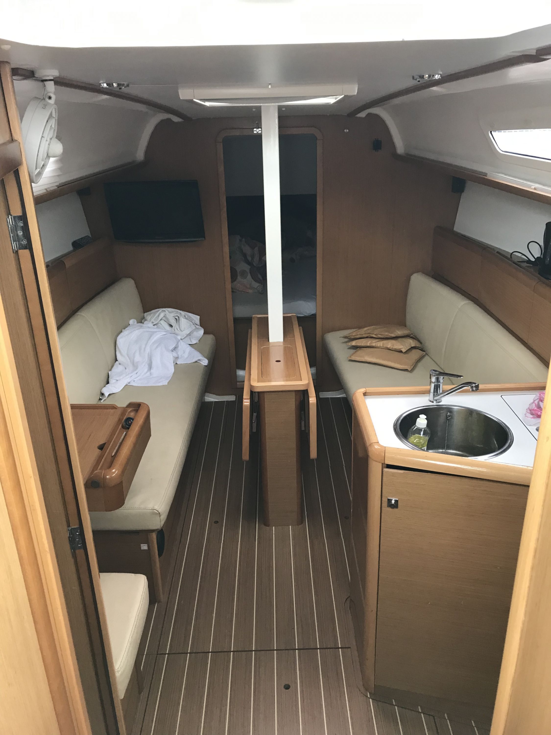 Es ist ein ,durch die Vercharterung in die Jahre gekommenes Schiff,welches aber gute Segelleistungen und eine gewisse Gutmütigkeit hat.