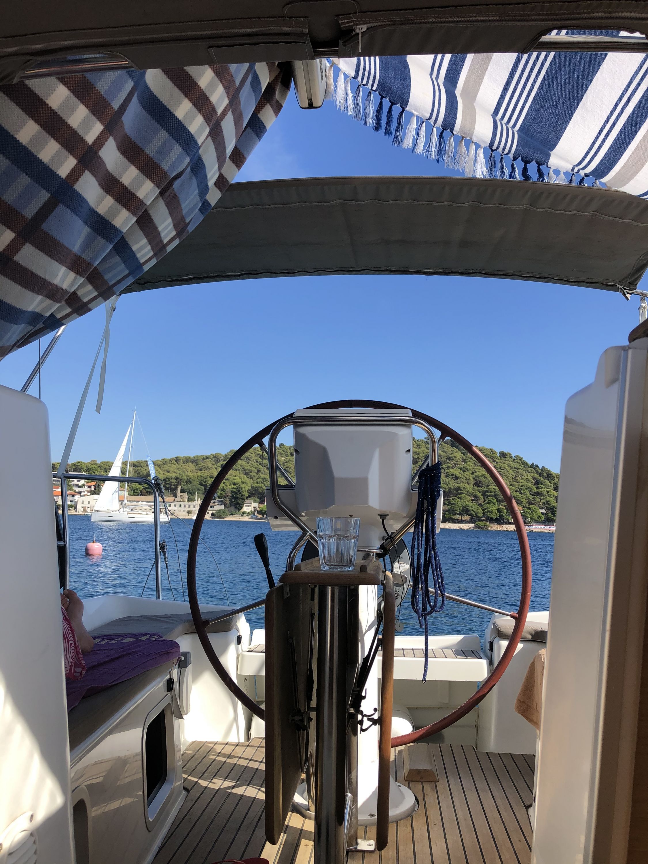 Hallo,auf dieser Yacht ist das Bimini leider viel zu klein.Auch bei einer kleinen 33 Fuß Yacht sind ca. 1Meter viel zu wenig. Wir haben uns mit Decken geholfen.