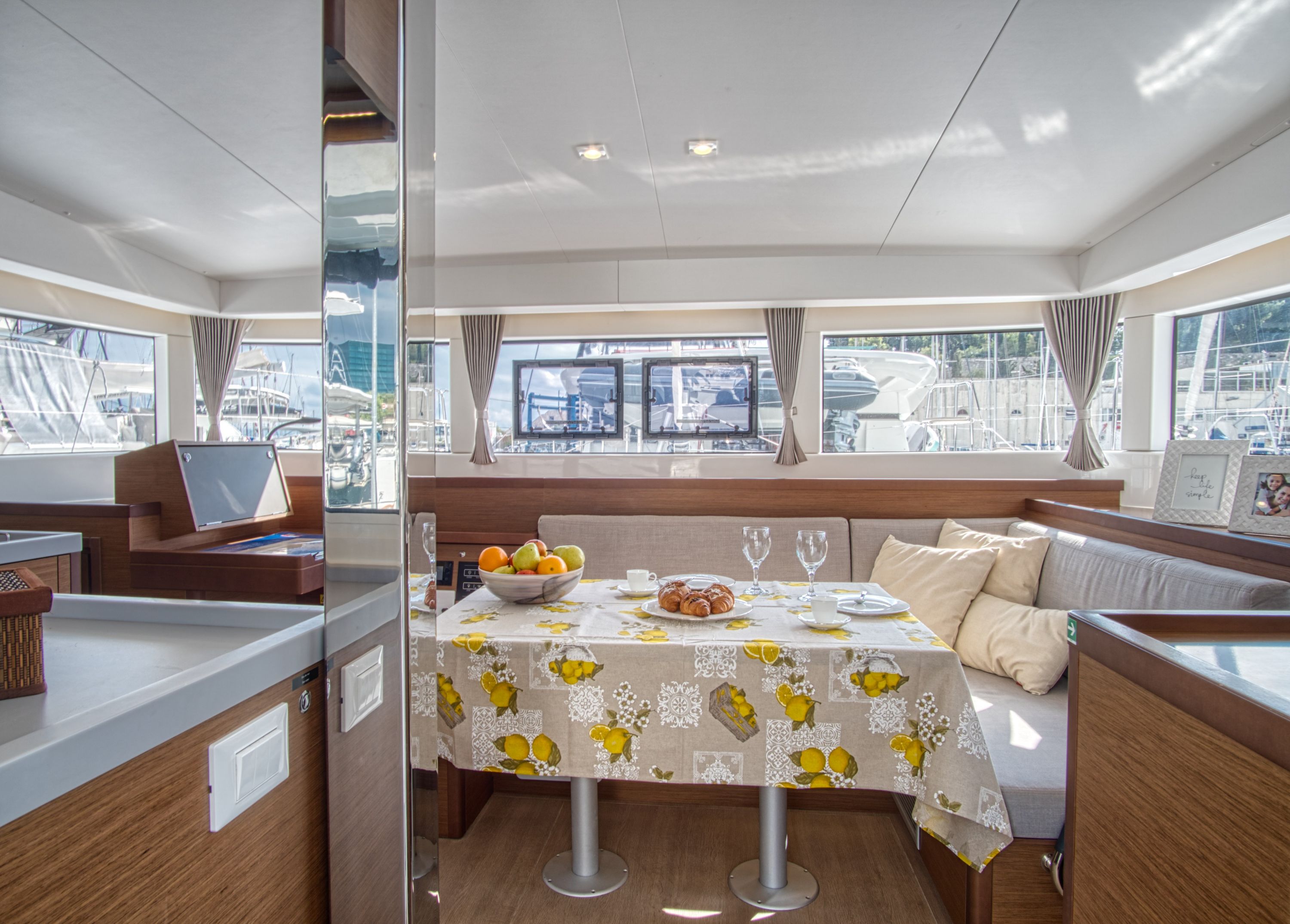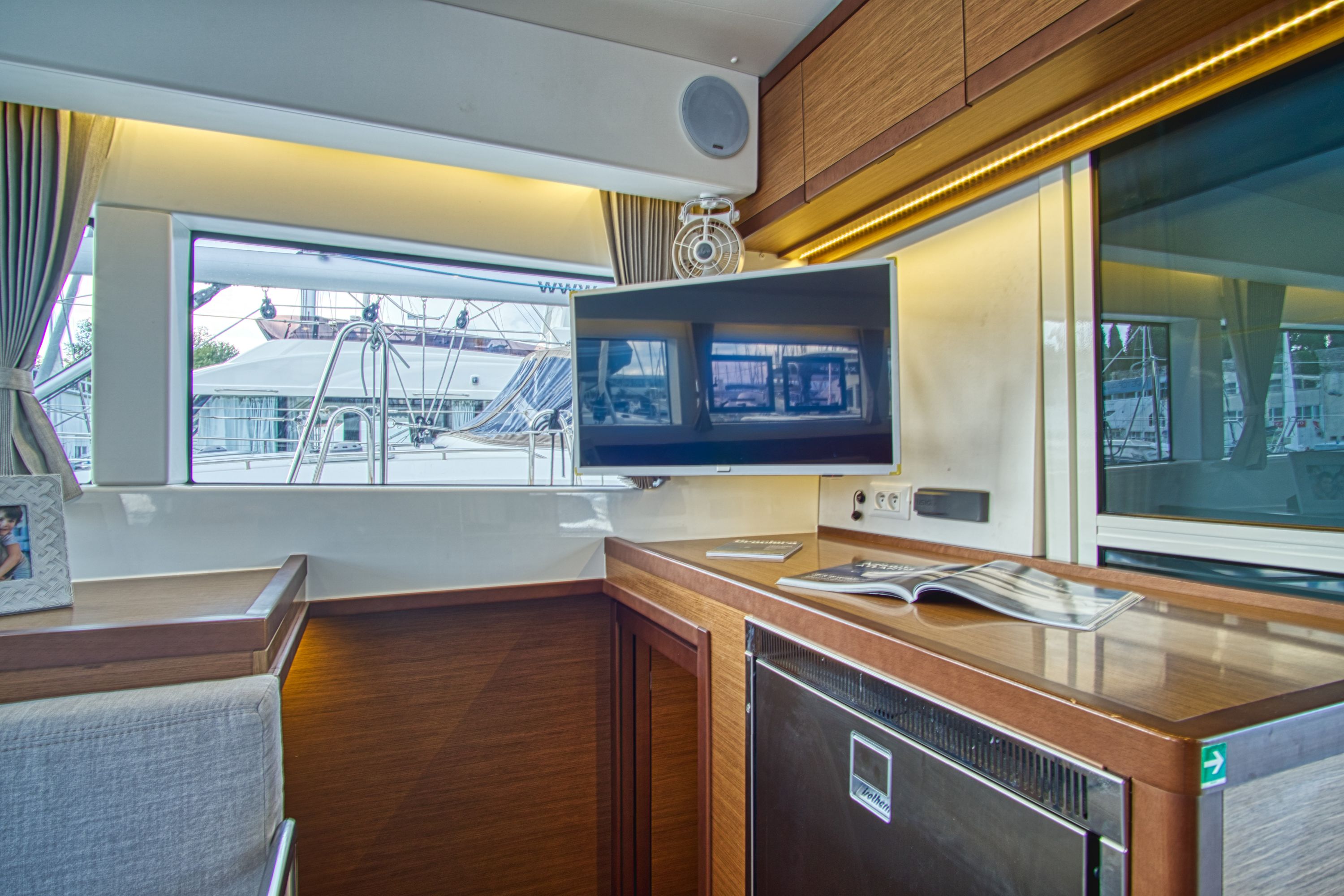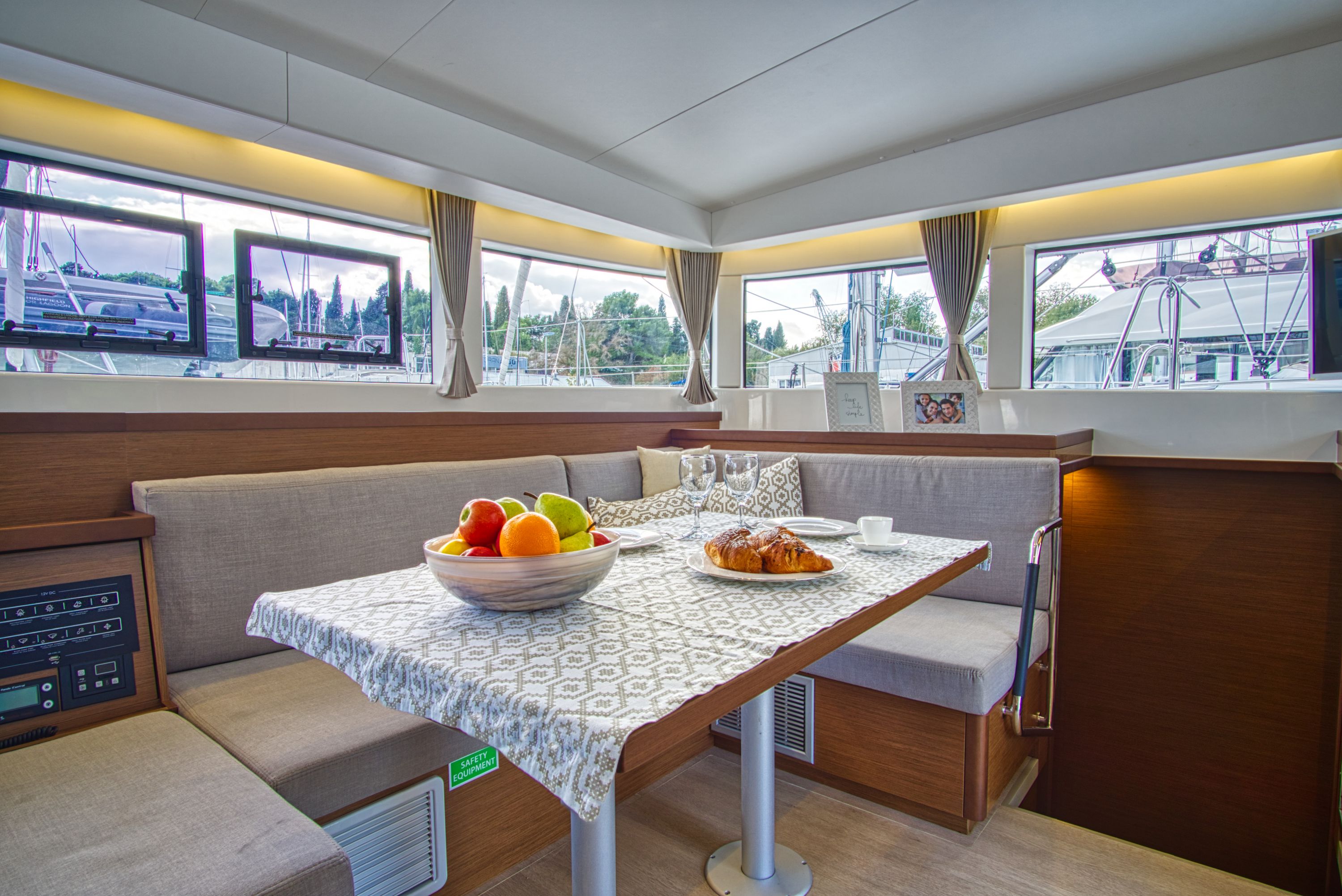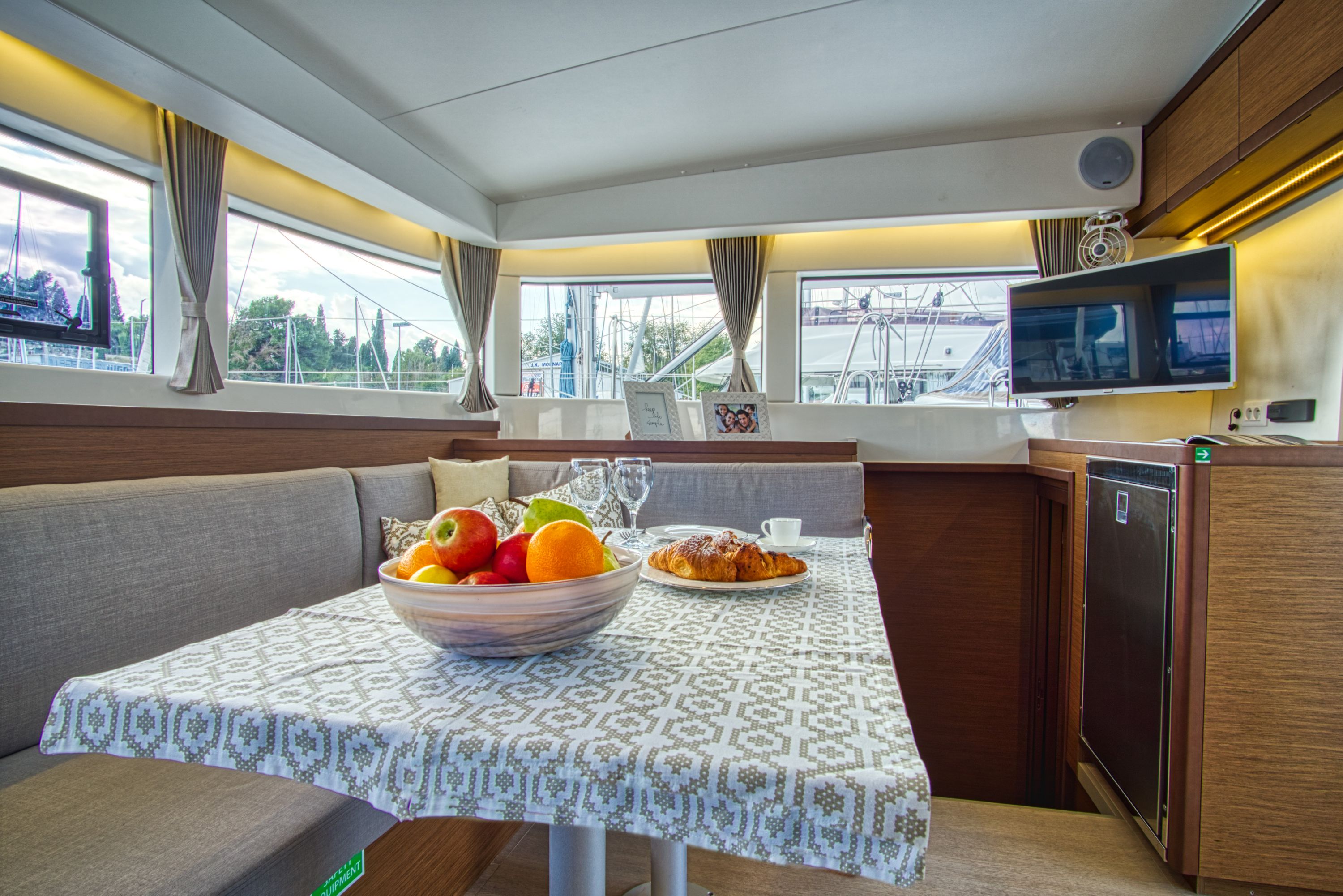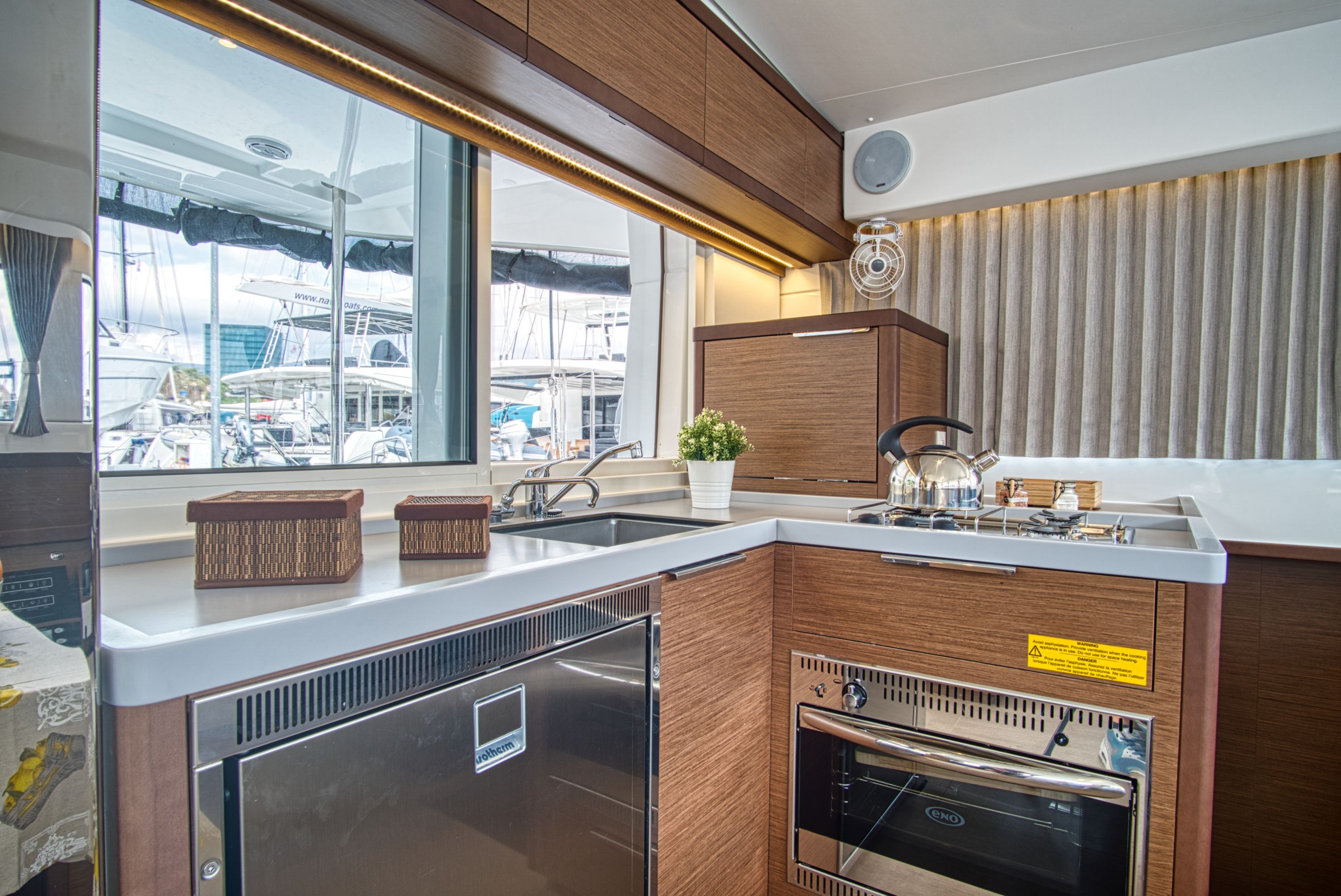 | Outside | 220 V-Landanschluss, Biminitop, Cockpitdusche, Cockpitlautsprecher, Cockpitpolster, Cockpittisch, elektr. Ankerwinsch, Gangway, Kuchenbude, Sprayhood |