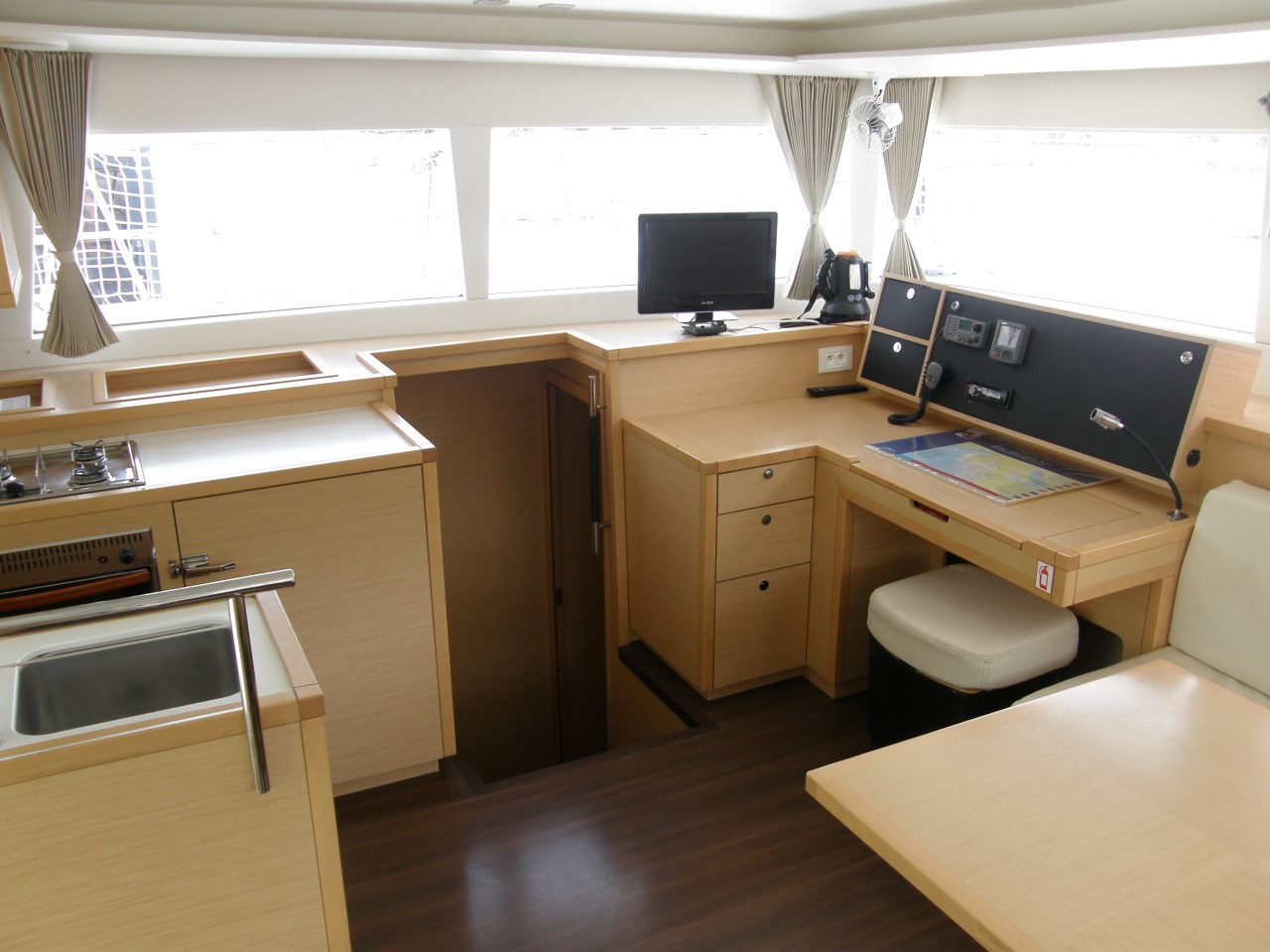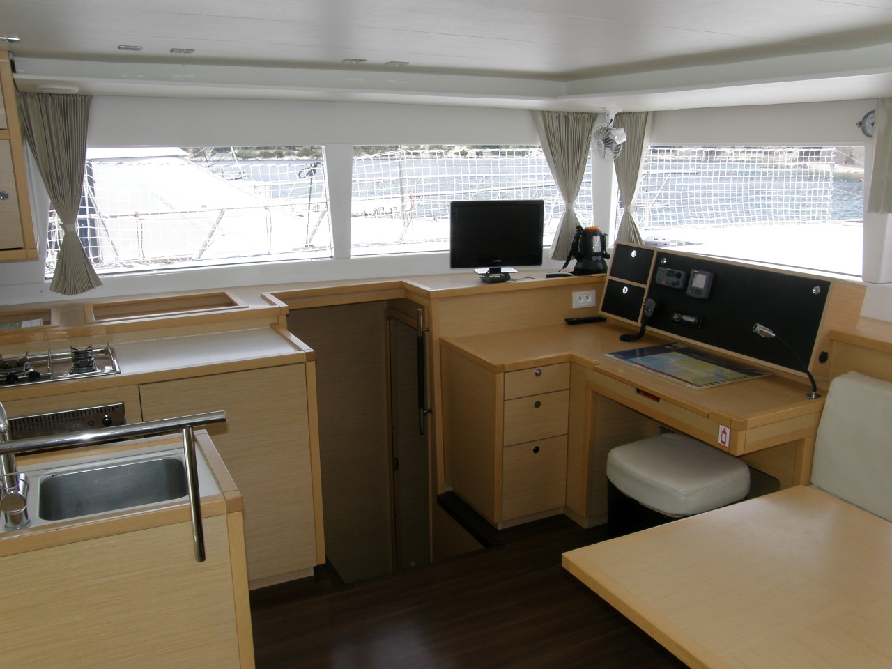 | Inside | Backofen, Borduhr, CD-Player, Fäkalientank, Gasherd mit Backofen, Heizung, Kühlschrank, Ladegerät, Landstromkabel, Luftpumpe für Beiboot, Pantryausstattung, Radio, Salontisch absenkbar, Spülbecken, Surround Sound-System, TV, Warmwasser, Wasserkocher, WC-Pumpe |