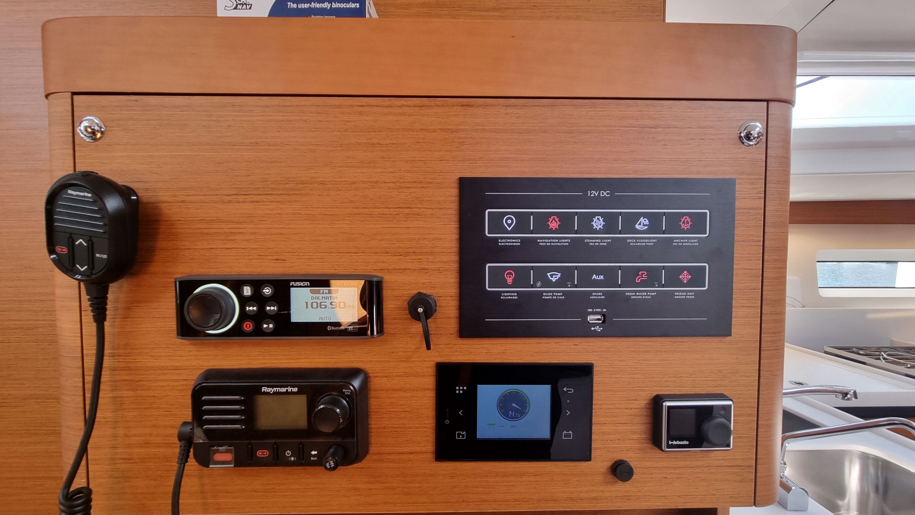 | Navigation | Barometer, Echolot, Fernglas, GPS mit Kartenplotter im Cockpit, Multifunktionstouchscreen, Navigationsbesteck, Seekarten, Sumlog, Tridata (Log, Echolot, Windm.), Windmesser |
