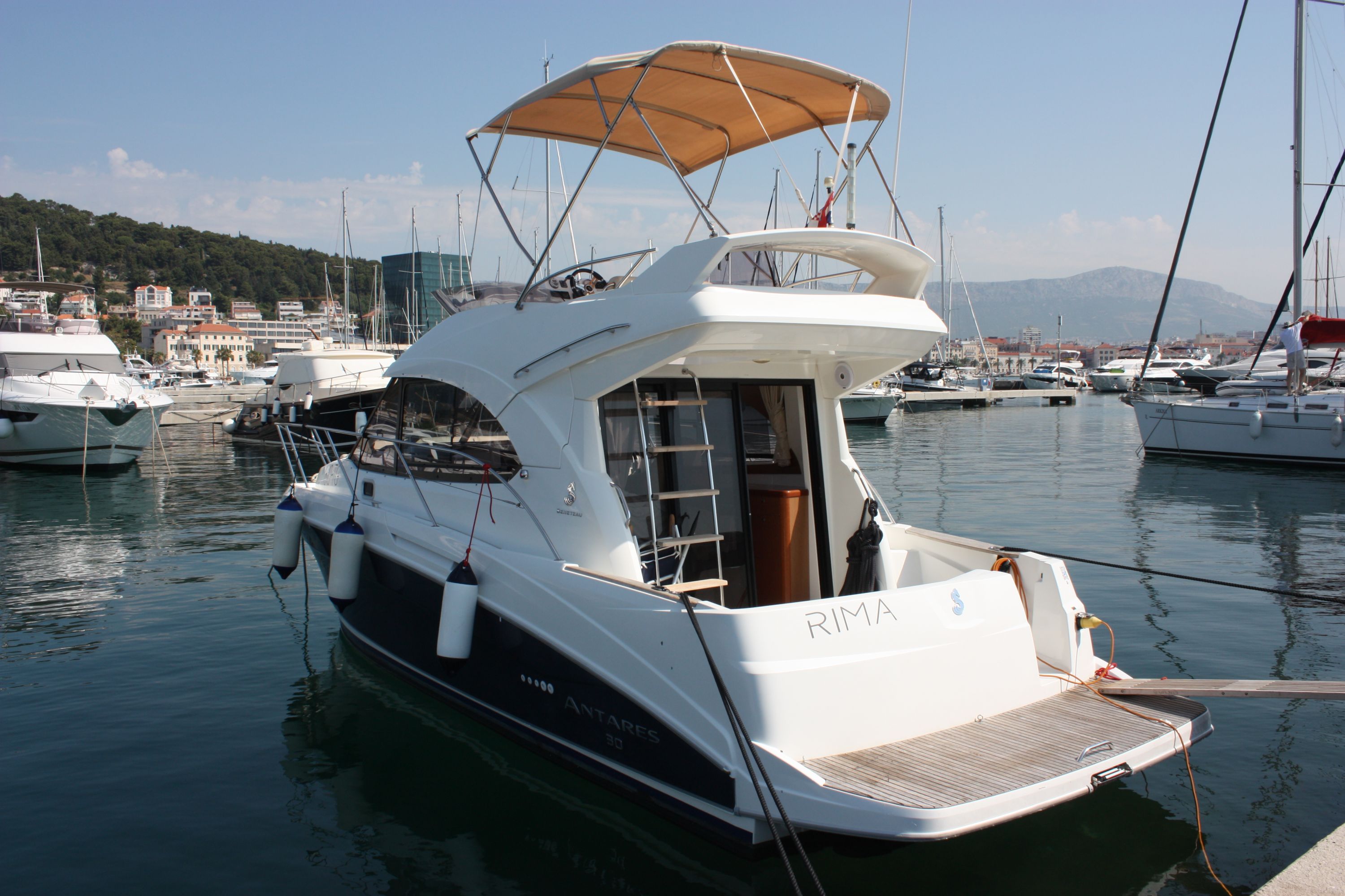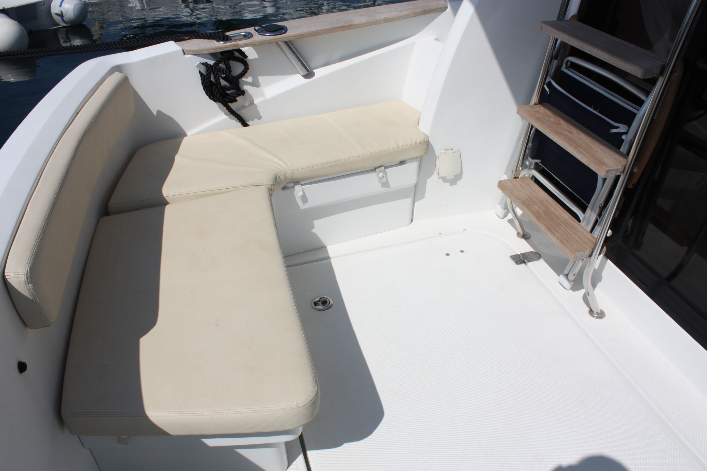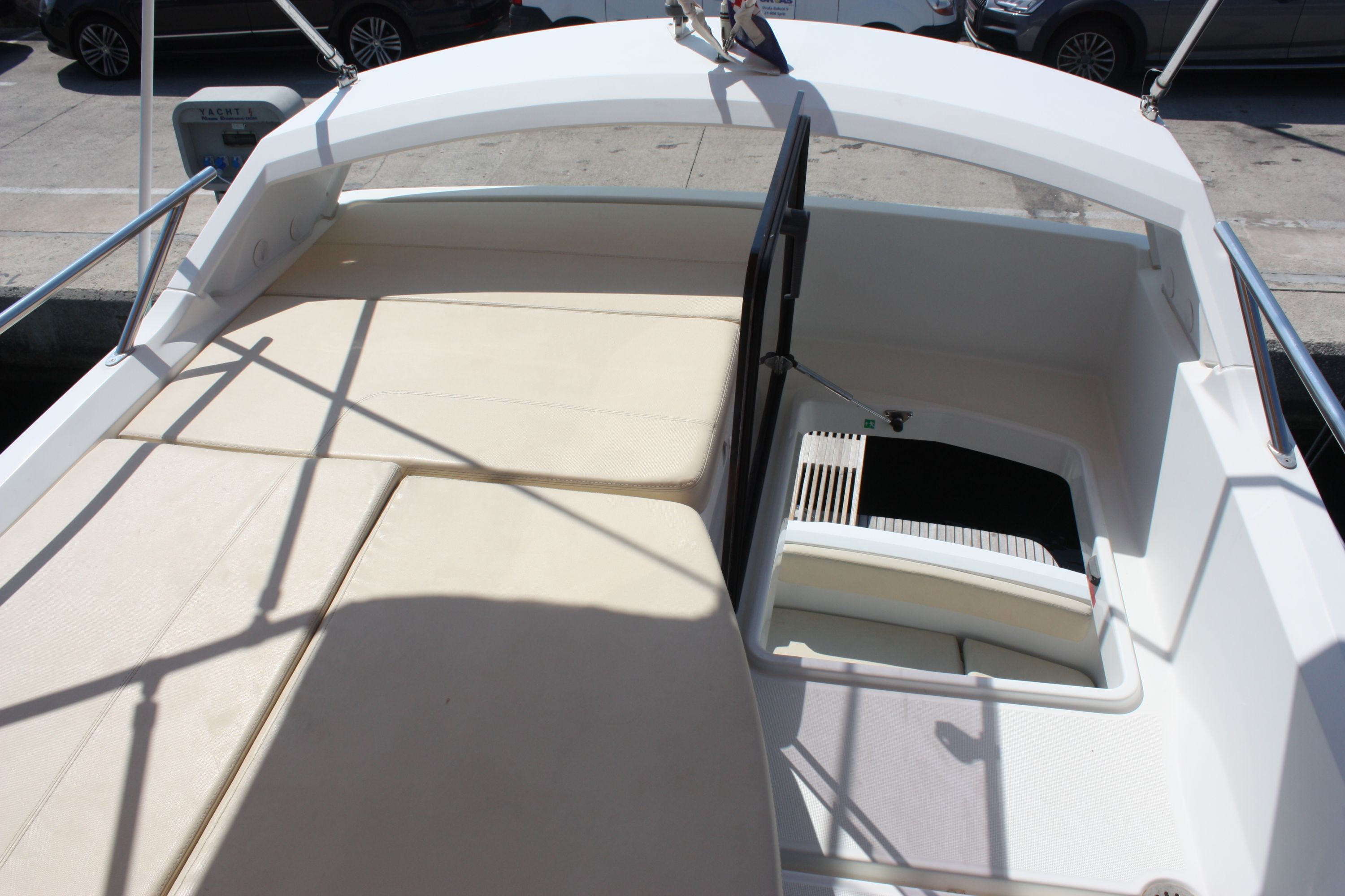 | Outside | 220 V-Landanschluss, Badeplattform, Cockpitdusche, Cockpittisch, hydraul. Gangway, Sonnensegel |