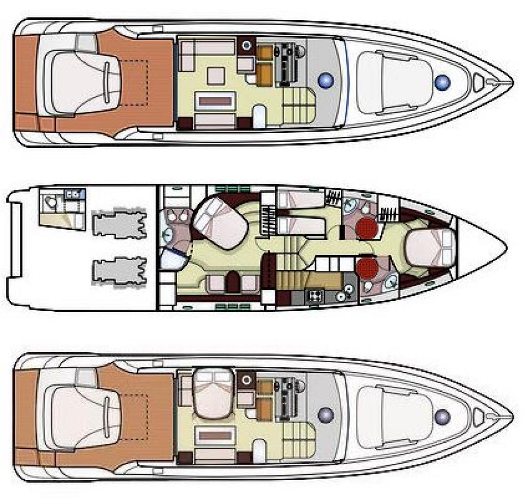 | Outside | Badeleiter, Badeplattform, Cockpittisch, Deckpolster, Grill, hydraul. Gangway, Schnorchelausrüstung, Sonnendeck, Sonnensegel |