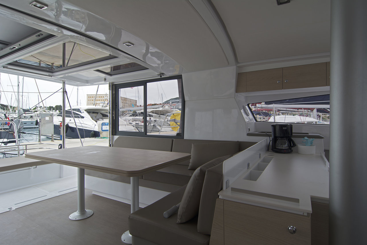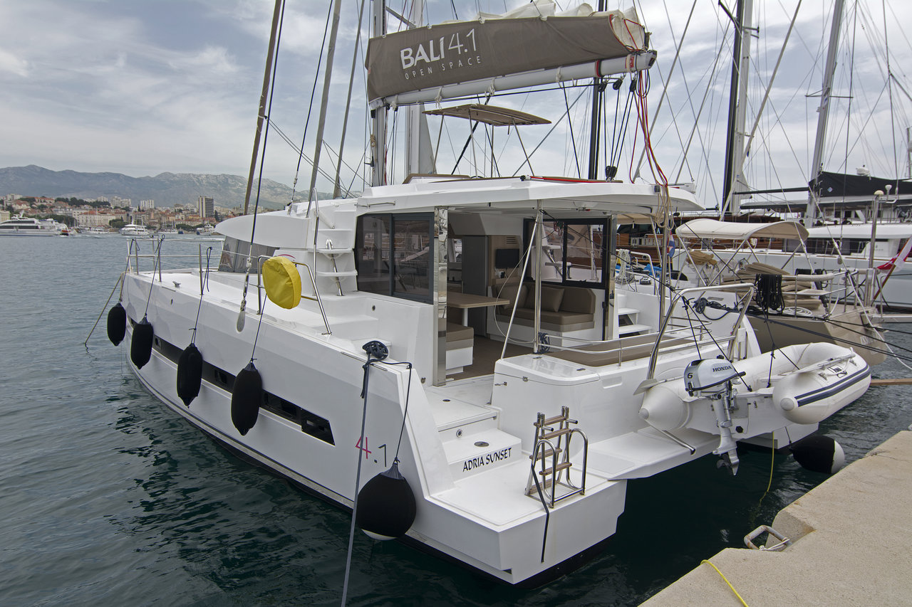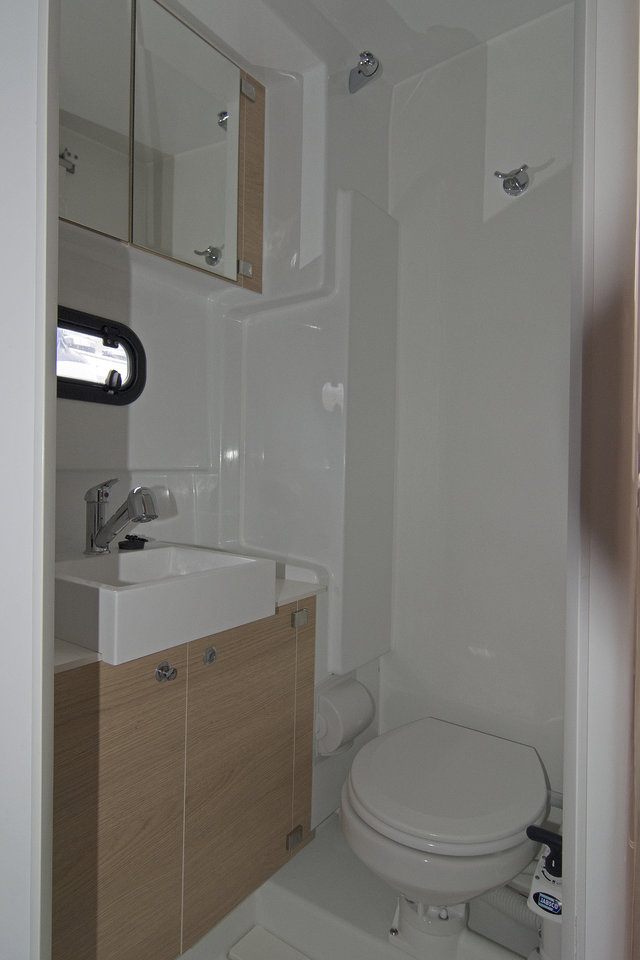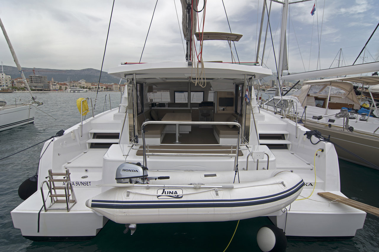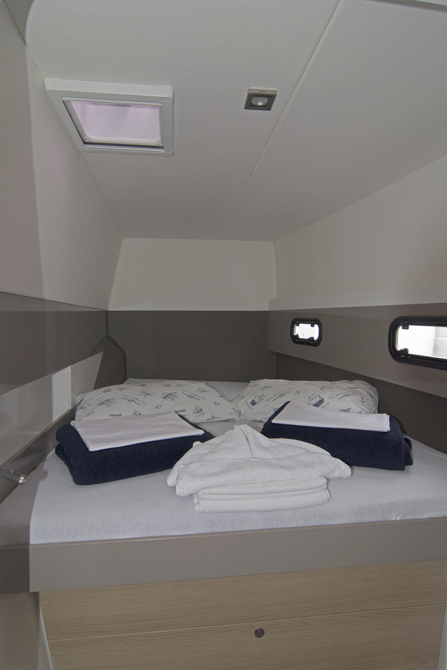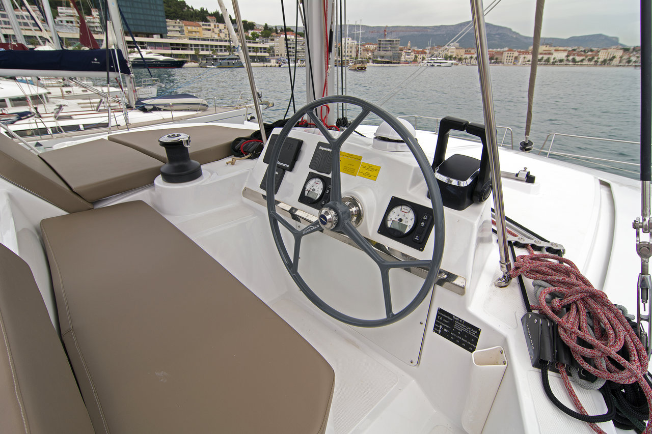 | Outside | 220 V-Landanschluss, Anker mit Kette, Biminitop, Cockpitdusche, Cockpitlautsprecher, Cockpitpolster, Cockpittisch, Deckpolster, Fender, Festmacherleinen, Gangway, Windex |