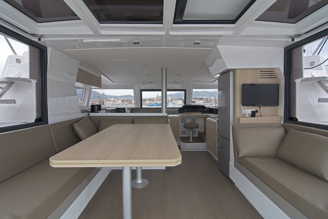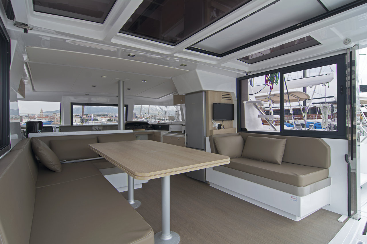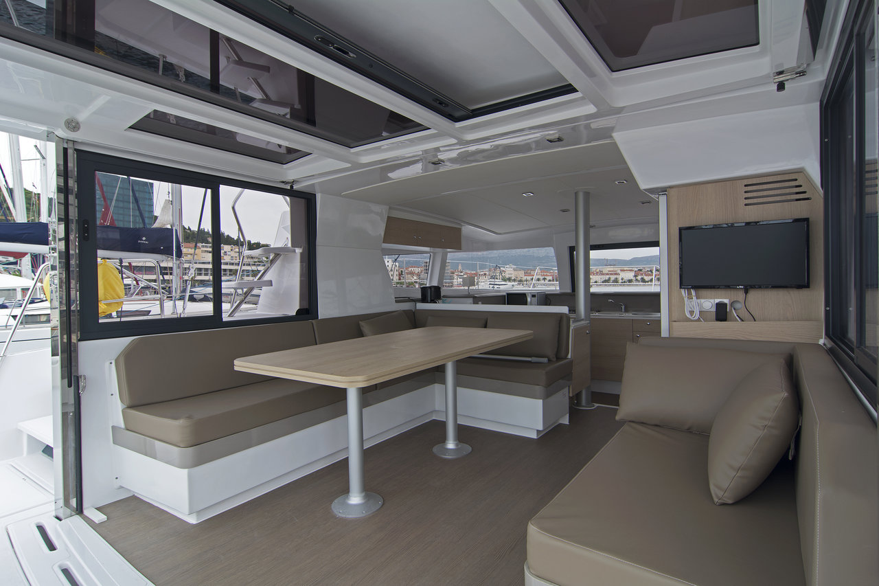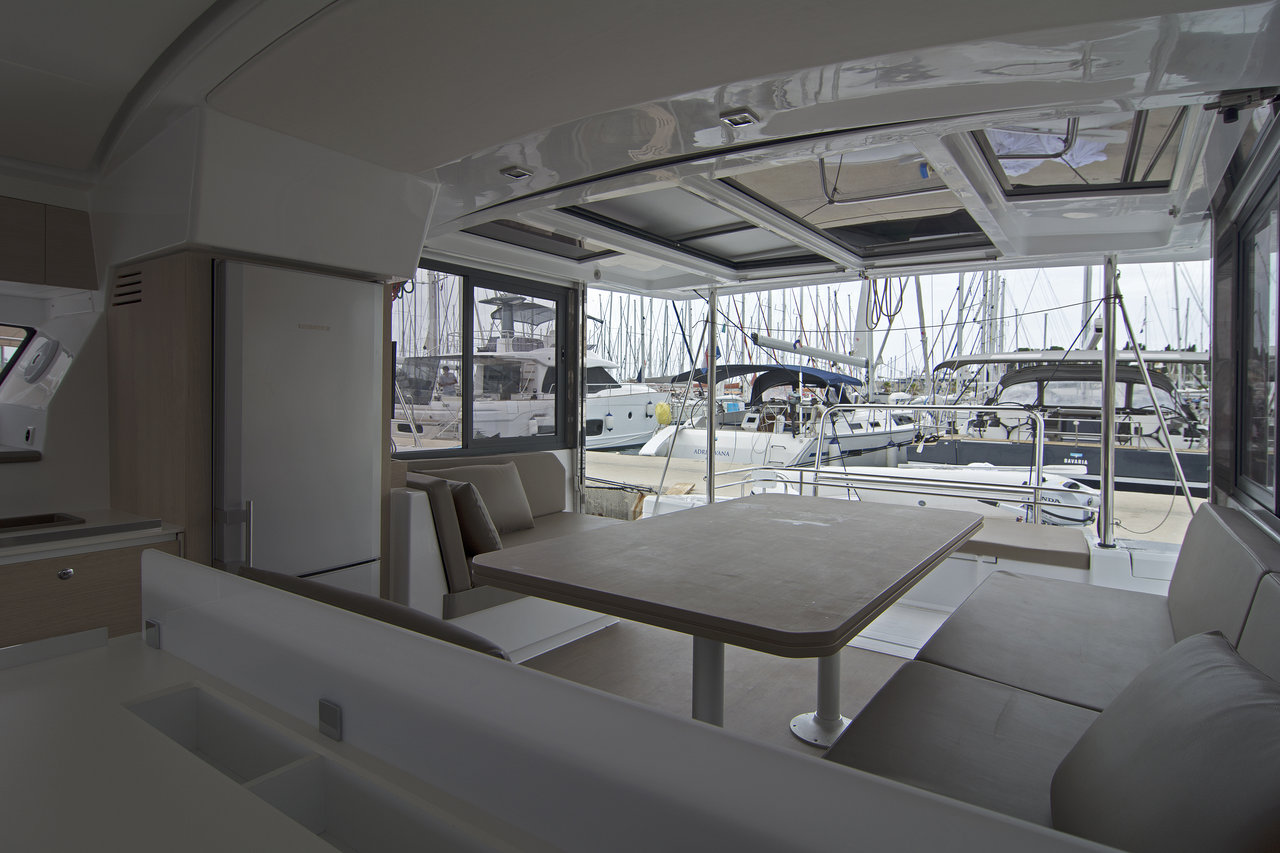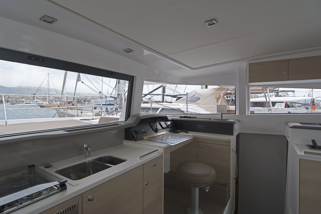 | Outside | 220 V-Landanschluss, Anker mit Kette, Biminitop, Cockpitdusche, Cockpitlautsprecher, Cockpitpolster, Cockpittisch, Deckpolster, Fender, Festmacherleinen, Gangway, Windex |