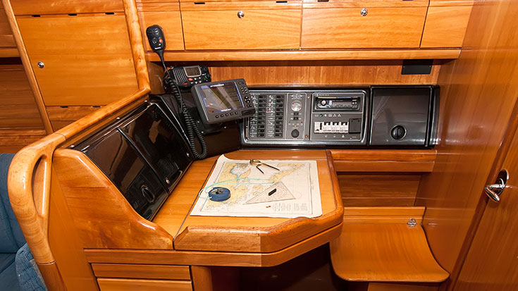 | Navigation | Barometer, Echolot, Fernglas, GPS mit Kartenplotter im Cockpit, Hafenhandbücher, Handpeilkompass, Kompass, Navigationsbesteck, Seekarten, Sumlog, Windmesser |