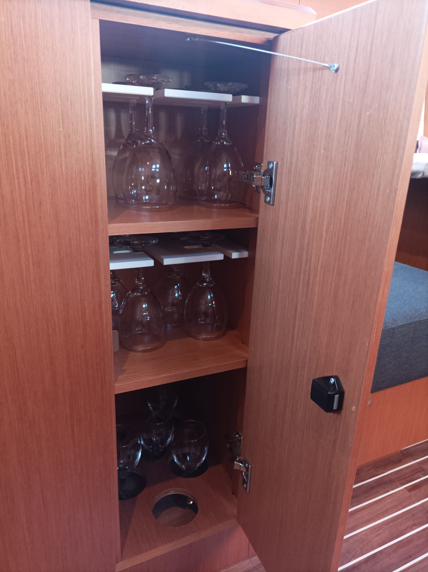 | Outside | 220 V-Landanschluss, Badeleiter, Badeplattform, Biminitop, Cockpitdusche, Cockpitlautsprecher, Cockpitpolster, Cockpittisch, elektr. Ankerwinsch, Fender, Gangway, Solaranlage, Sprayhood, Tendergarage |