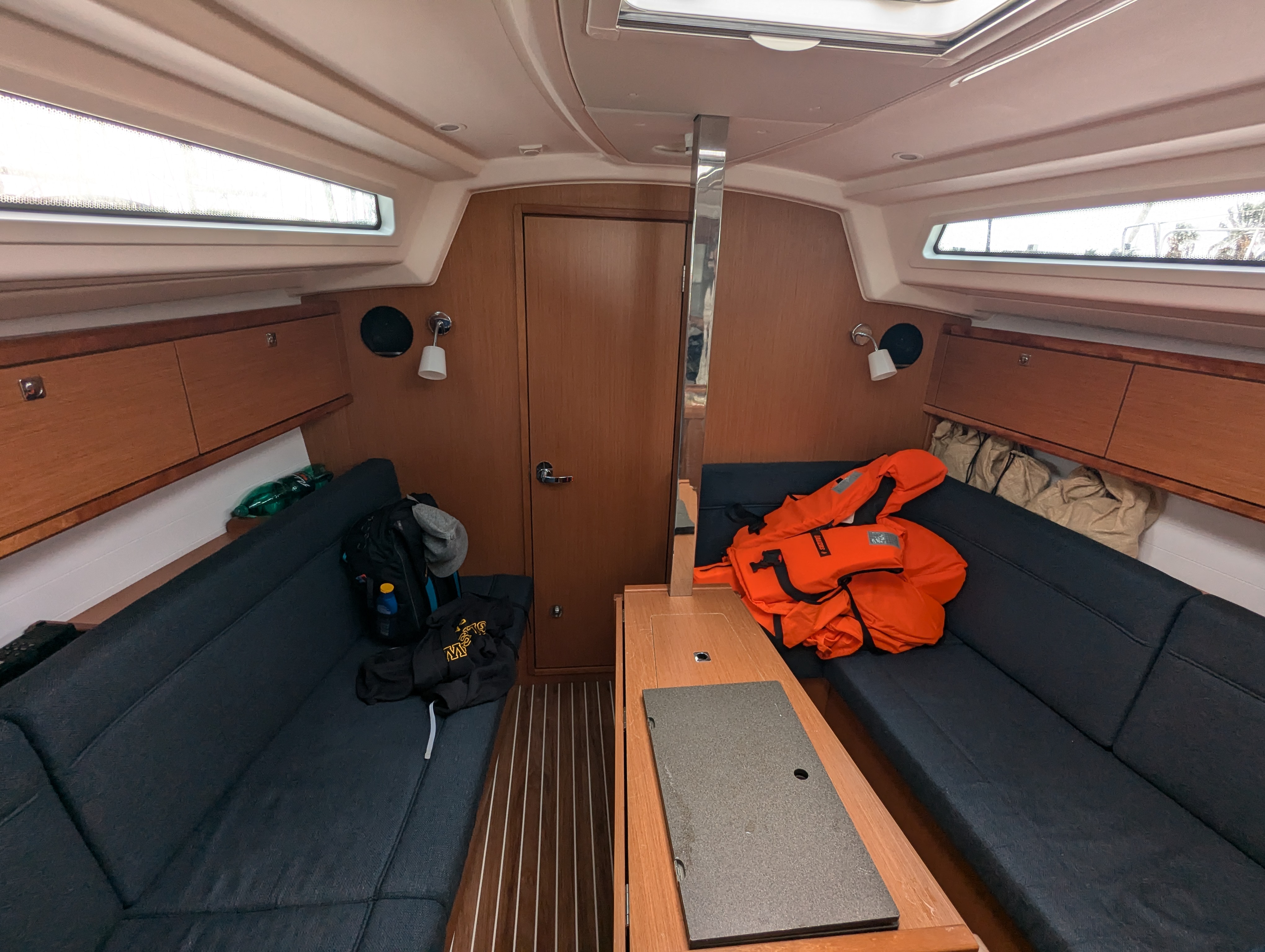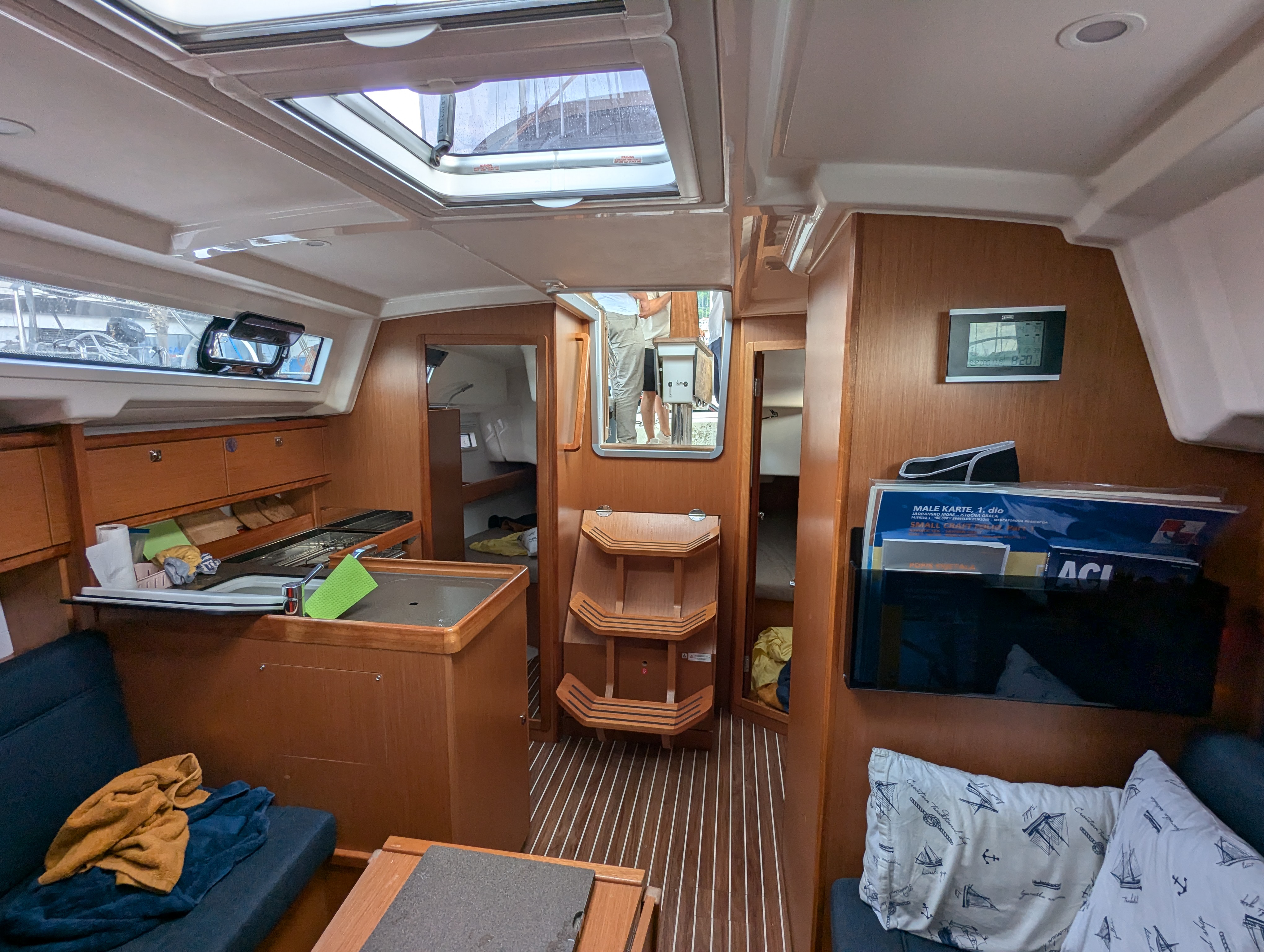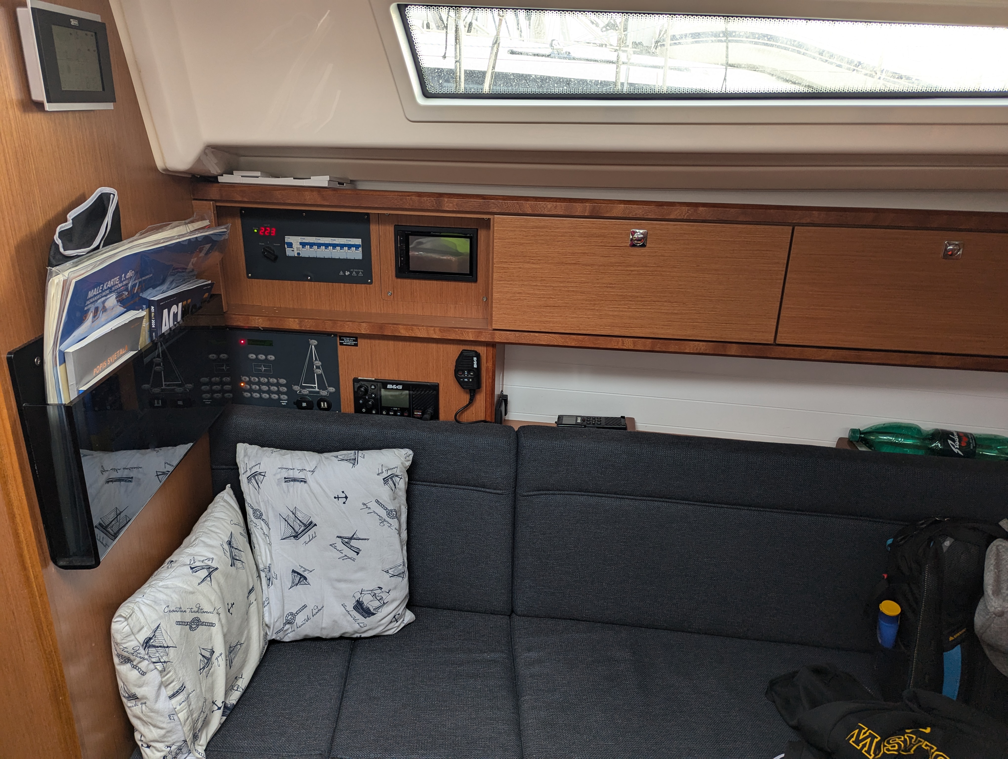 | Navigation | Barometer, Fernglas, GPS mit Kartenplotter im Cockpit, Hafenhandbücher, Handpeilkompass, Kompass, Navigationsbesteck, Seekarten, Tridata (Log, Echolot, Windm.) |