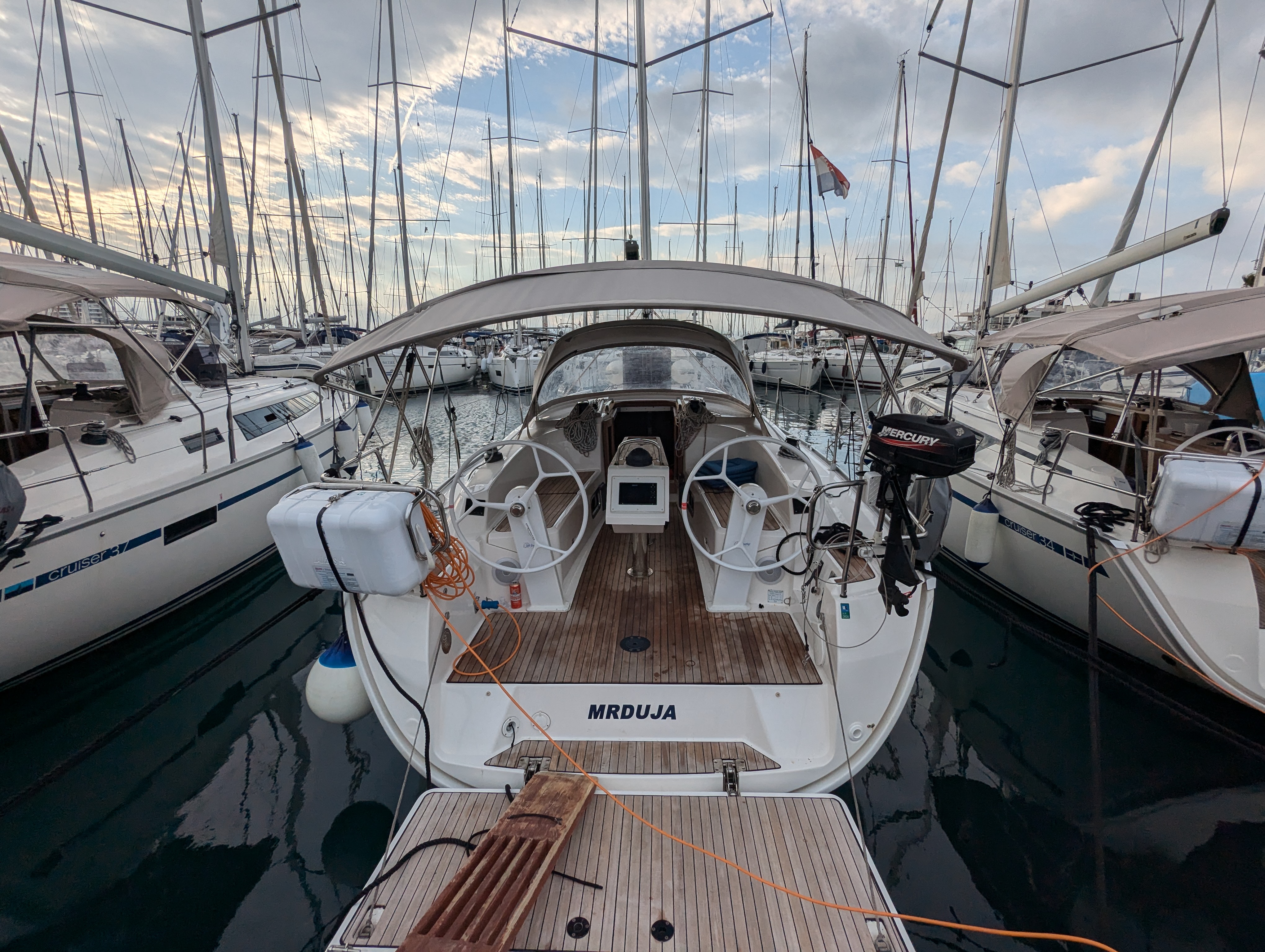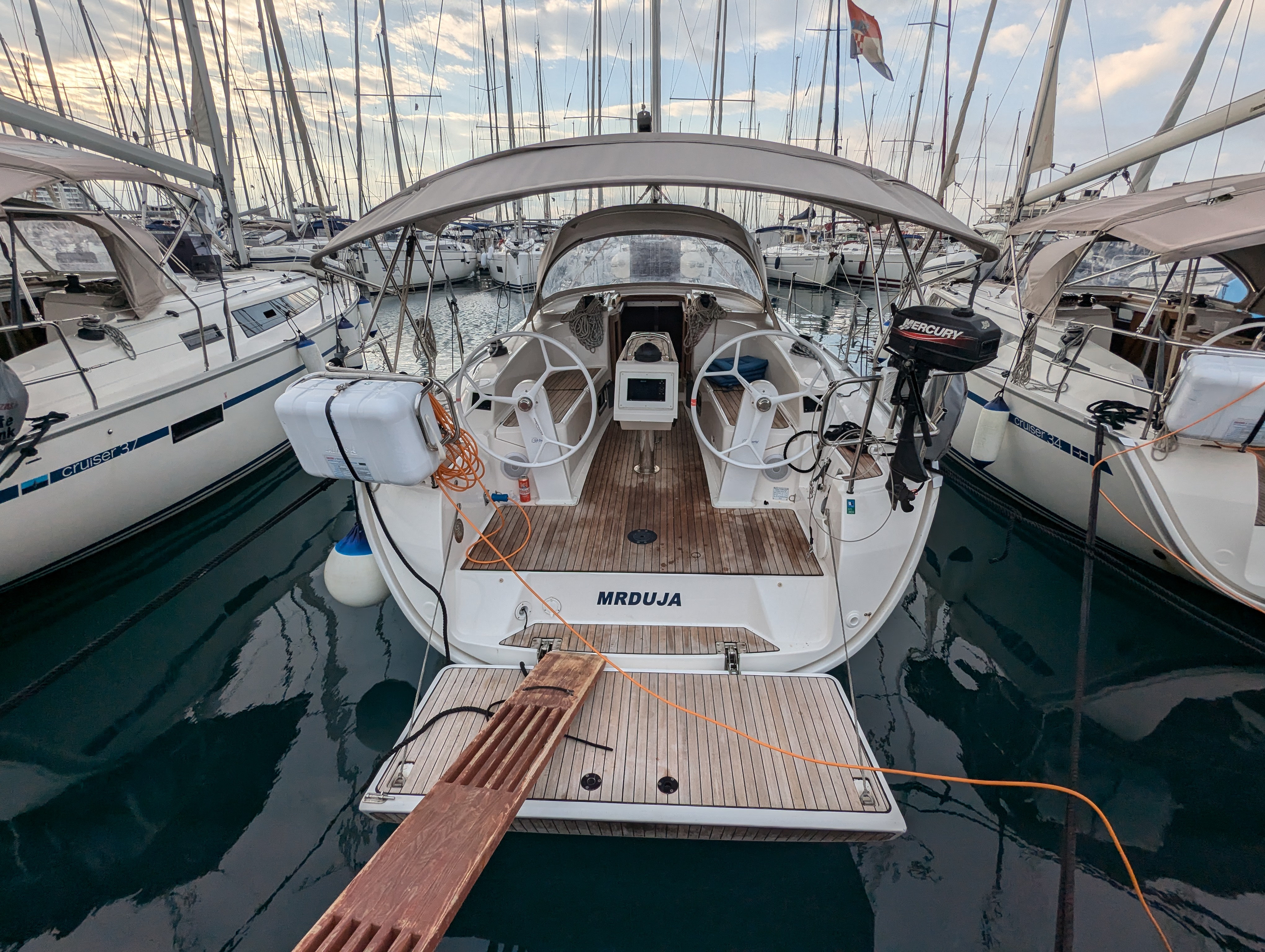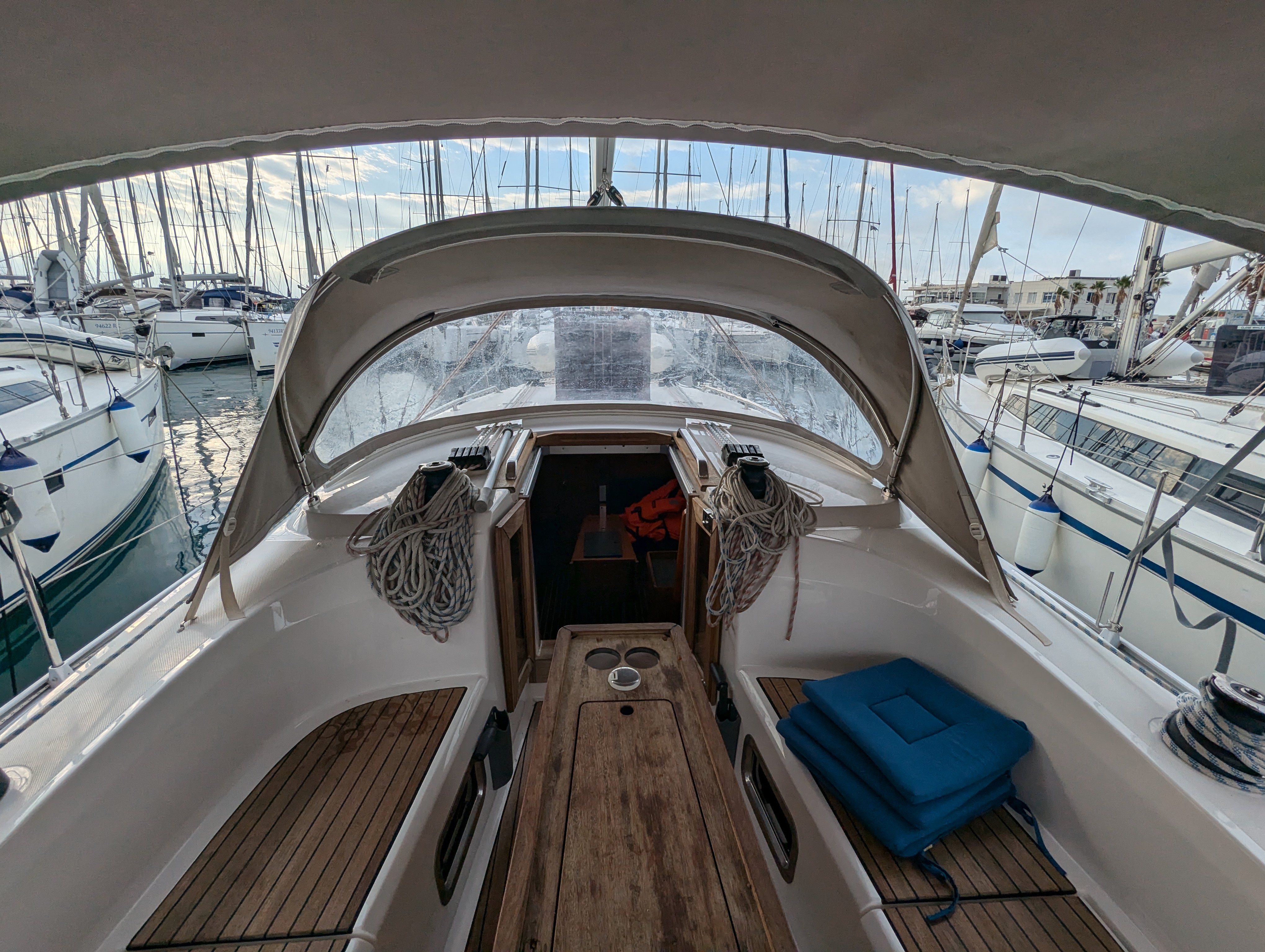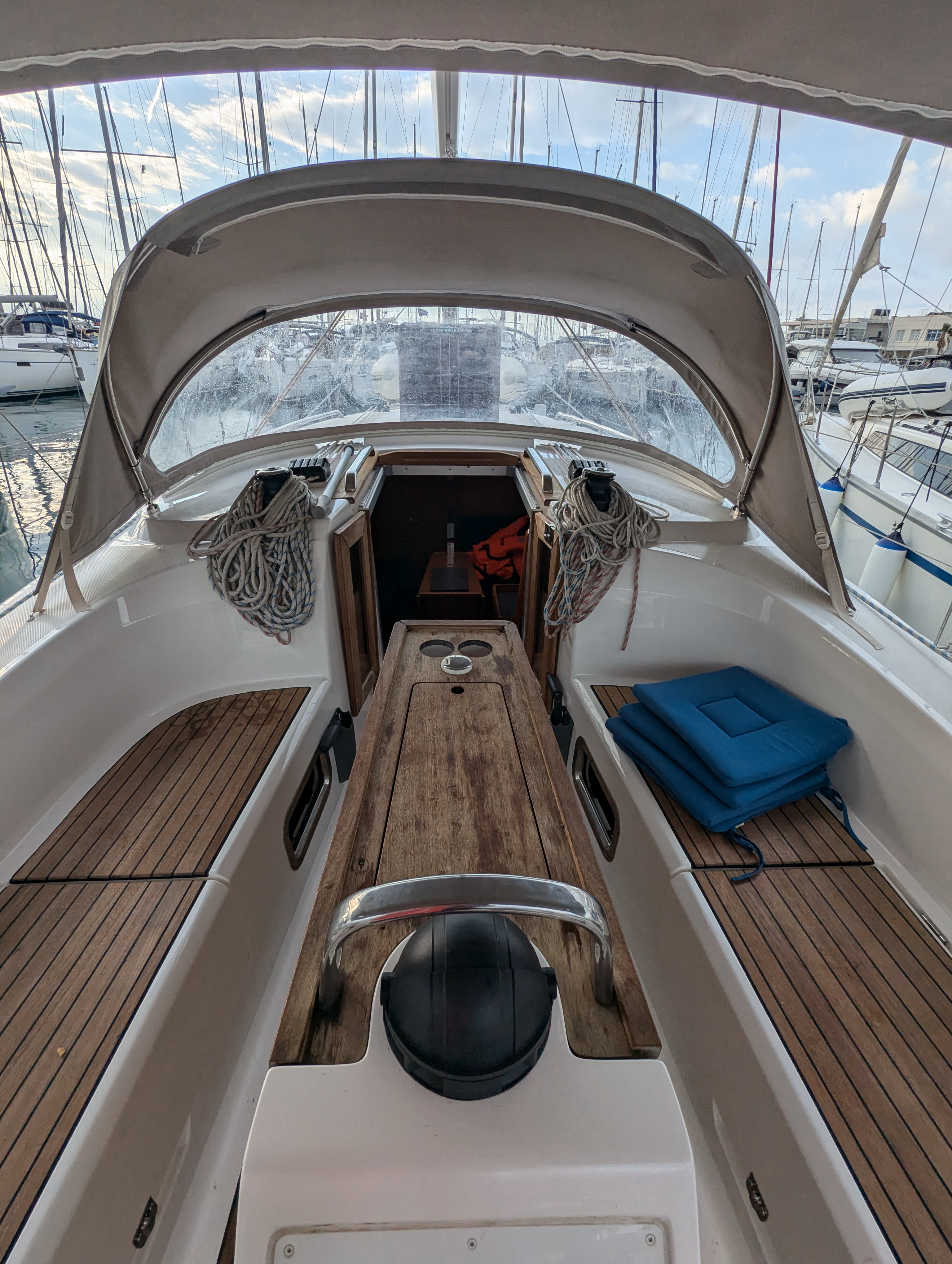 | Outside | 12 V-Anschluss, Anker mit Kette, Badeleiter, Badeplattform, Biminitop, Bootshaken, Cockpitdusche, Cockpitlautsprecher, Cockpitpolster, Cockpittisch, Deckbürste, Dieselkanister , elektr. Ankerwinsch, Fender, Festmacherleinen, Gangway, Kunststoff-Eimer (Pütz), Solaranlage, Sprayhood, Teak im Cockpit, Wasserschlauch, Windex, Winschen |