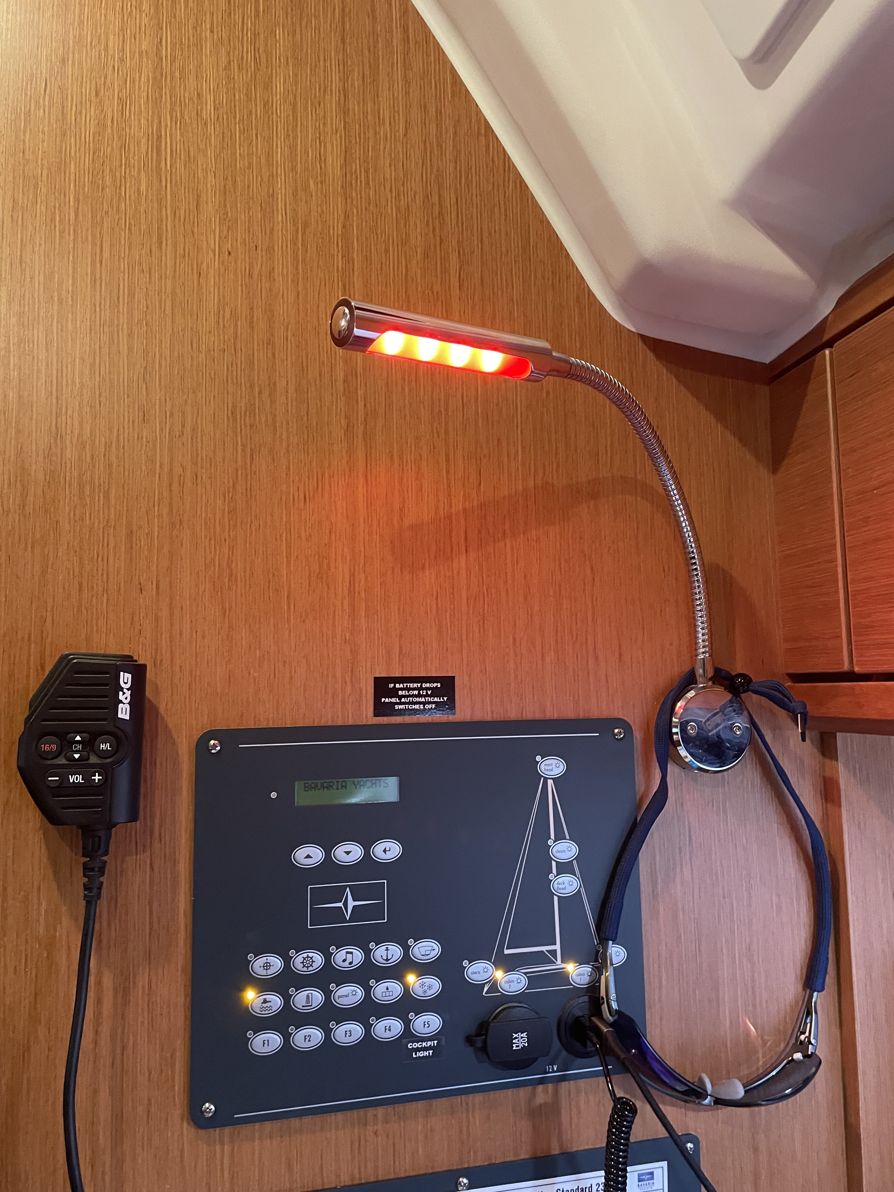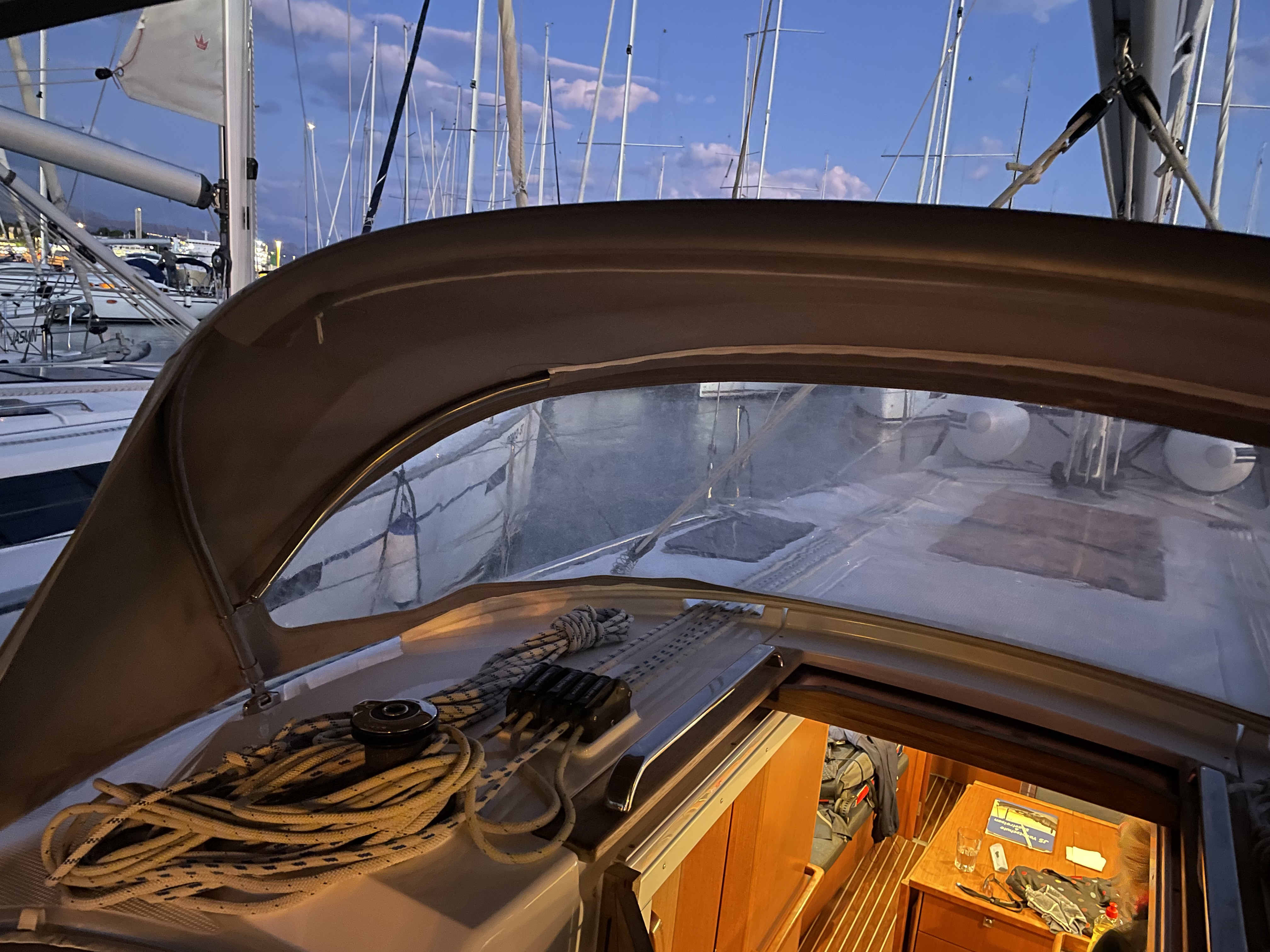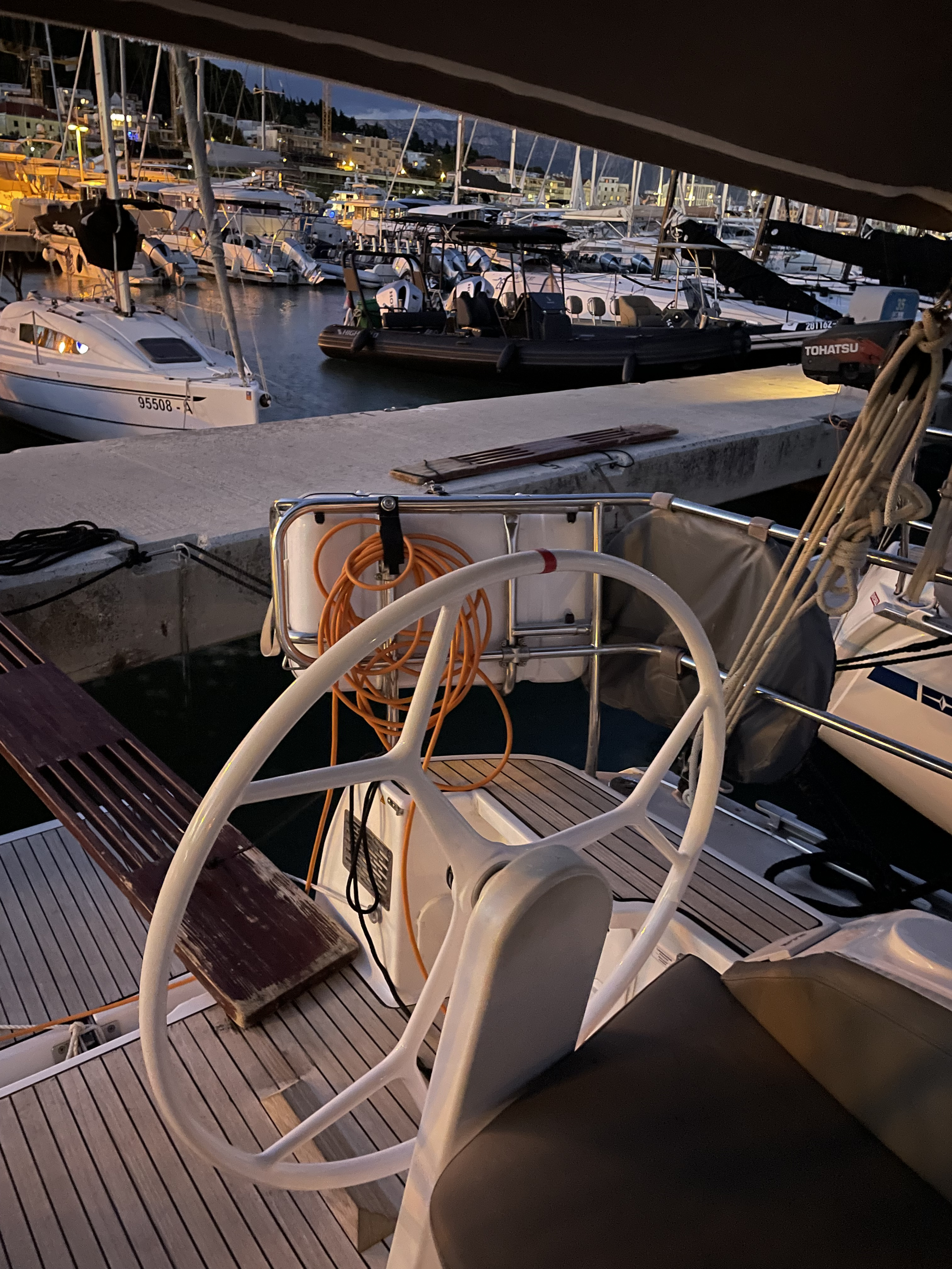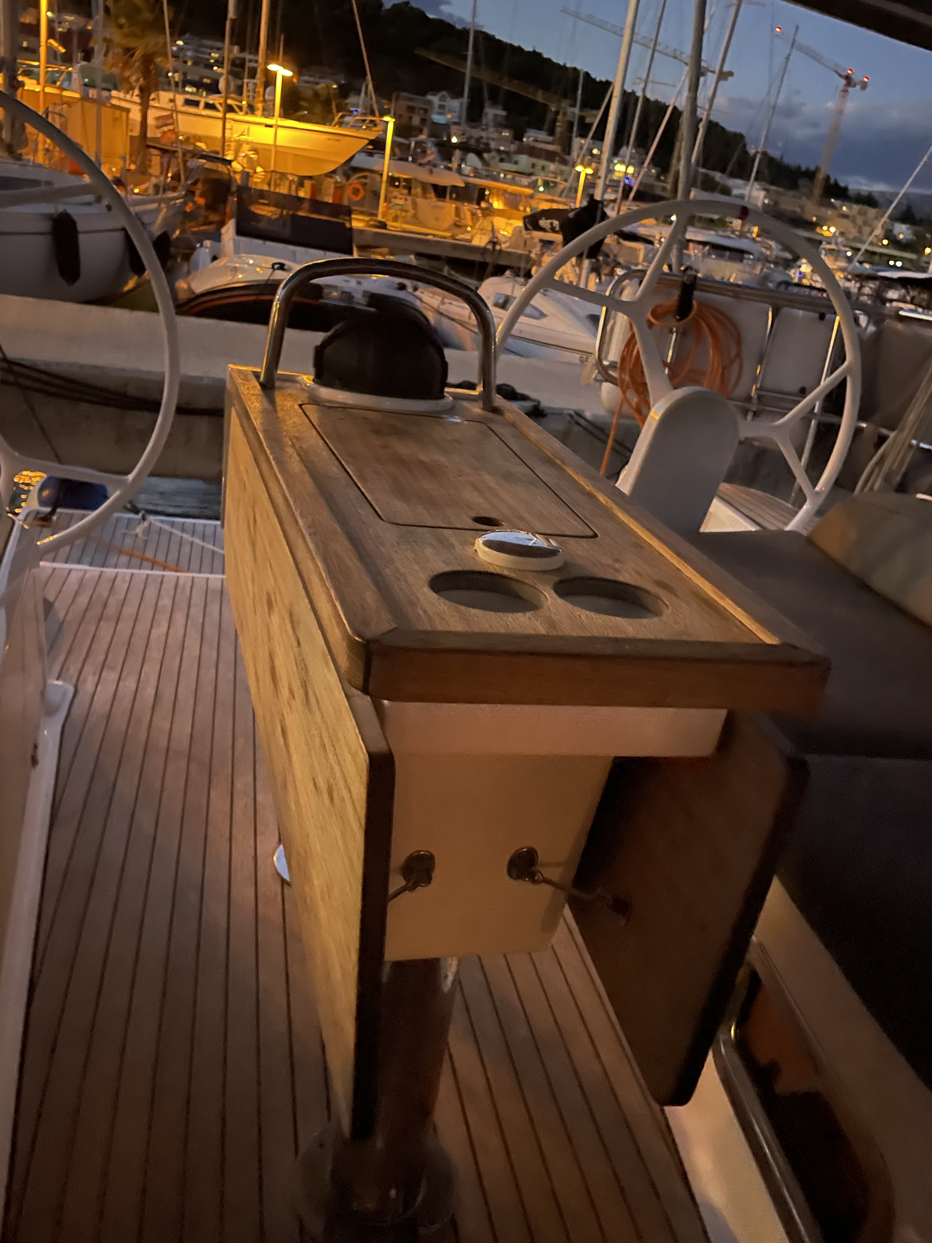 Viel Positives: Sehr gepflegtes Schiff auch in vielen Details. Sehr aufgeräumt, hier wird sich gekümmert. Endlich mal eine clevere Abspannung des Bimini nach achtern (Foto). Nichts im Weg, wenn man z.B. den Außenborder für das Dinghi abnehmen möchte. Der Außenborder, alter Mercury 2-Takter, aber super gepflegt , funktioniert sehr zuverlässig. Steuer aus Carbon, sehr angenehm in der Haptik. Leinen top, Segel gut in der Bedienung fast ausschließlich aus dem Cockpit heraus. Sprayhood einfach und schnell zu bedienen. Innen gute Aufteilung, viel Stauraum, erstklassige Seitenluken mit vier Riegeln, die fast plan zur Außenwand sind und absolut dicht schließen. Aufnahme an der Reling für die Gangway während der Fahrt, stabil und für schnelle Befestigung, neuwertiges Dinghi, Einweisung top durch Stipe, hat sich auch danach u.a. nochmal speziell um die elektrische Toilette gekümmert. Guter stabiler Holztisch im Cockpit, statt des oft verwendeten Plastikdesigns, prima. Instrumente von B@G sehr gute Funktion, auch wenn nicht ganz so selbsterklärend wie die von Raymarine. GPS an Mittelkonsole genau richtig. Sehr gute Solaranlage mit Energieanzeige am Kartentisch, Funkgerät mit zusätzlichem Handgerät, guter Kartensatz von 2022, viel Stauraum. Bedienpult Beleuchtung von Bavaria (Segelschiff Kontur) weiterhin mit das Beste im Vergleich, simpel, eindeutig, sofort verständlich. Gute, stabile Bedienung des Bugstrahlruders. Schöne Zusatzlampen am Kartentisch und in den Kabinen mit blendfreier Rotlichtfunktion.