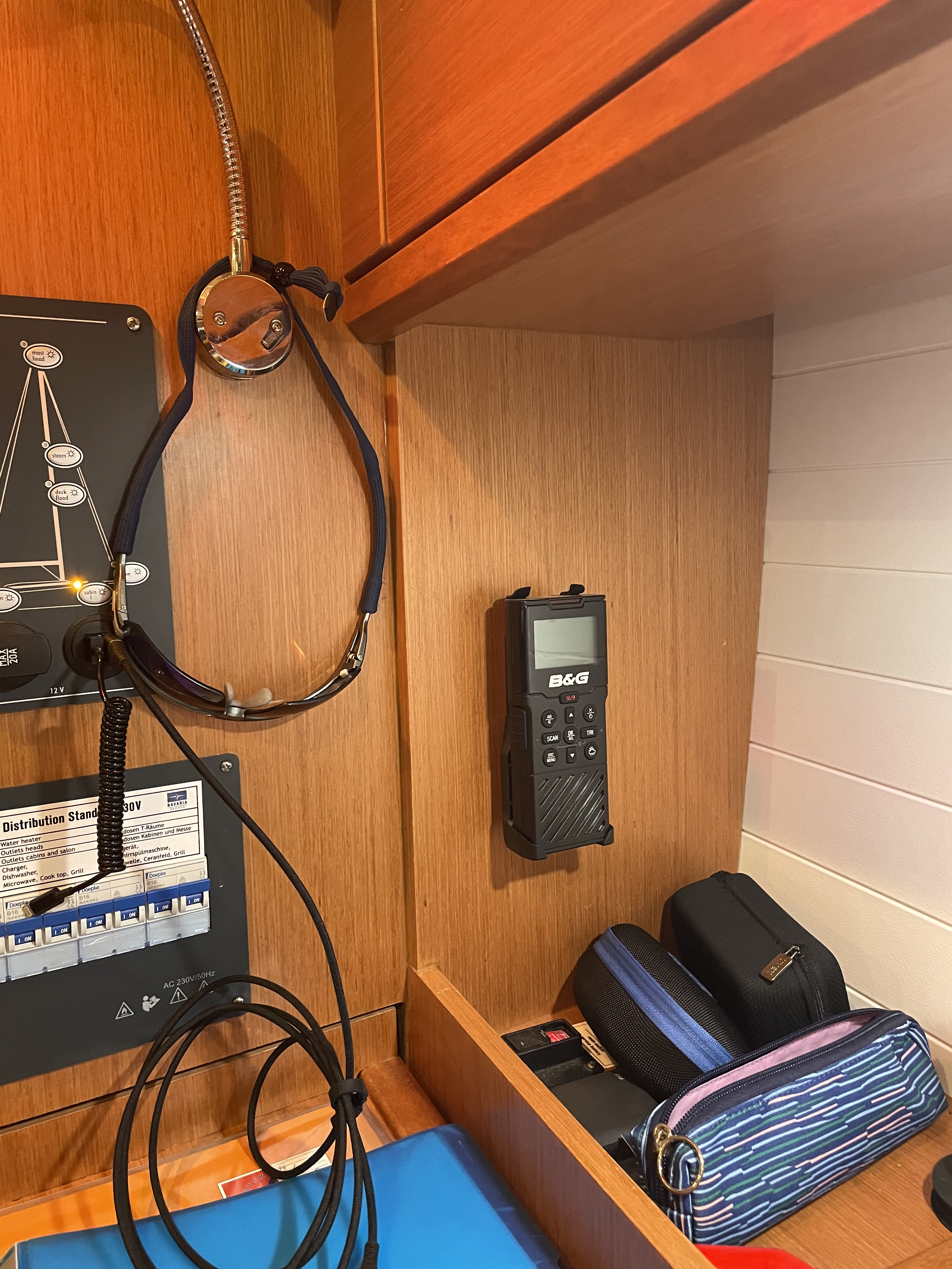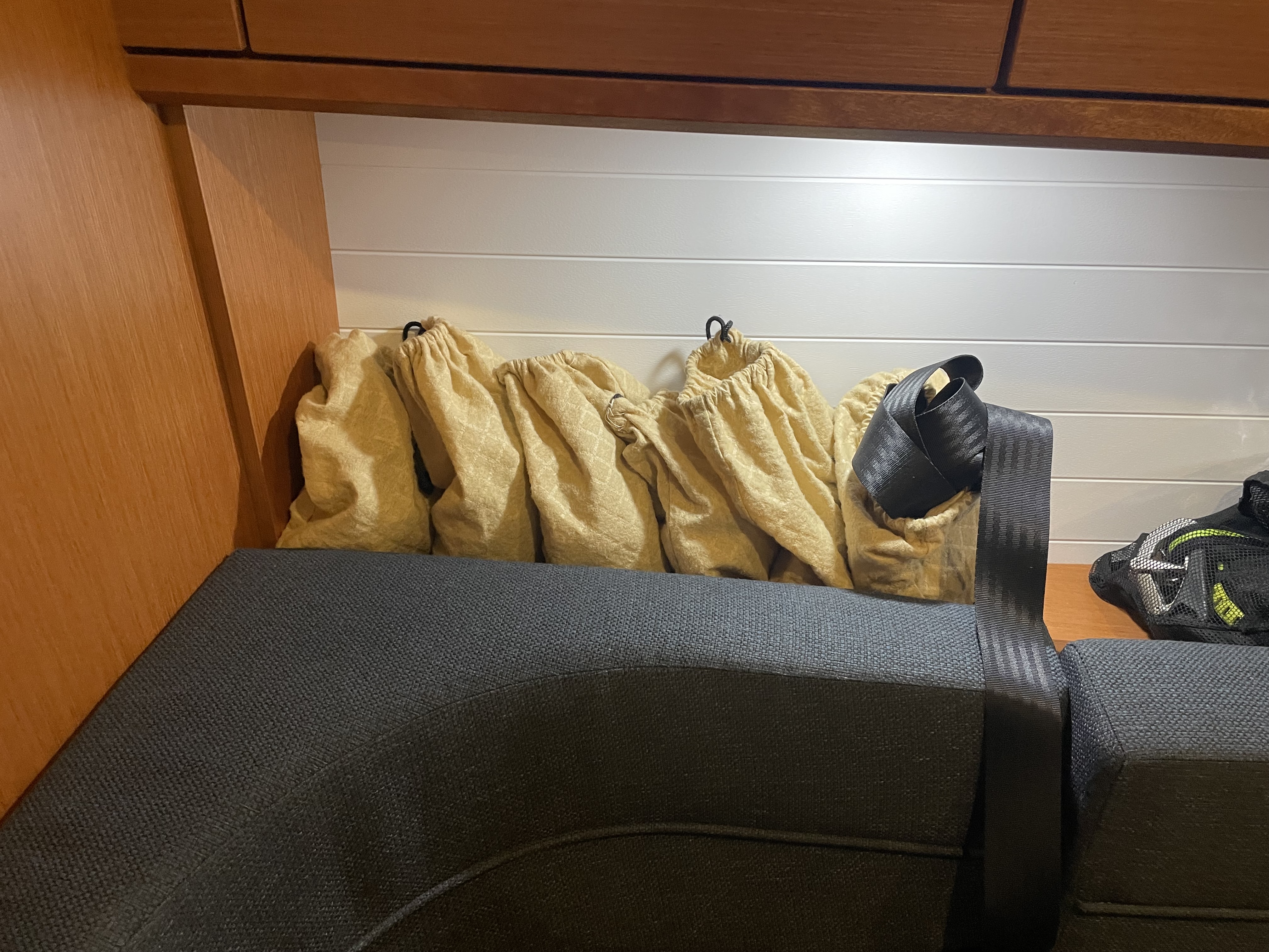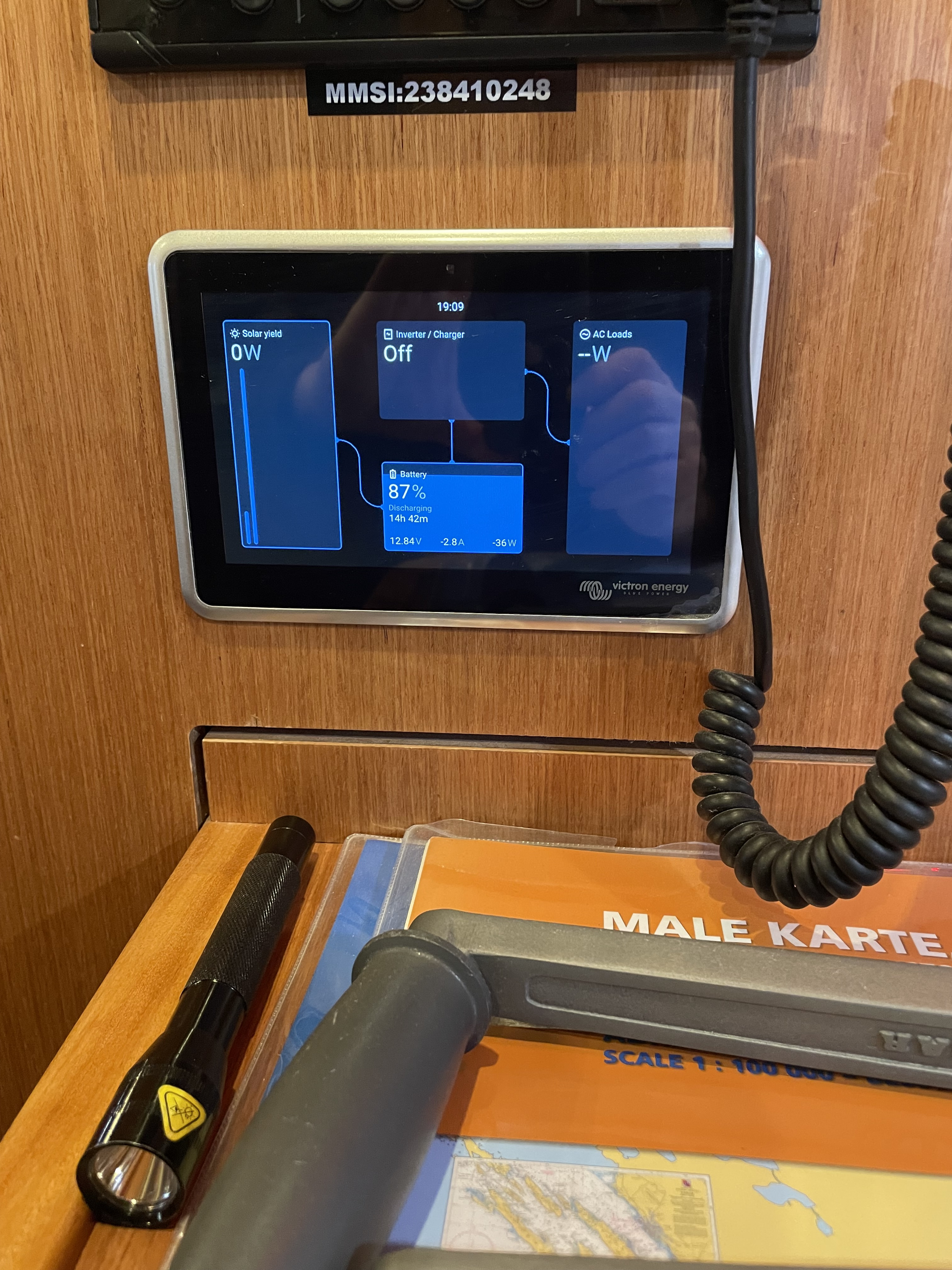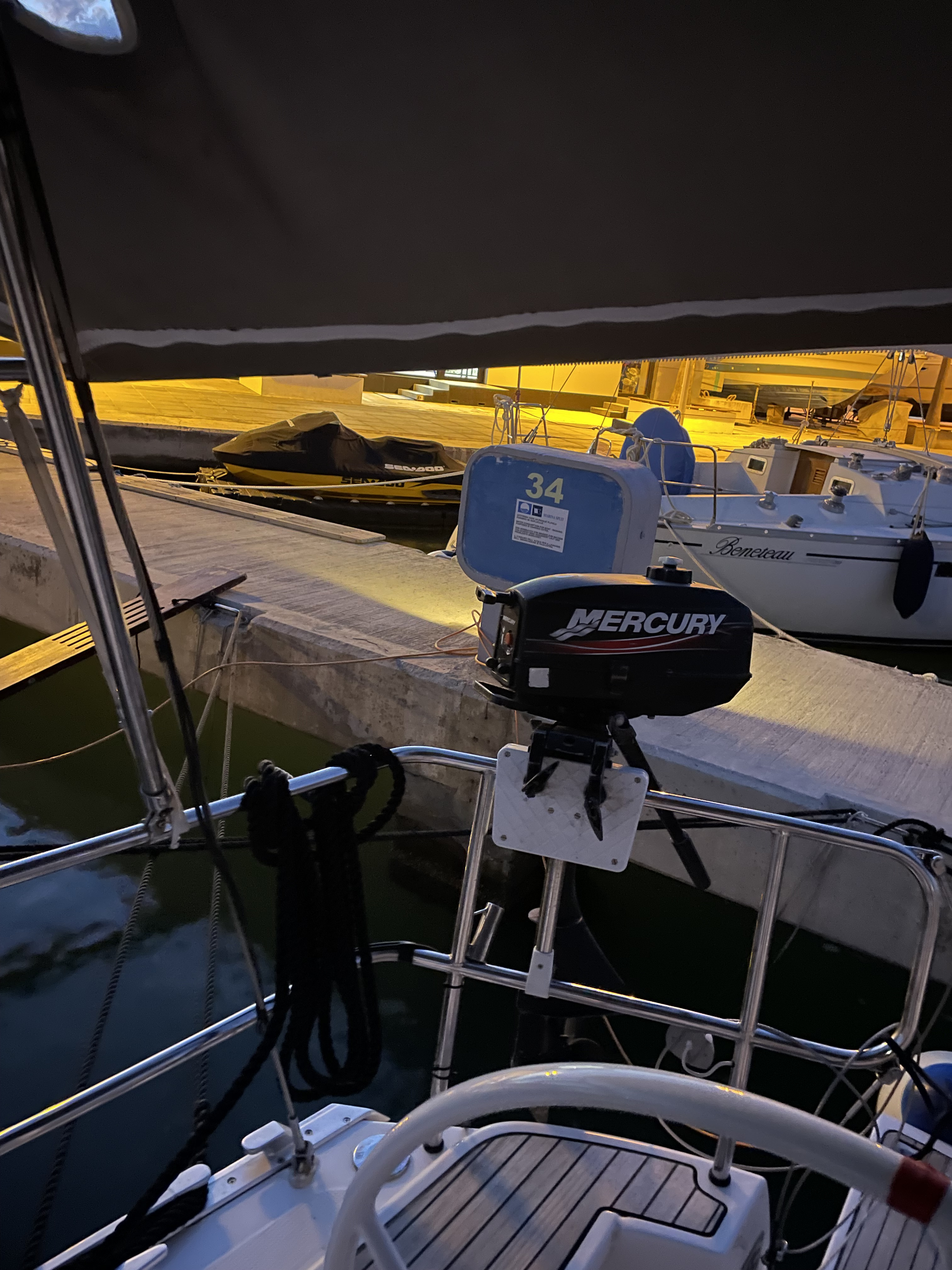 Viel Positives: Sehr gepflegtes Schiff auch in vielen Details. Sehr aufgeräumt, hier wird sich gekümmert. Endlich mal eine clevere Abspannung des Bimini nach achtern (Foto). Nichts im Weg, wenn man z.B. den Außenborder für das Dinghi abnehmen möchte. Der Außenborder, alter Mercury 2-Takter, aber super gepflegt , funktioniert sehr zuverlässig. Steuer aus Carbon, sehr angenehm in der Haptik. Leinen top, Segel gut in der Bedienung fast ausschließlich aus dem Cockpit heraus. Sprayhood einfach und schnell zu bedienen. Innen gute Aufteilung, viel Stauraum, erstklassige Seitenluken mit vier Riegeln, die fast plan zur Außenwand sind und absolut dicht schließen. Aufnahme an der Reling für die Gangway während der Fahrt, stabil und für schnelle Befestigung, neuwertiges Dinghi, Einweisung top durch Stipe, hat sich auch danach u.a. nochmal speziell um die elektrische Toilette gekümmert. Guter stabiler Holztisch im Cockpit, statt des oft verwendeten Plastikdesigns, prima. Instrumente von B@G sehr gute Funktion, auch wenn nicht ganz so selbsterklärend wie die von Raymarine. GPS an Mittelkonsole genau richtig. Sehr gute Solaranlage mit Energieanzeige am Kartentisch, Funkgerät mit zusätzlichem Handgerät, guter Kartensatz von 2022, viel Stauraum. Bedienpult Beleuchtung von Bavaria (Segelschiff Kontur) weiterhin mit das Beste im Vergleich, simpel, eindeutig, sofort verständlich. Gute, stabile Bedienung des Bugstrahlruders. Schöne Zusatzlampen am Kartentisch und in den Kabinen mit blendfreier Rotlichtfunktion.
