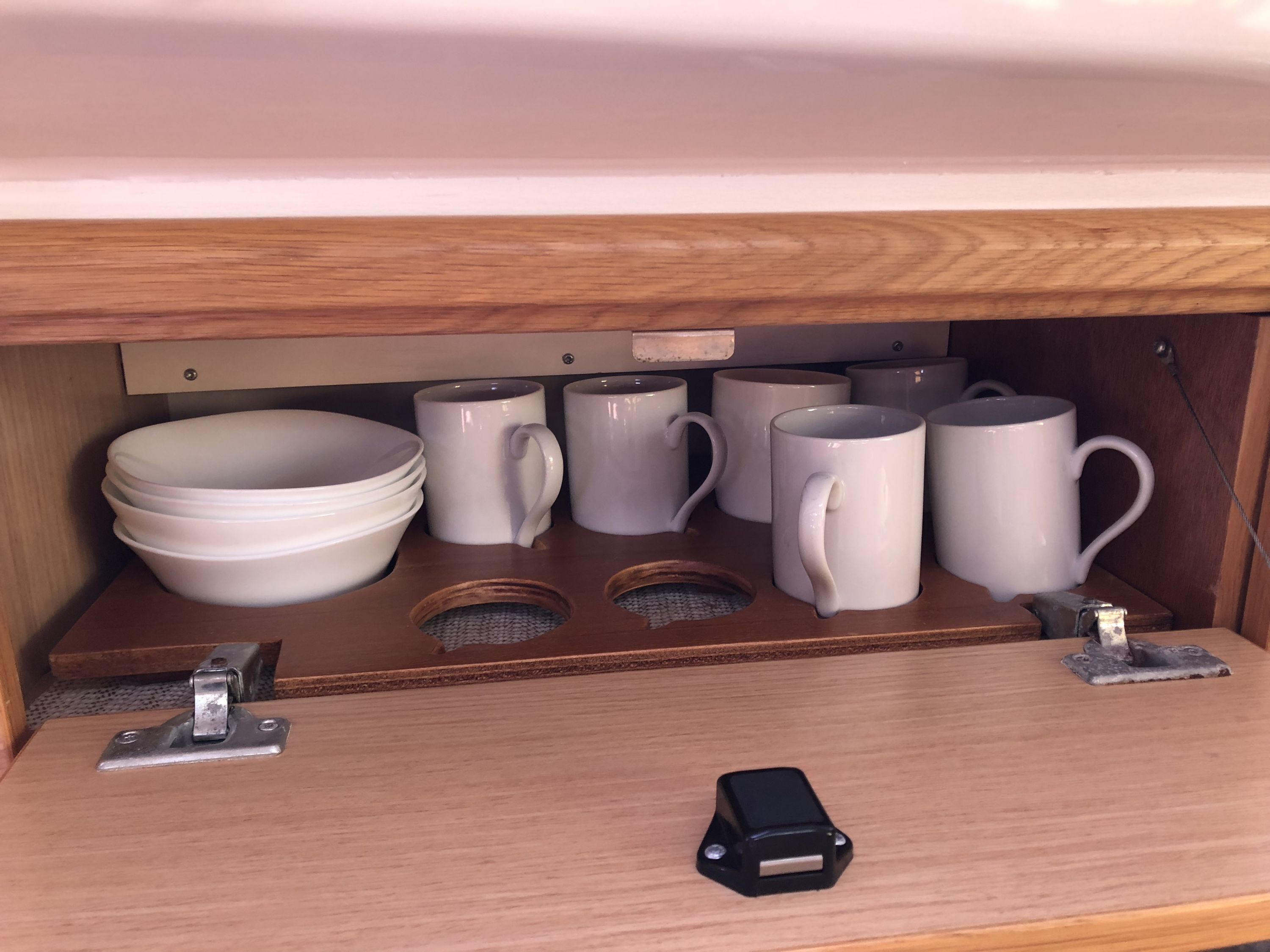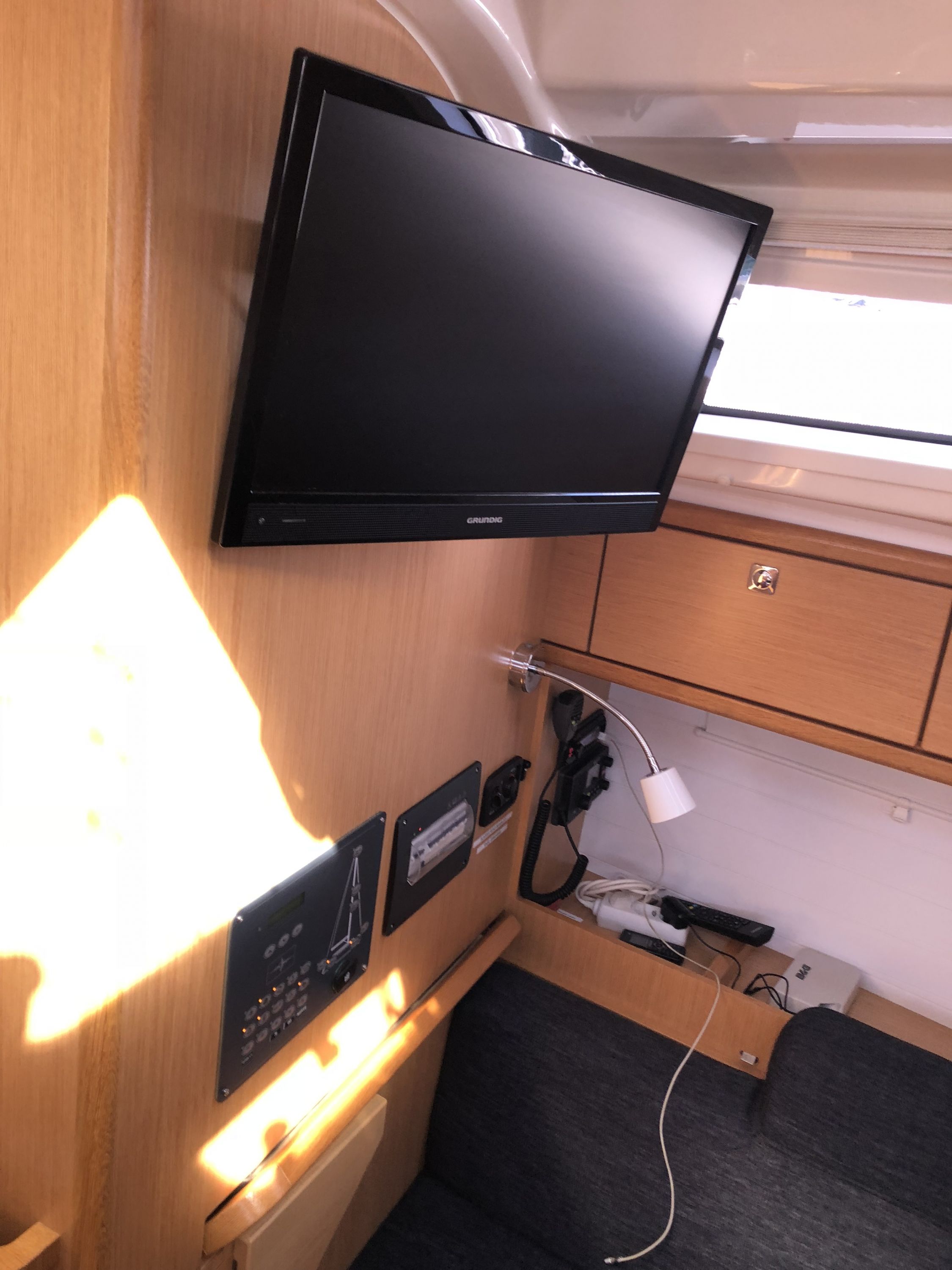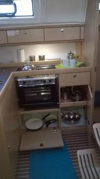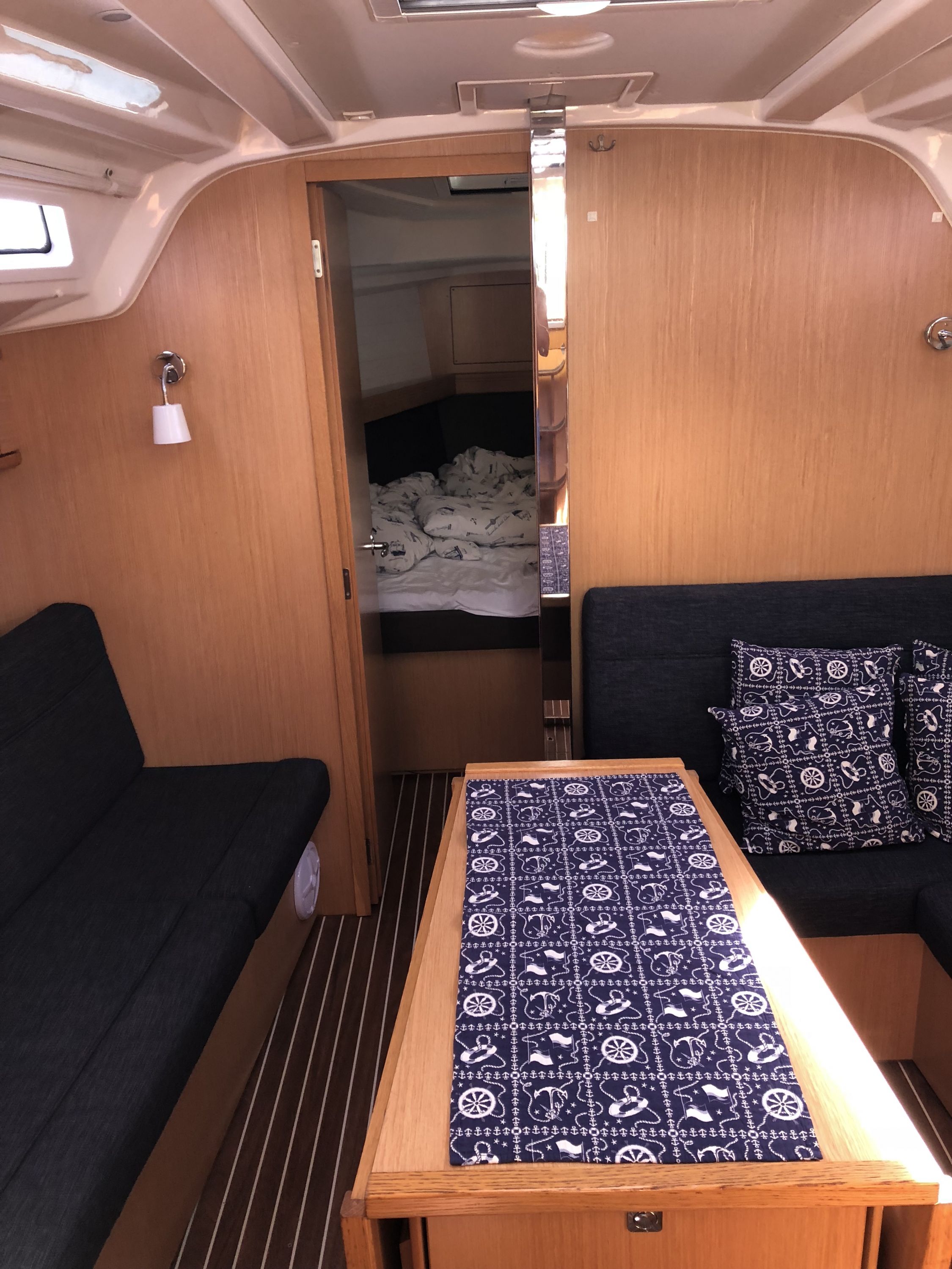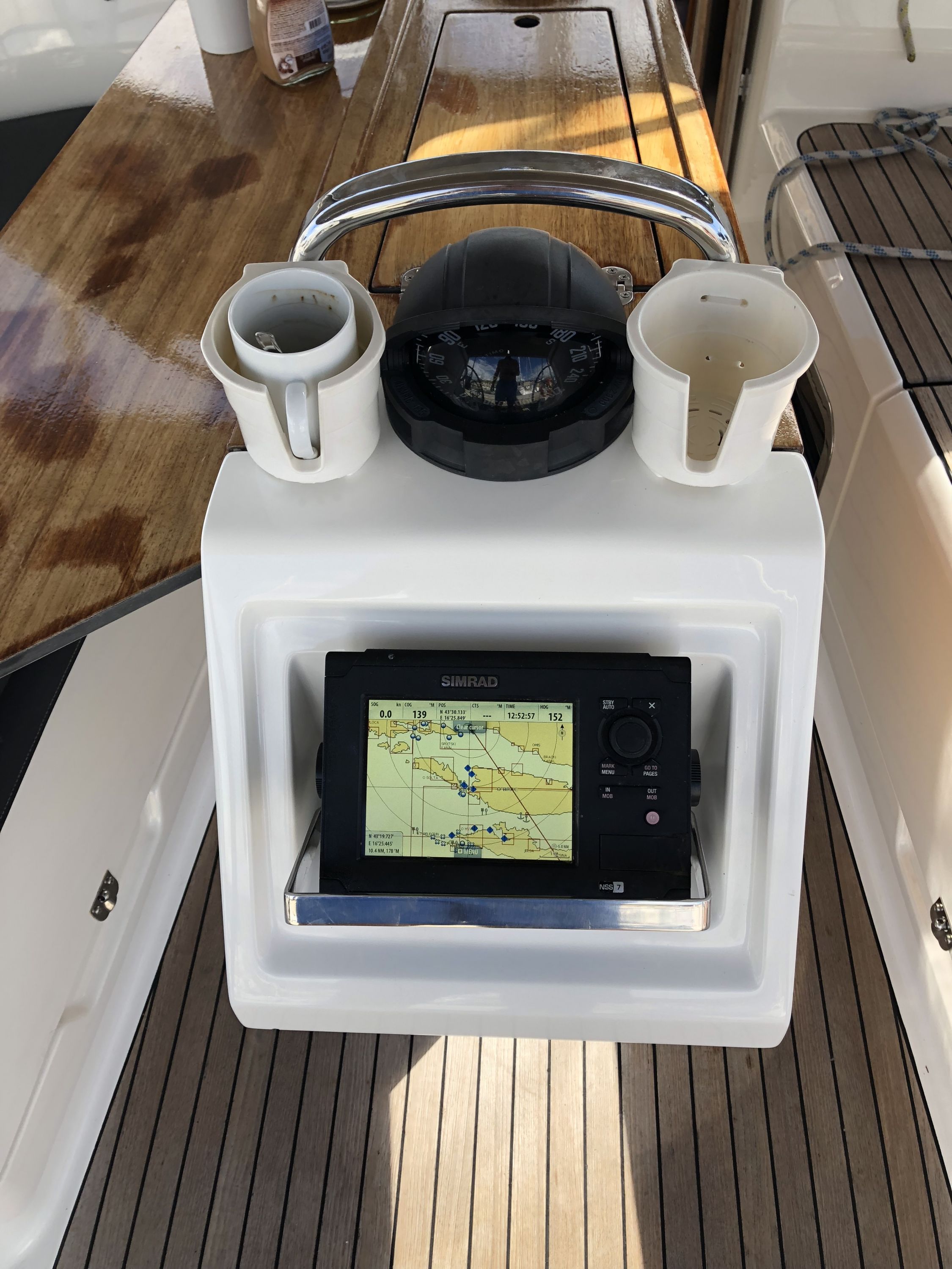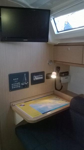 | Navigation | Barometer, Echolot, Fernglas, GPS mit Kartenplotter im Cockpit, Hafenhandbücher, Handpeilkompass, Kompass, Navigationsbesteck, Seekarten, Sumlog, Windmesser |