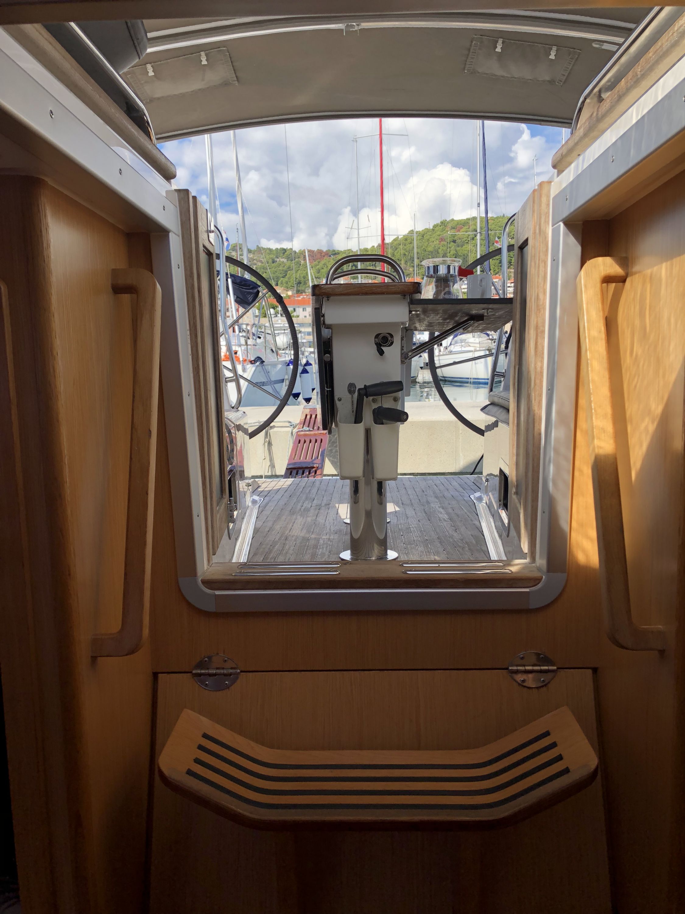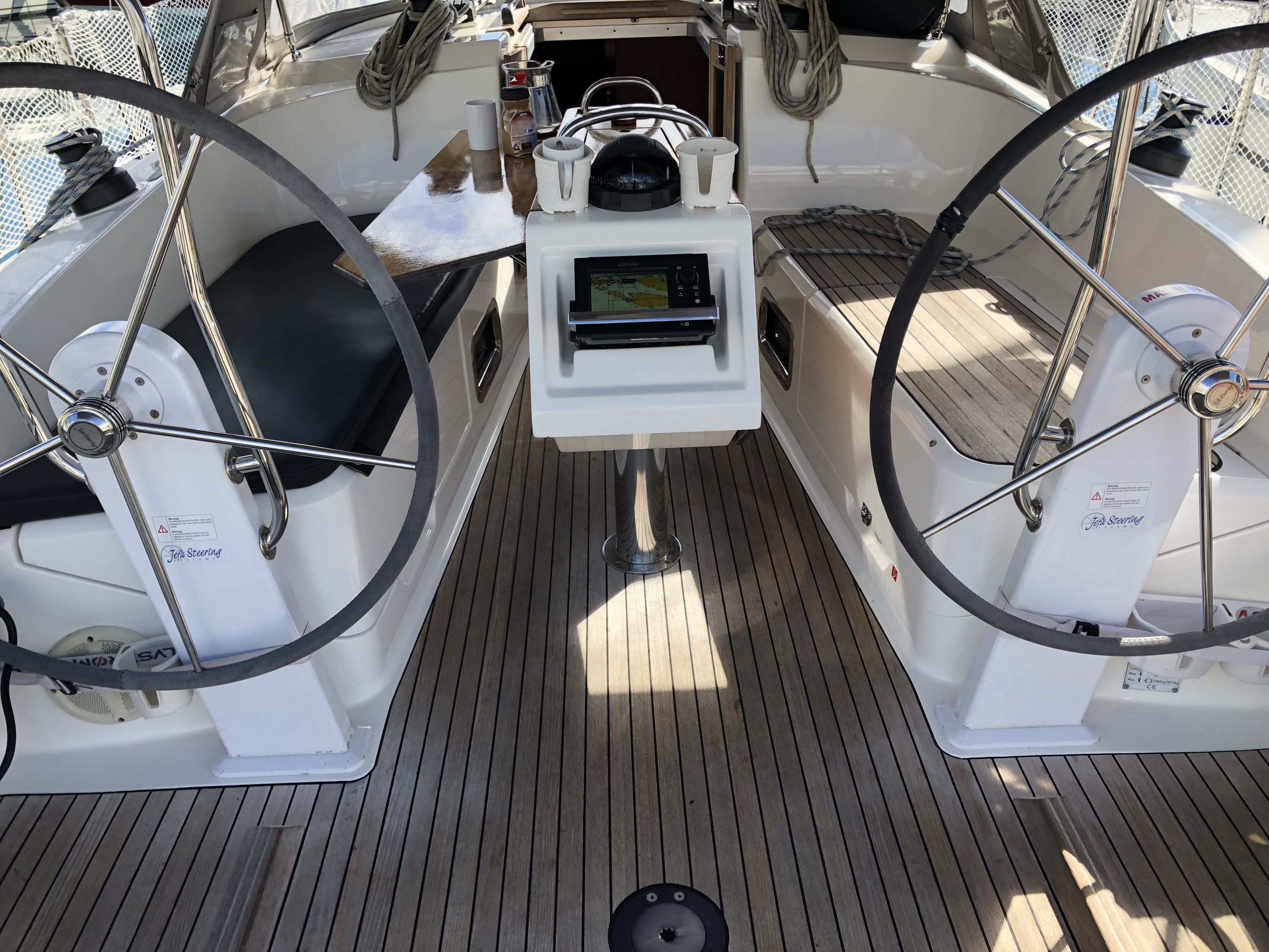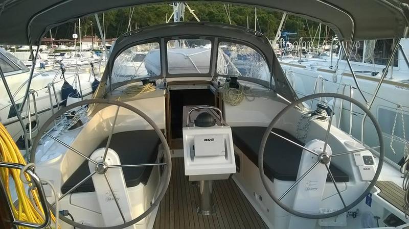 | Outside | 220 V-Landanschluss, Badeleiter, Badeplattform, Biminitop, Bootshaken, Cockpitdusche, Cockpitlautsprecher, Cockpitpolster, Cockpittisch, Delta-Anker, Dieselkanister , elektr. Ankerwinsch, Fender, Festmacherleinen, Gangway, Kunststoff-Eimer (Pütz), Solaranlage (teilw.), Sprayhood, Teak im Cockpit, Wasserschlauch, Winschen |