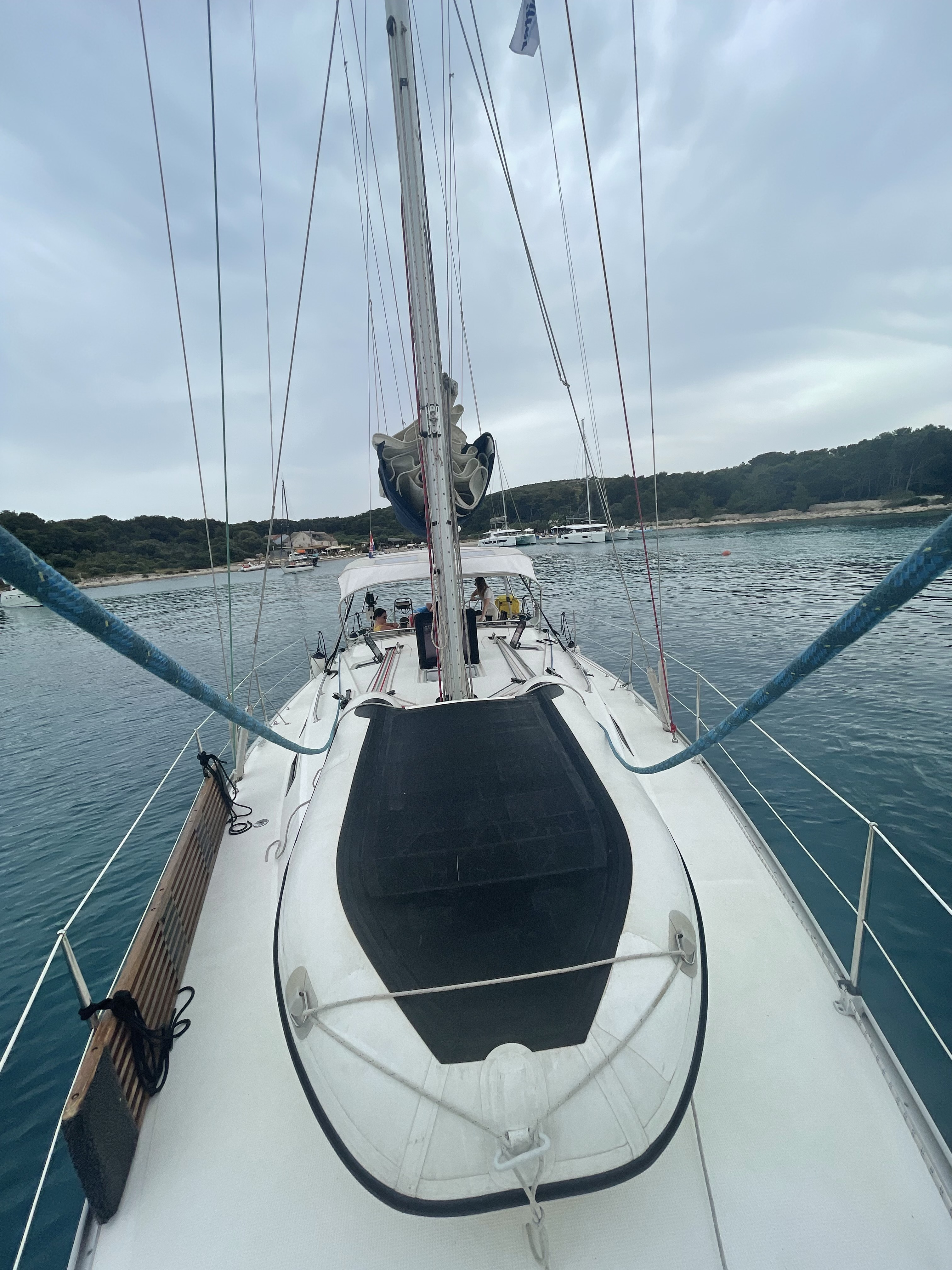 | Outside | 220 V-Landanschluss, Anker mit Kette, Badeplattform, Biminitop, Bootshaken, Cockpitdusche, Cockpitlautsprecher, Cockpitpolster, Cockpittisch, Cockpitverdeck, Davits, Dieselkanister , elektr. Ankerwinsch, Faltpropeller, Fender, Festmacherleinen, Gangway, Kugelfender, Kunststoff-Eimer (Pütz), Sprayhood, Teak im Cockpit, Teakdeck, Wasserkanister , Wasserschlauch, Windex |