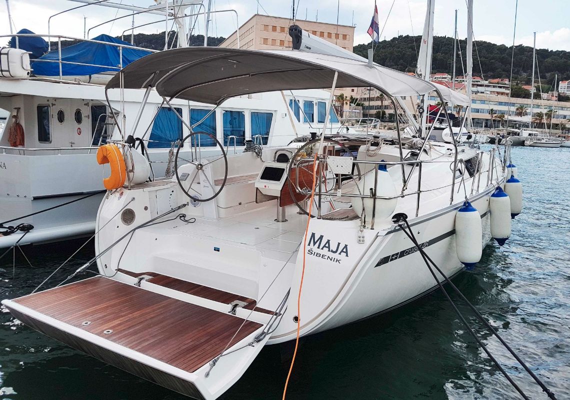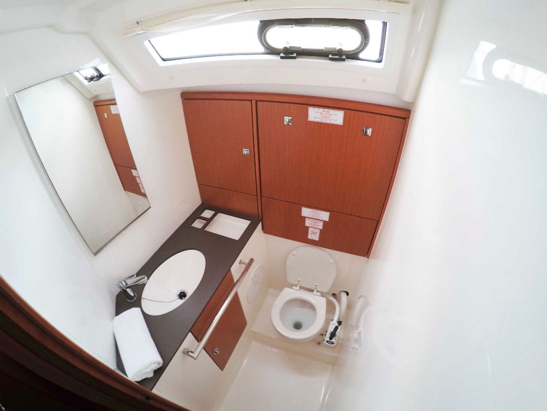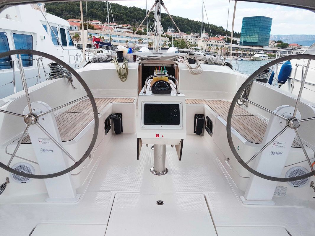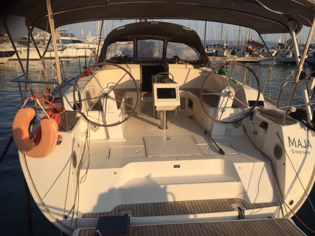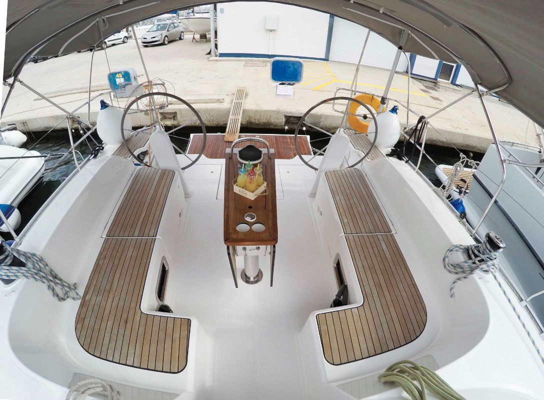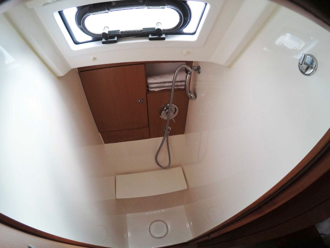 | Outside | 220 V-Landanschluss, Anker mit Kette, Badeplattform (hydr.), Biminitop, Bootshaken, Cockpitdusche, Cockpitlautsprecher, Cockpittisch, elektr. Ankerwinsch, Fender, Festmacherleinen, Gangway, Sprayhood, Windex |