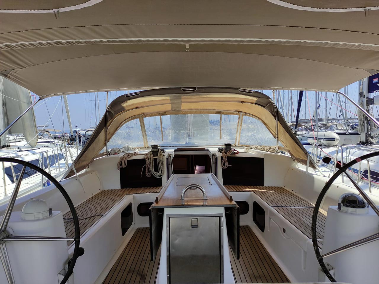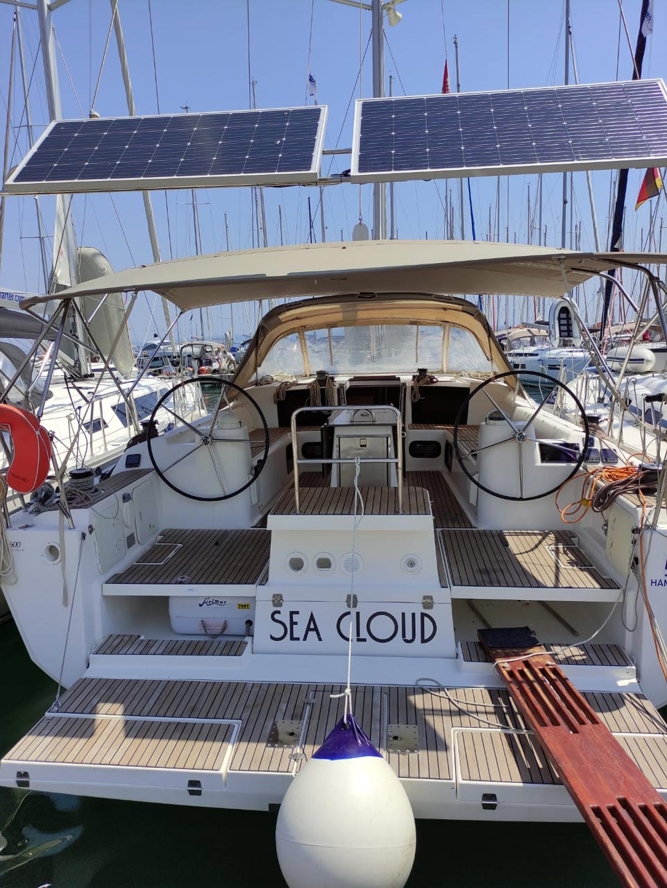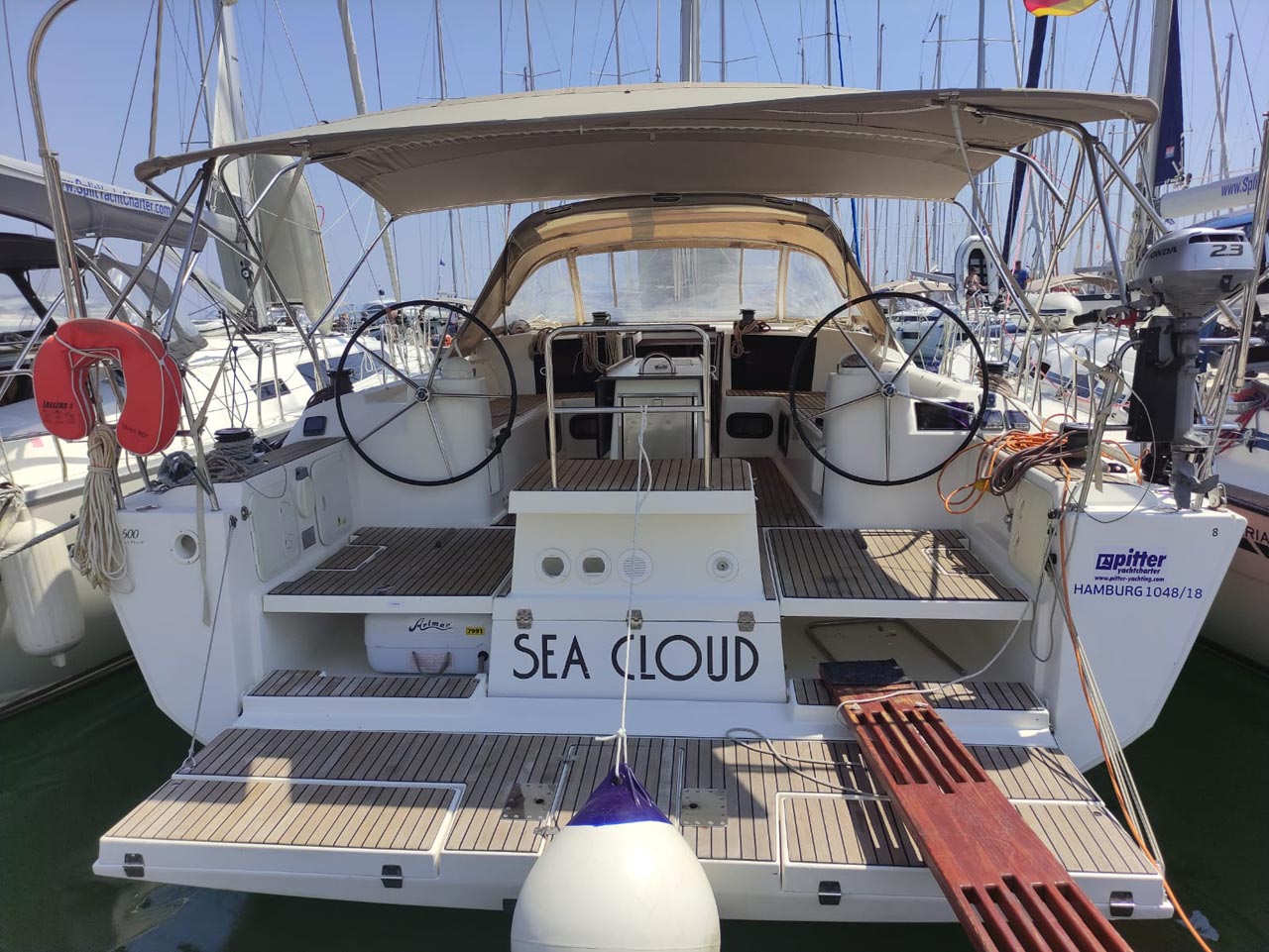 | Outside | 220 V-Landanschluss, Anker mit Kette, Ankerwinsch, Badeplattform, Biminitop, Bootshaken, Cockpitdusche, Cockpitkühlschrank, Cockpitlautsprecher, Cockpitpolster, Cockpittisch, Dieselkanister , elektr. Ankerwinsch, Fender, Festmacherleinen, Gangway, Kugelfender, Kunststoff-Eimer (Pütz), Sprayhood, Teak im Cockpit, Wantenschneider, Wasserkanister , Wasserschlauch, Windex |