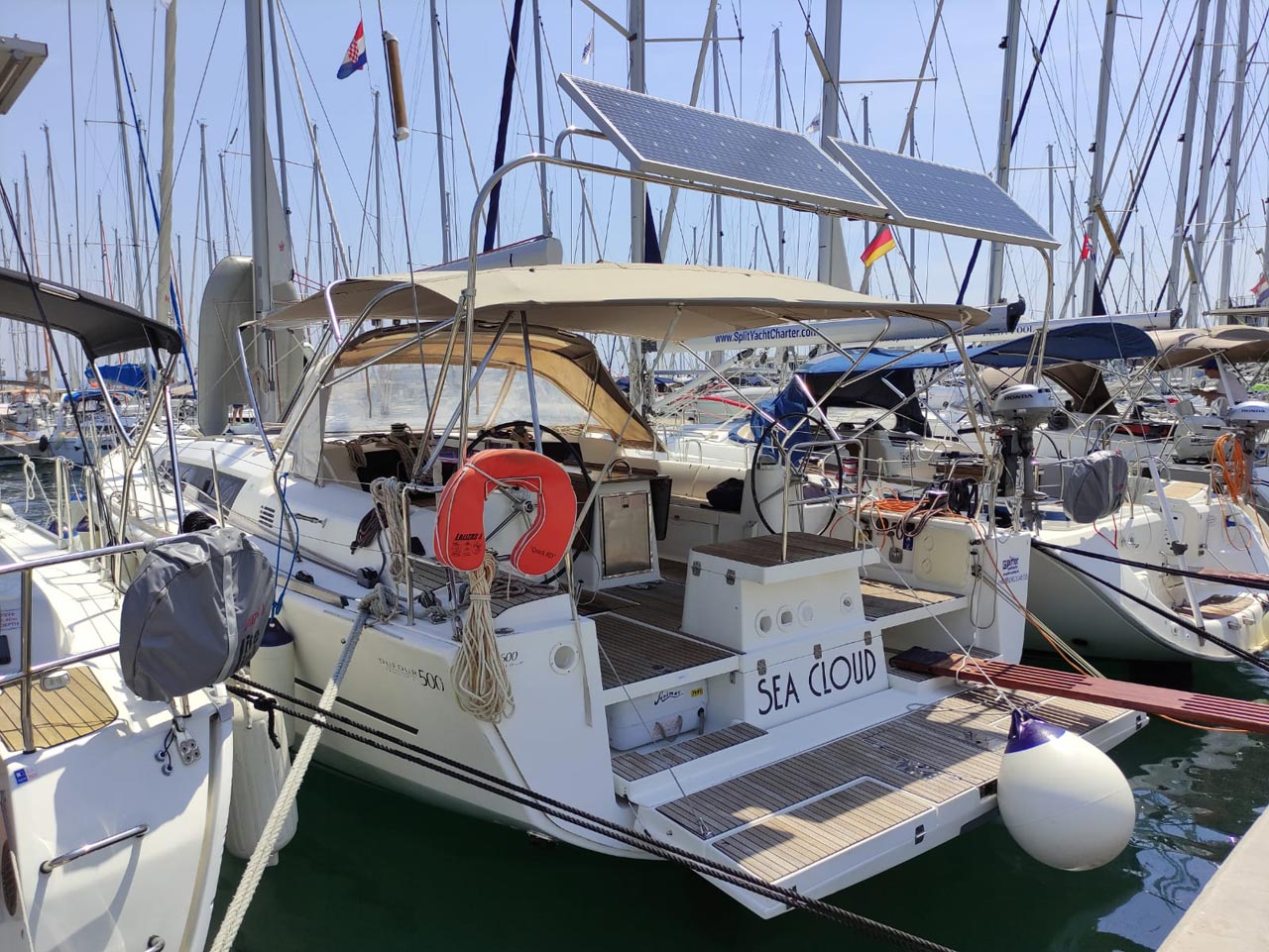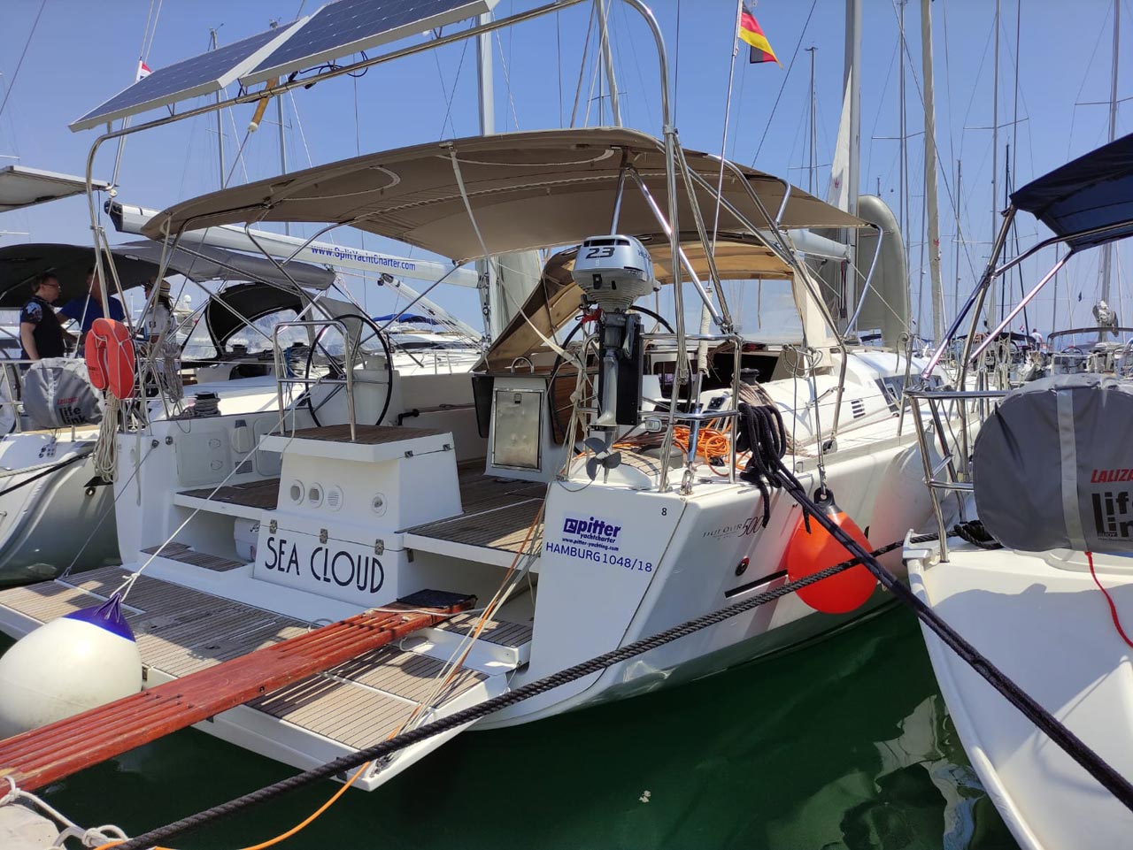 | Safety | Autopilot, Blitzboje, Bootsmannstuhl, Bordapotheke, Bordwerkzeug, Bugstrahlruder, Epirb, Feststoffschwimmwesten, Feuerlöscher, Lifebelts, Motor-Ersatzteile, Nebelhorn, Notsignale, Radarreflektor, Reparaturset für Beiboot, Rettungsinsel, Suchscheinwerfer, Taschenlampe, UKW-Funk, Zweitanker |