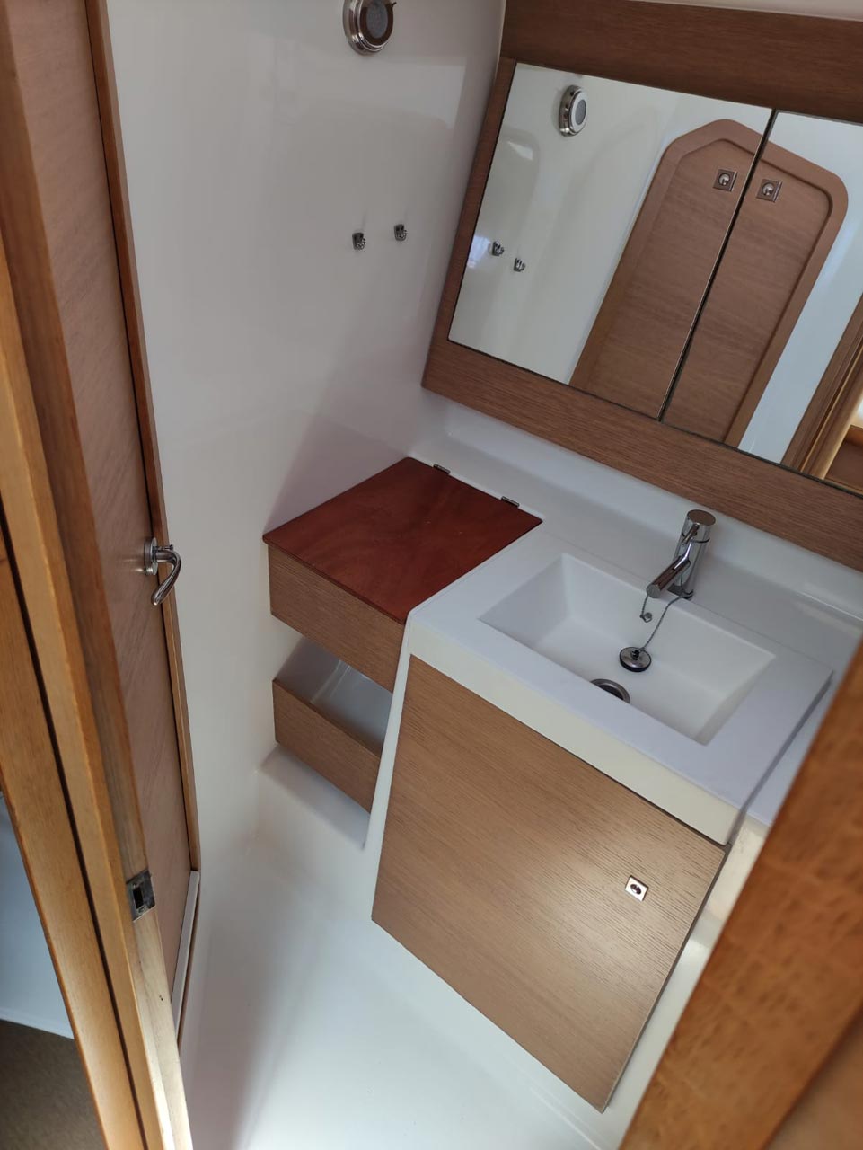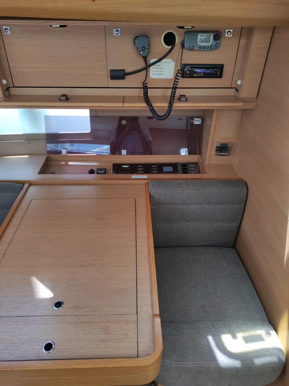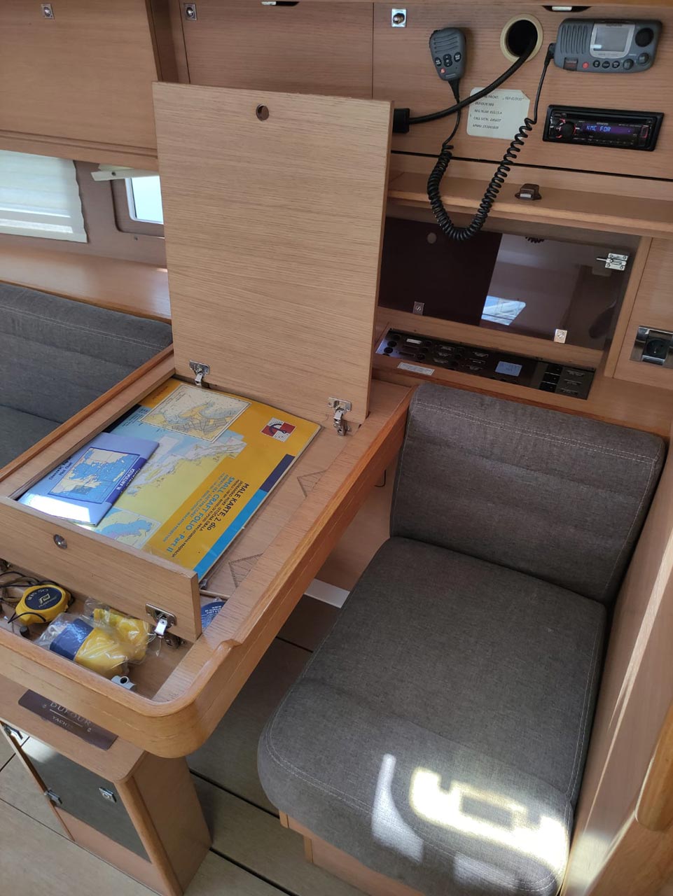 | Navigation | Barometer, Fernglas, GPS mit Kartenplotter im Cockpit, Hafenhandbücher, Handpeilkompass, Navigationsbesteck, Radar, Seekarten, Tridata (Log, Echolot, Windm.) |